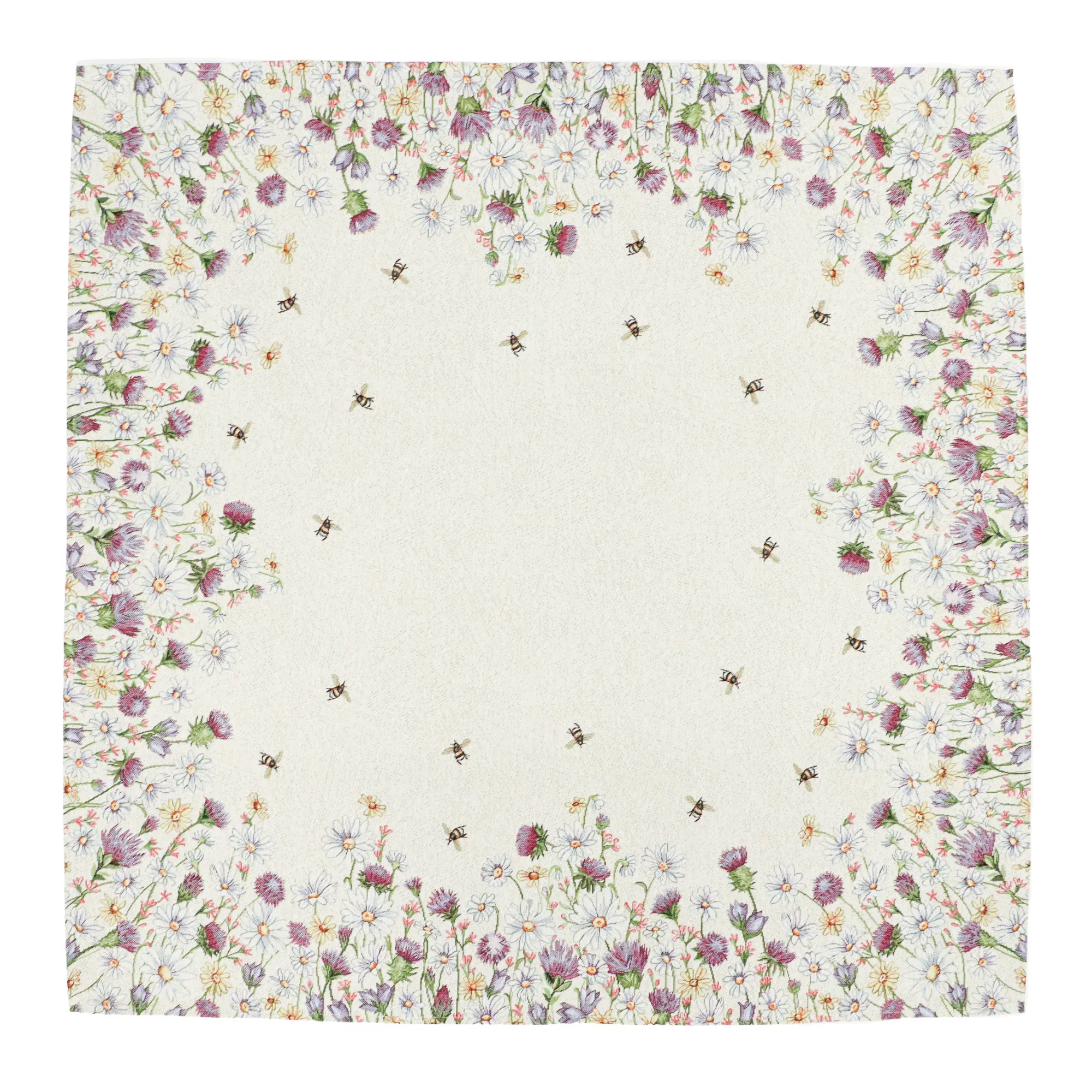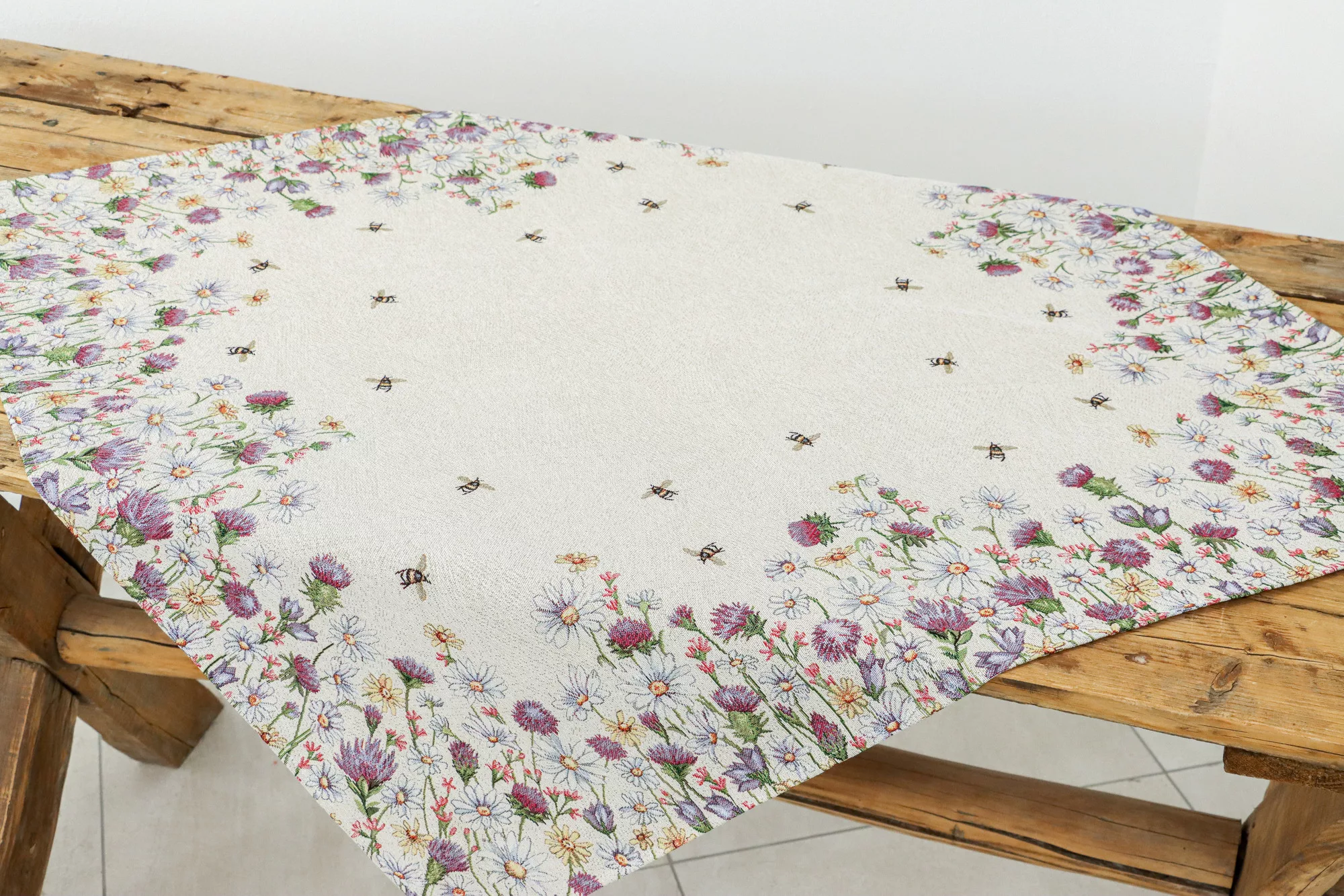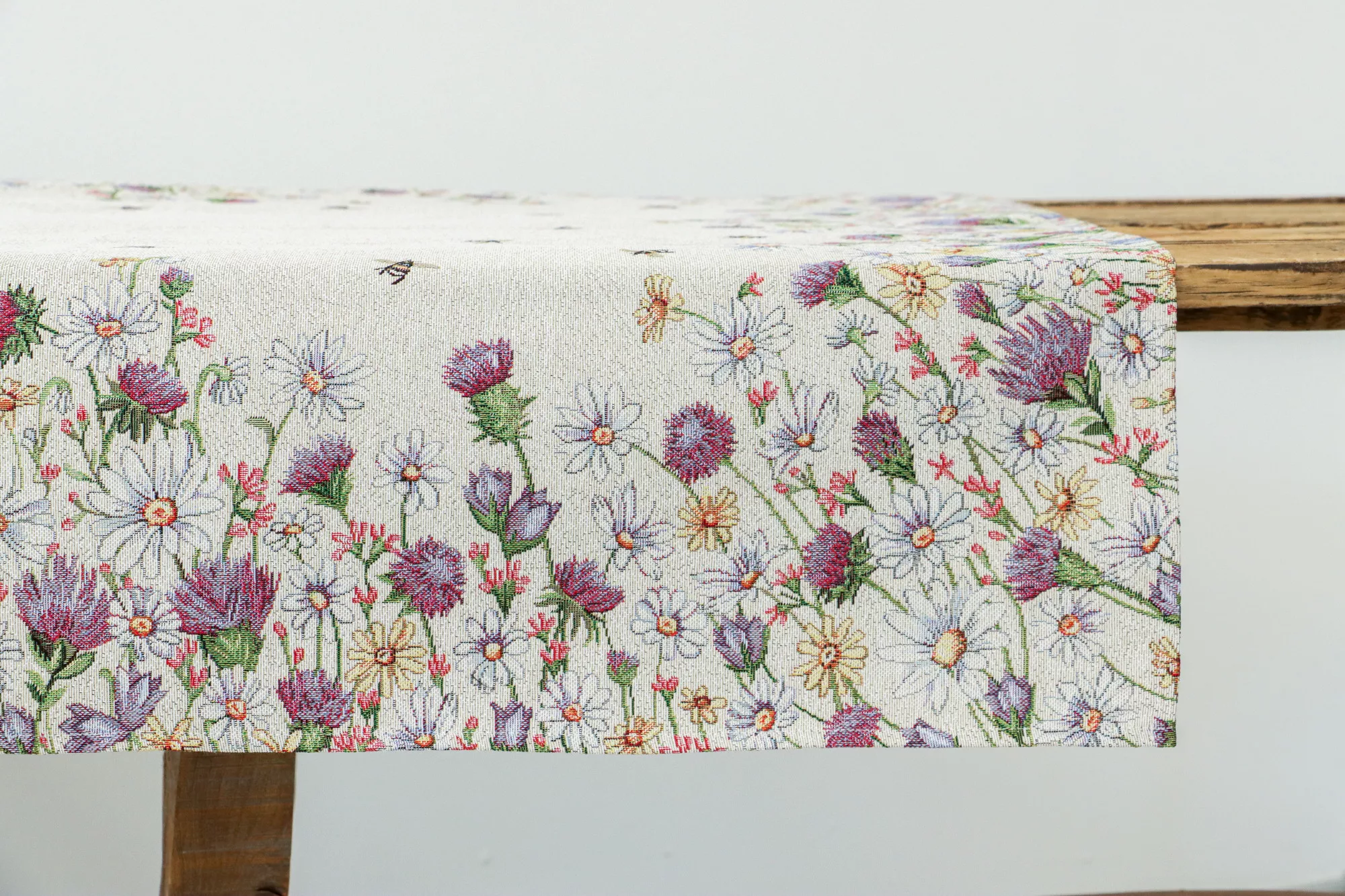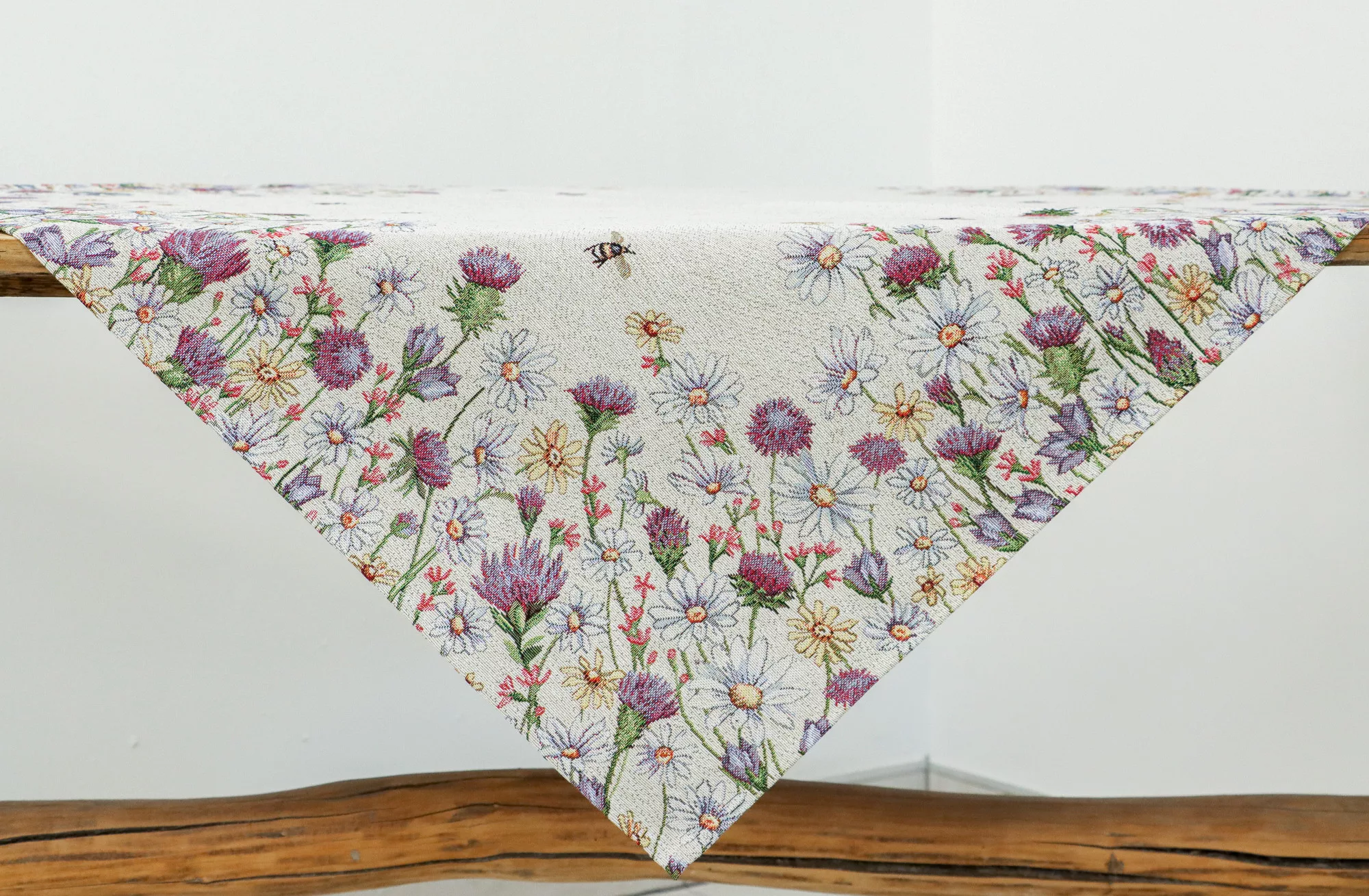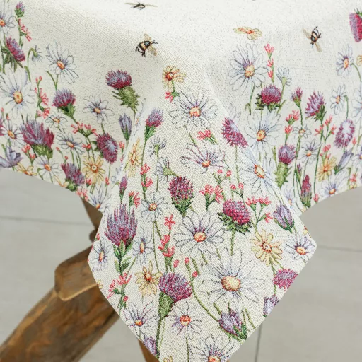 Töltsd meg otthonod a természet bájával ezzel a gépi szövésű gobelin asztalterítővel! A virágzó rét hangulatát idéző, részletgazdag vadvirágok és játékosan röpködő méhecskék elevenítik meg a tavaszi mező érzését. Az élénk színek és a finoman texturált anyag egyaránt eleganciát és vidámságot visznek az étkezőasztalra.