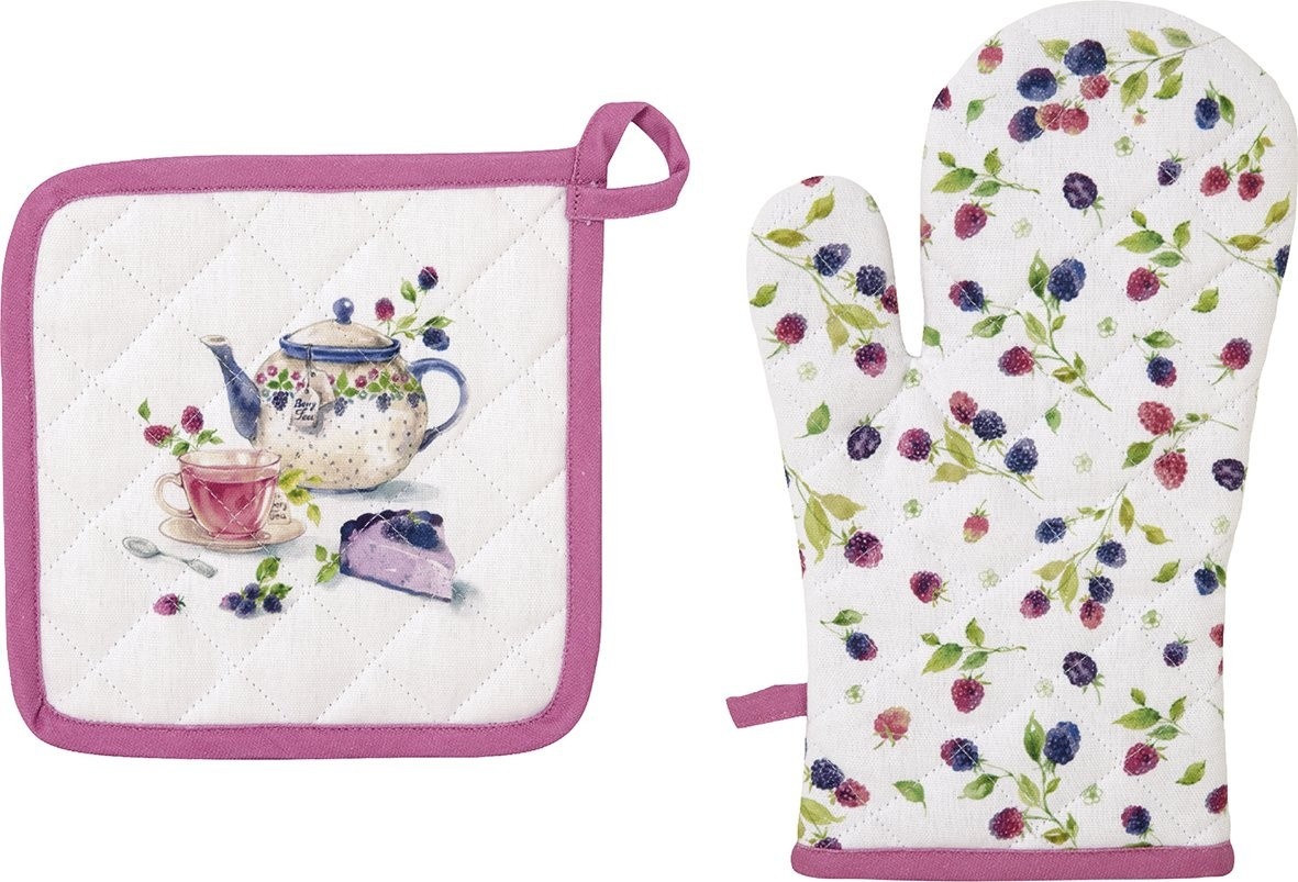 Áfonya és süti mintás konyhai kesztyű és edényfogó szett, amely hasznos kiegészítő minden háziasszony konyhájában. Segítségével biztonságosan megfoghatjuk az edényeket, serpenyőket és tepsiket.