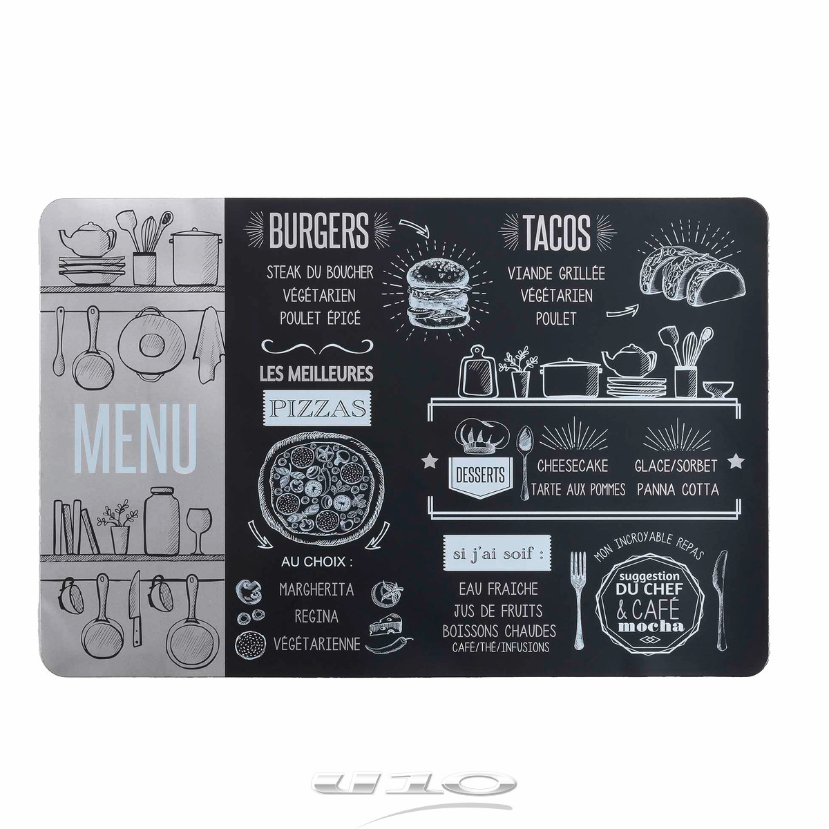 Bisztró hangulatot idéző, vastagabb anyagból készült gumi tényéralátét fekete és ezüst színben. Az alátét nem csupán stílusosan mutat az asztalokon, de meg is védi a felületet a karcolásoktól, a terítőt pedig a gyakori mosásoktól.