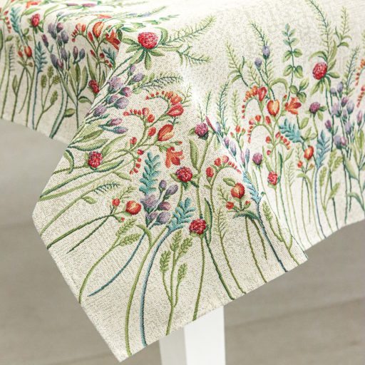 Különféle virágokkal díszített asztalterítő, melynek egyedülálló szépsége minden tekintetet az asztalra vonz. Megfelelő kezelés mellett ez a terítő évekig megőrzi színét és minőségét.