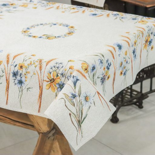 Búzavirágokkal és kék mezei virágokkal dekorált gépi gobelin asztalterítő, amely a megfelelő kezelés mellett hosszú éveken át megőrzi színét és minőségét.