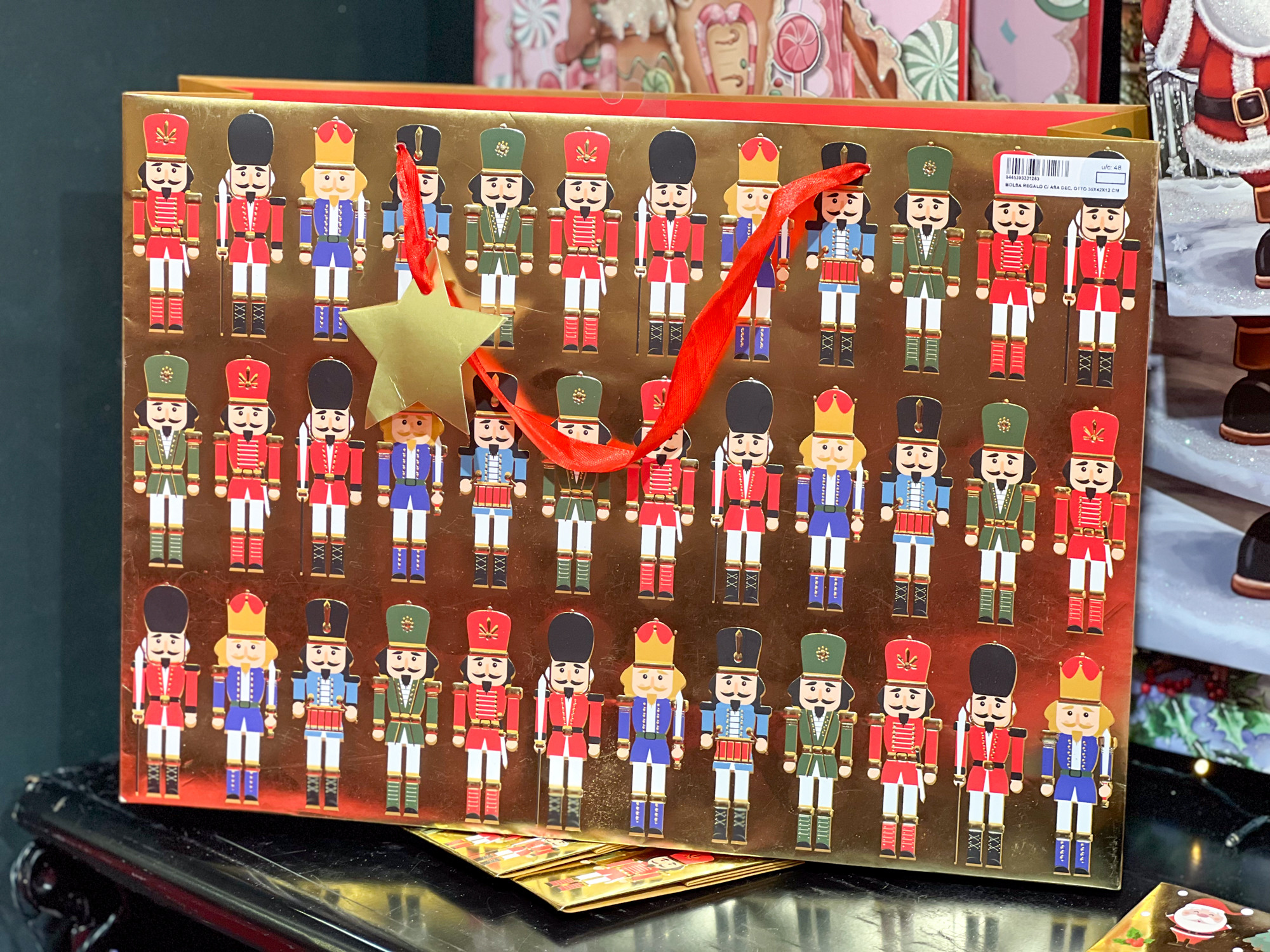 Masszív ajándéktasak, diótörőkkel dekorálva, arany színben.