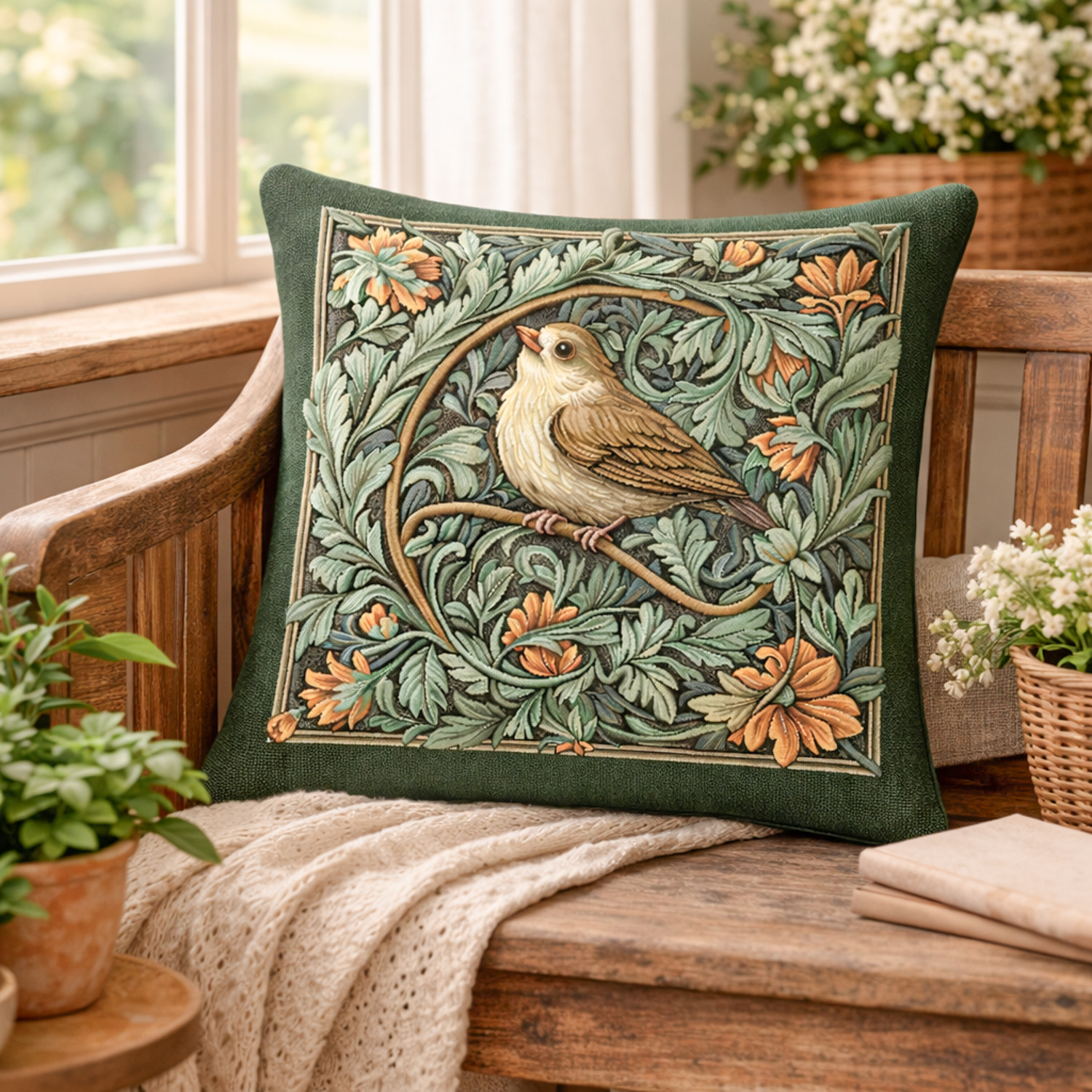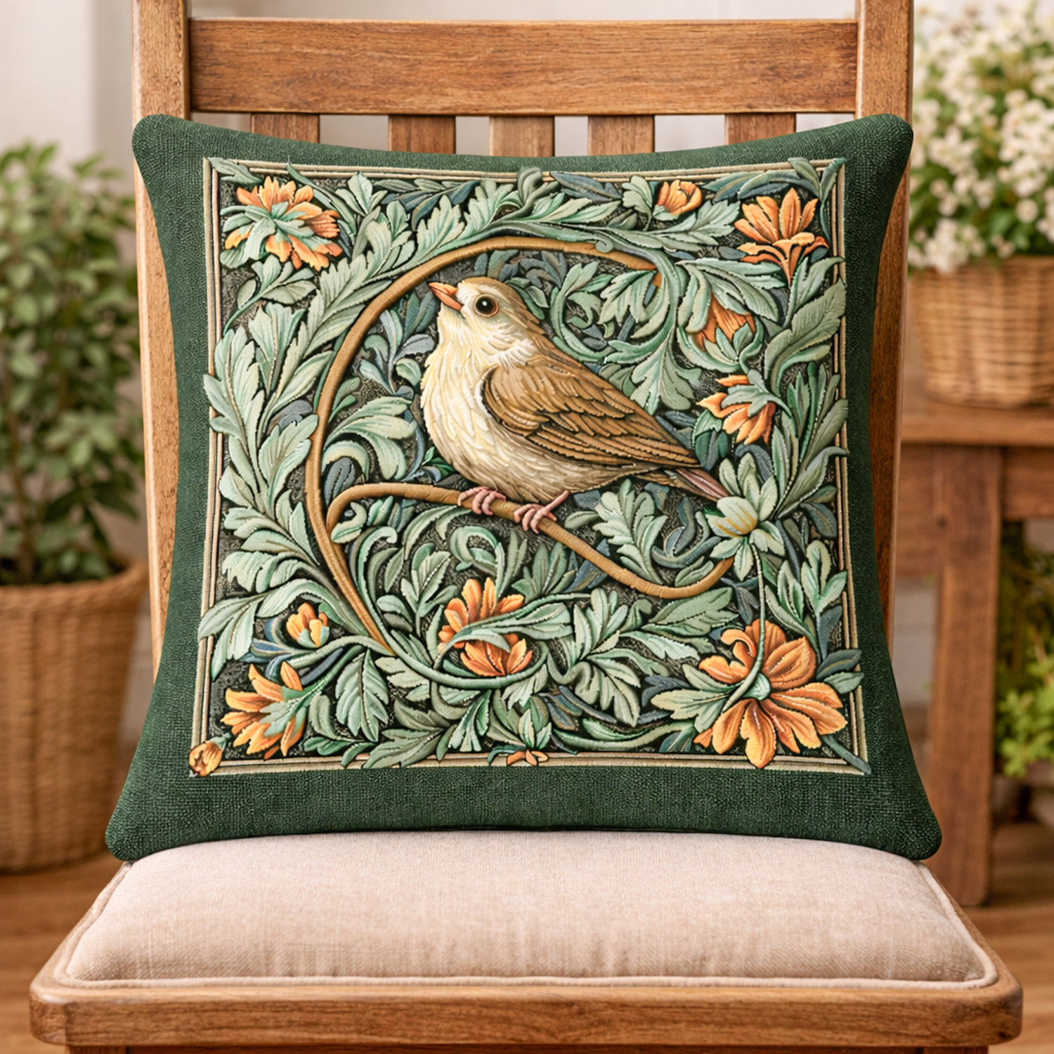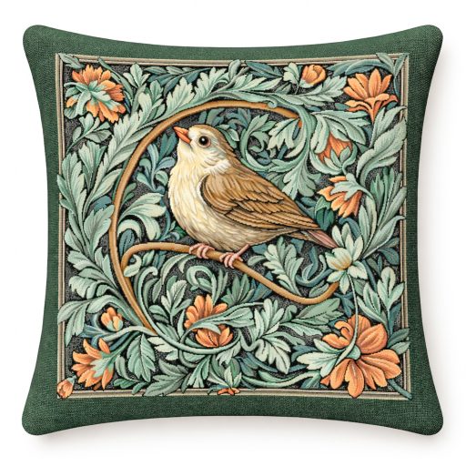 Elegáns gépi szövésű gobelin díszpárna huzat finoman kidolgozott madármotívummal és gazdag növényi mintával. A természet ihlette design meleg, otthonos hangulatot teremt a nappaliban vagy a hálószobában. A részletgazdag mintán egy finom rajzolatú erdei madár jelenik meg sűrű, zöld lomb között, meleg földszínekkel és elegáns keretezéssel.