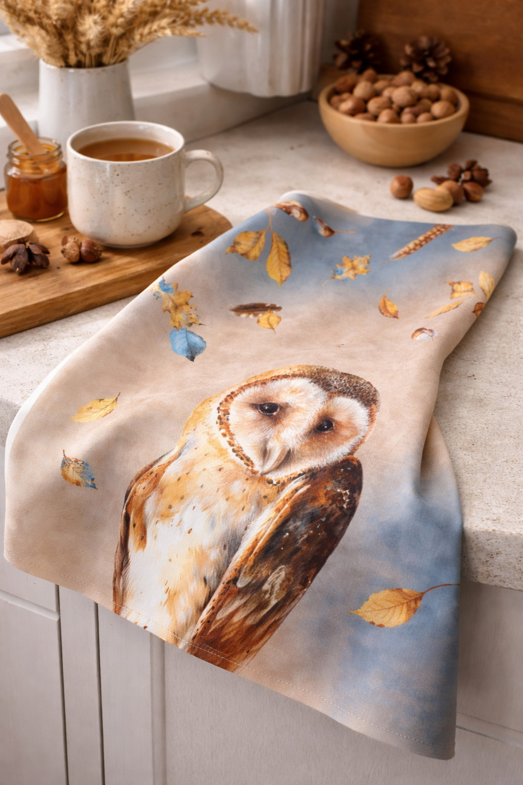 Őszi hangulatú konyharuha gyönyörű bagoly mintával, 100% pamut, első osztályú minőség. Mosógépben 40 fokon mosható, vasalható.