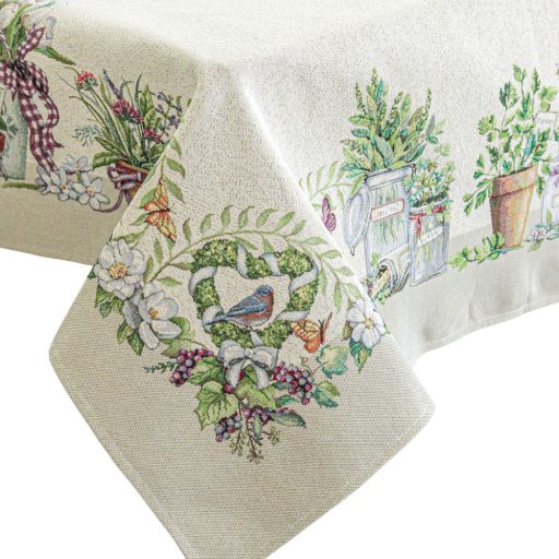 Növényekkel, pillangókkal dekorált gépi gobelin asztalterítő, amely a megfelelő kezelés mellett hosszú éveken át megőrzi színét és minőségét.