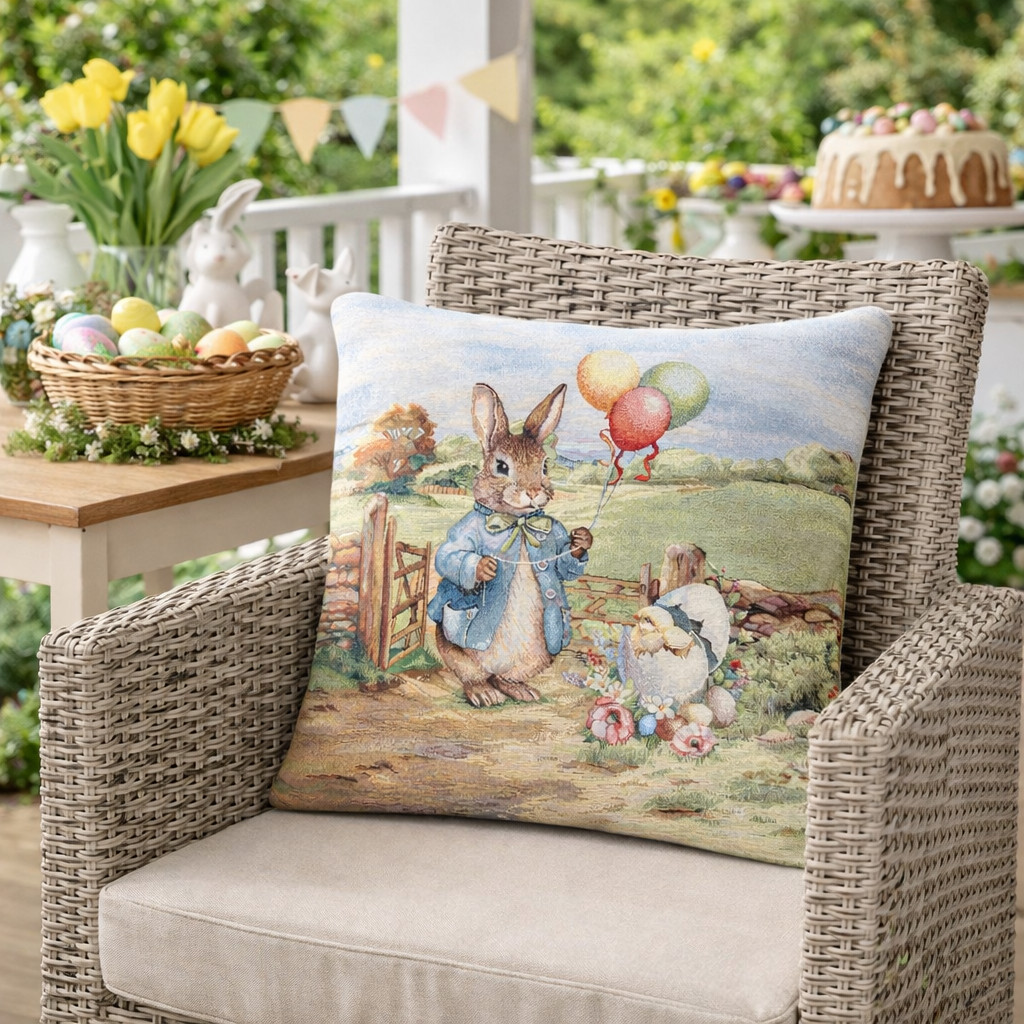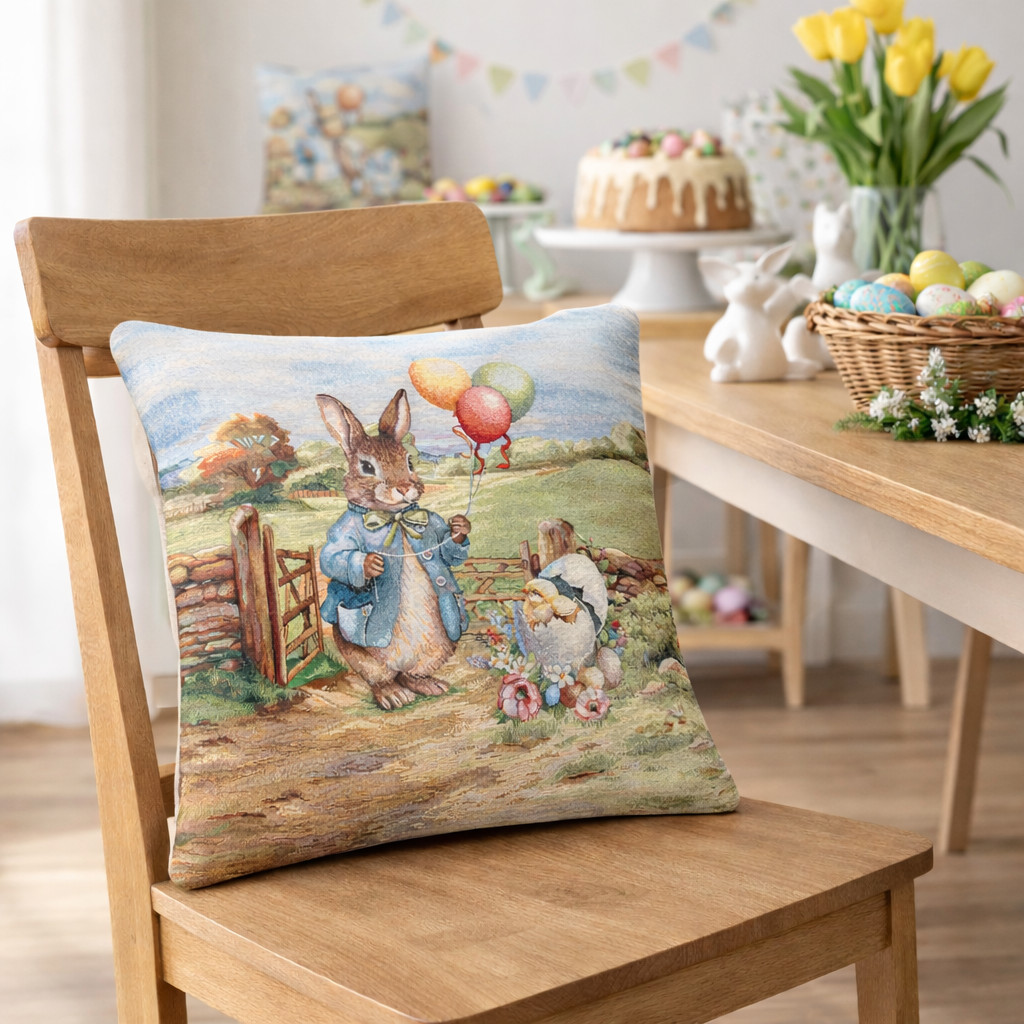 Ez a különleges spanyol gobelin párnahuzat a klasszikus gobelin megjelenést ötvözi a modern, precíz gépi szövési technológiával. A részletgazdag minta egy kedves húsvéti jelenetet ábrázol: lufikat tartó nyuszit, kiscsibét, virágokat és egy vidéki tájat, amely meleg, nosztalgikus és ünnepi hangulatot kölcsönöz az enteriőrnek.