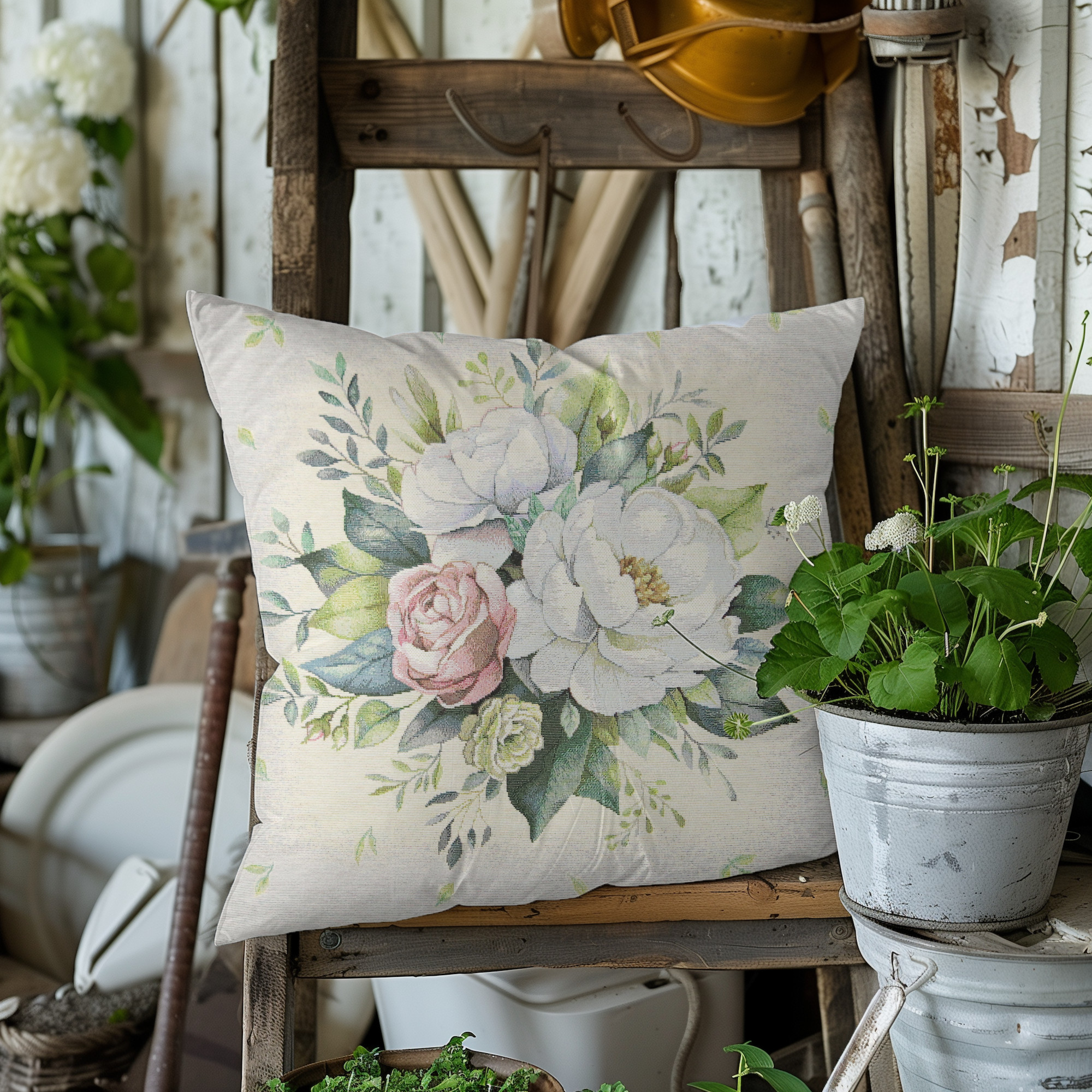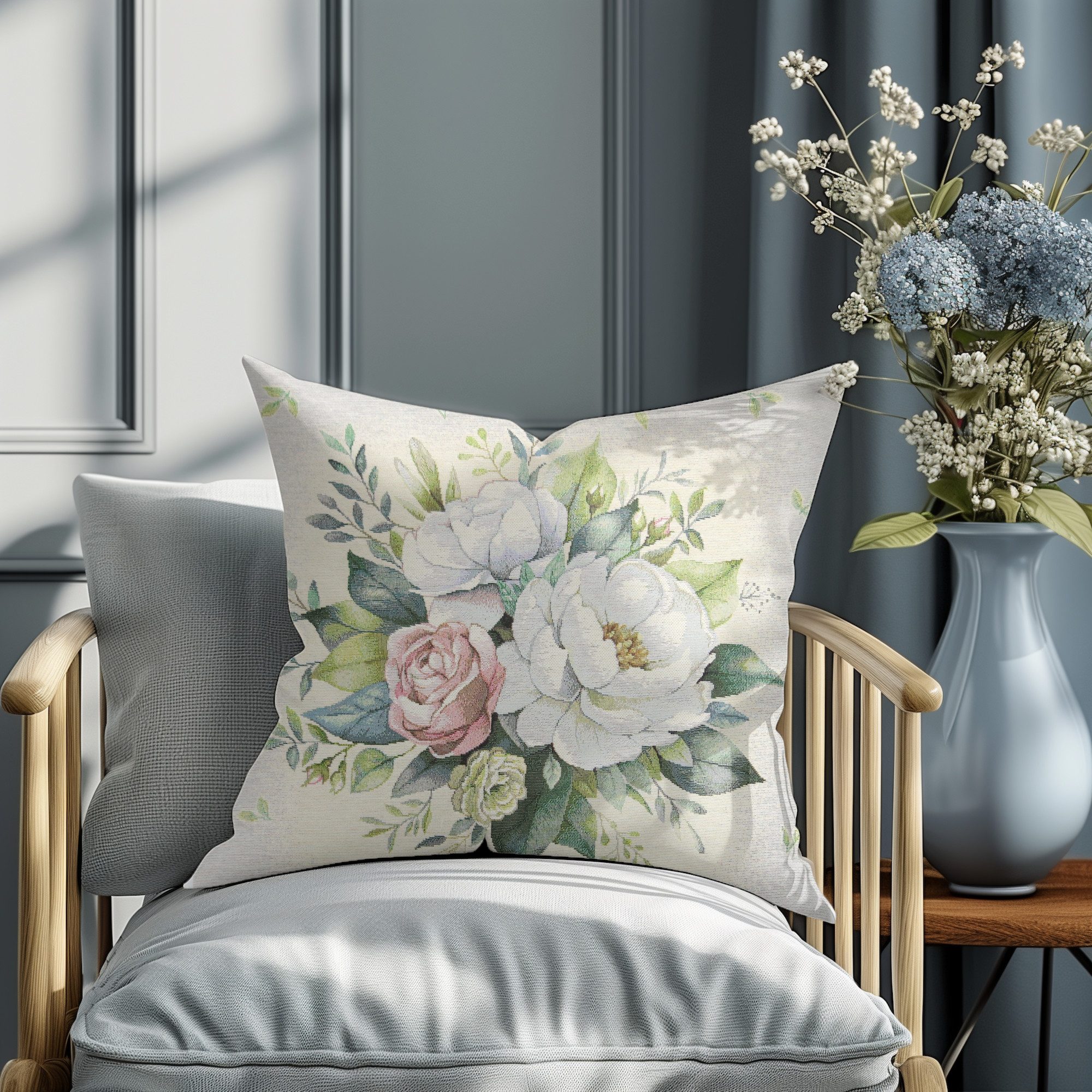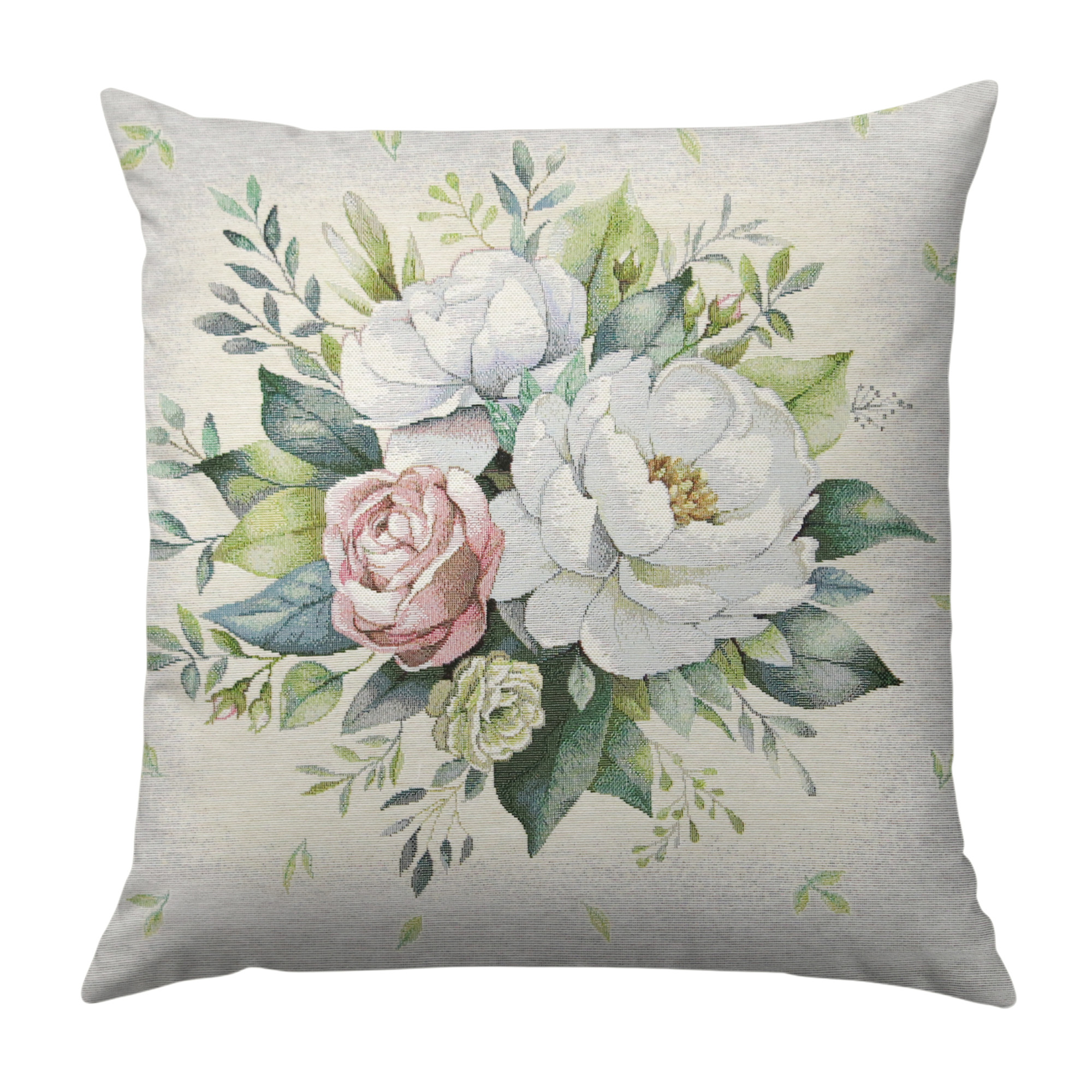 Varázsold otthonod romantikus hangulatú oázissá ezzel a gyönyörű, gépi szövésű gobelin párnahuzattal! A finom rózsaszín és fehér virágokból álló csokor lágy zöld levelekkel körülölelve tökéletes harmóniát sugároz. A természetközeli mintázat és a pasztell árnyalatok kifinomult megjelenést kölcsönöznek bármely helyiségnek – legyen szó a nappaliról, a hálószobáról vagy egy elegáns vendégszobáról.