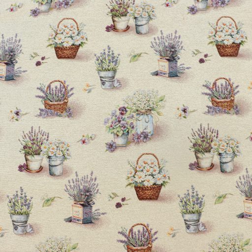 Flower shop levendulákkal dekorált gépi gobelin szövet. Anyagösszetétel: 68% poliészter, 32% pamut. Súlya 410 gramm/négyzetméter. Minimális rendelés: 5 méter