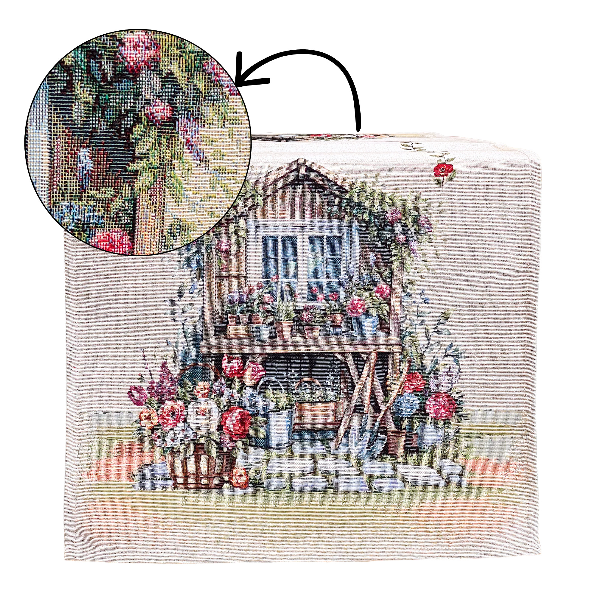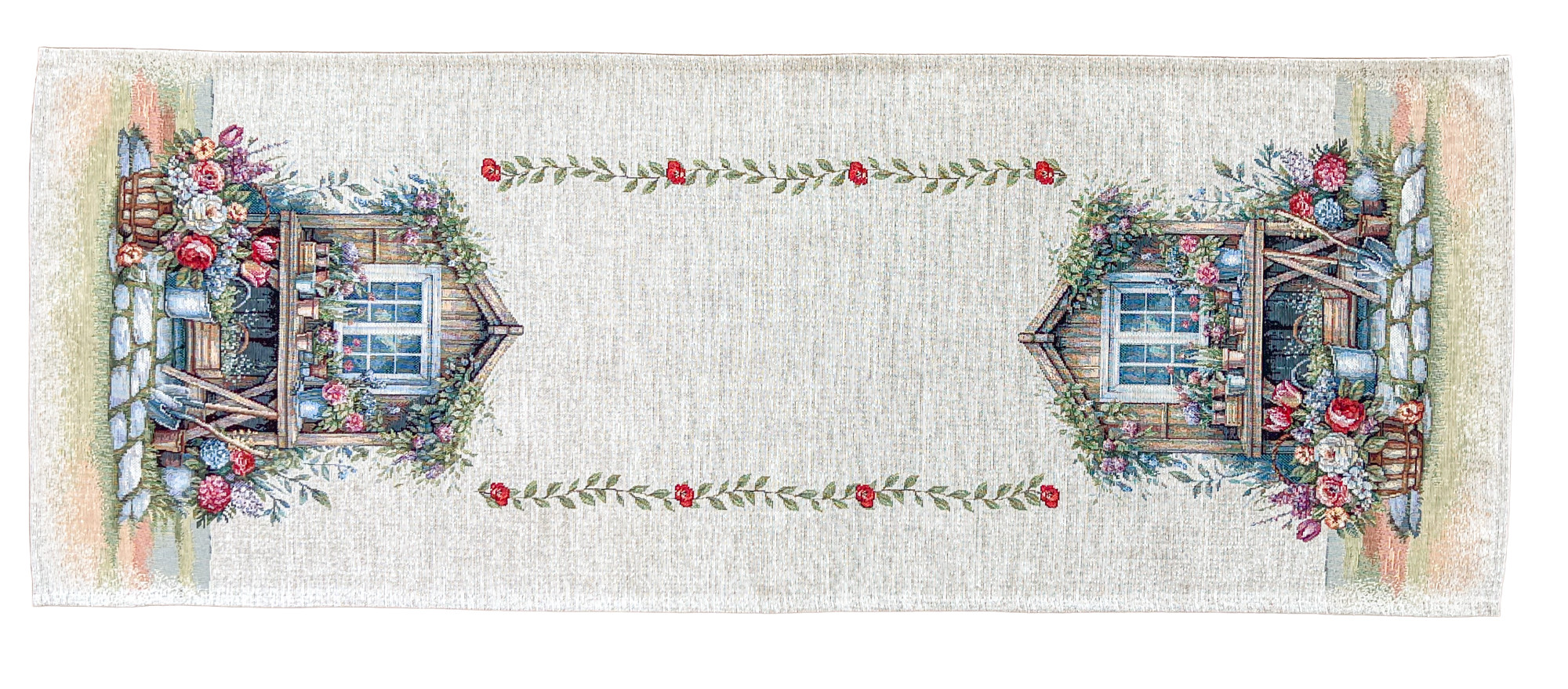 Dobd fel otthonod hangulatát ezzel a különleges gépi gobelin asztali futóval, amely egy romantikus, virágos kerti jelenetet ábrázol. A részletgazdag minta és a természetes színvilág tökéletes választás, ha vidéki stílusú dekorációt, rusztikus lakberendezést vagy vintage hangulatot szeretnél kialakítani.