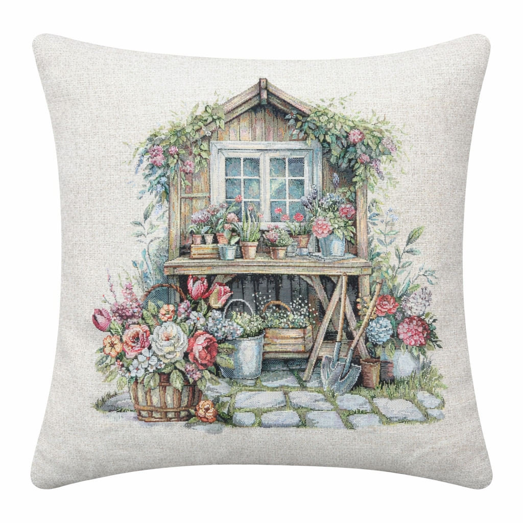 Gépi szövésű spanyol gobelin párnahuzat – virágos kertesház, romantikus kerti design