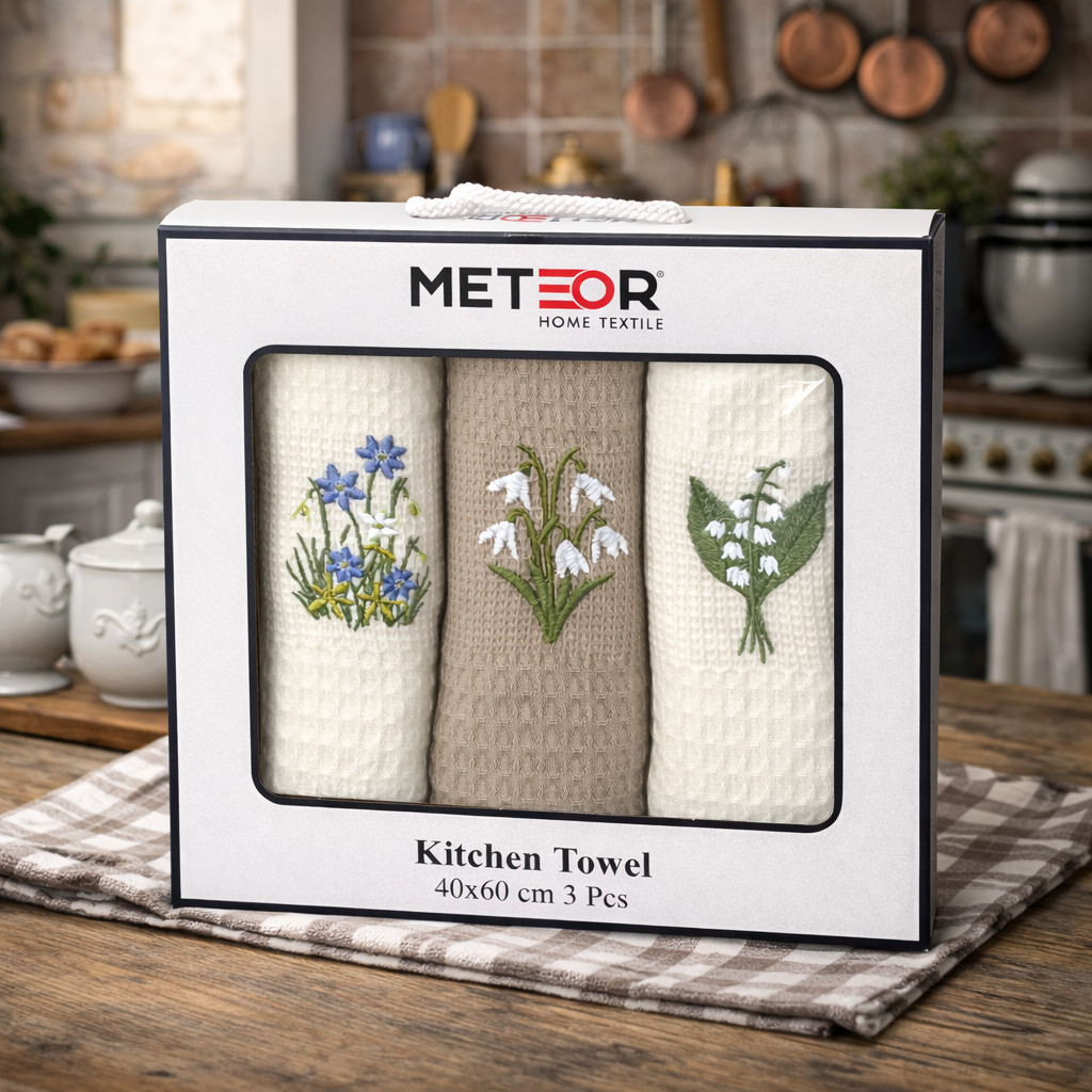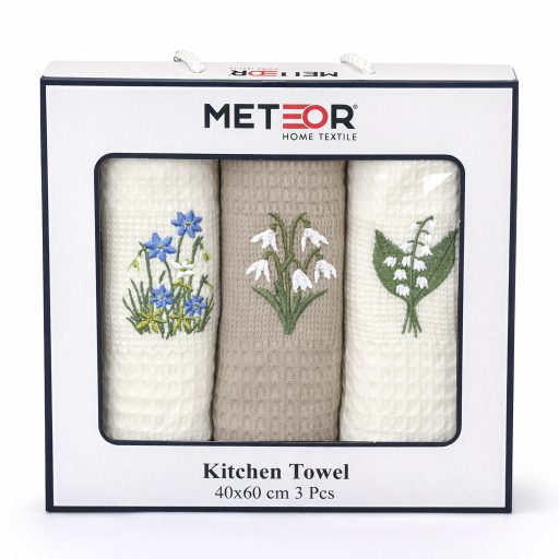 A díszdobozos szett 3 db egyforma méretű, gofri mintázatú, virágos konyharuhát tartalmaz. Tökéletes ajándék lehet minden alkalomra. Hétköznapi használatra is megfelelő, jó nedvszívó képességekkel rendelkező termék.