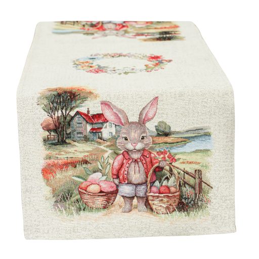 Varázsolj tavaszias hangulatot otthonodba ezzel a bájos húsvéti asztali futóval! A természet ihlette, gyönyörű színekben pompázó textília kedves nyuszifigurával és tavaszi virágokkal díszített. A részletgazdag minta és a nyuszis jelenet vintage stílust kölcsönöz az asztalnak.