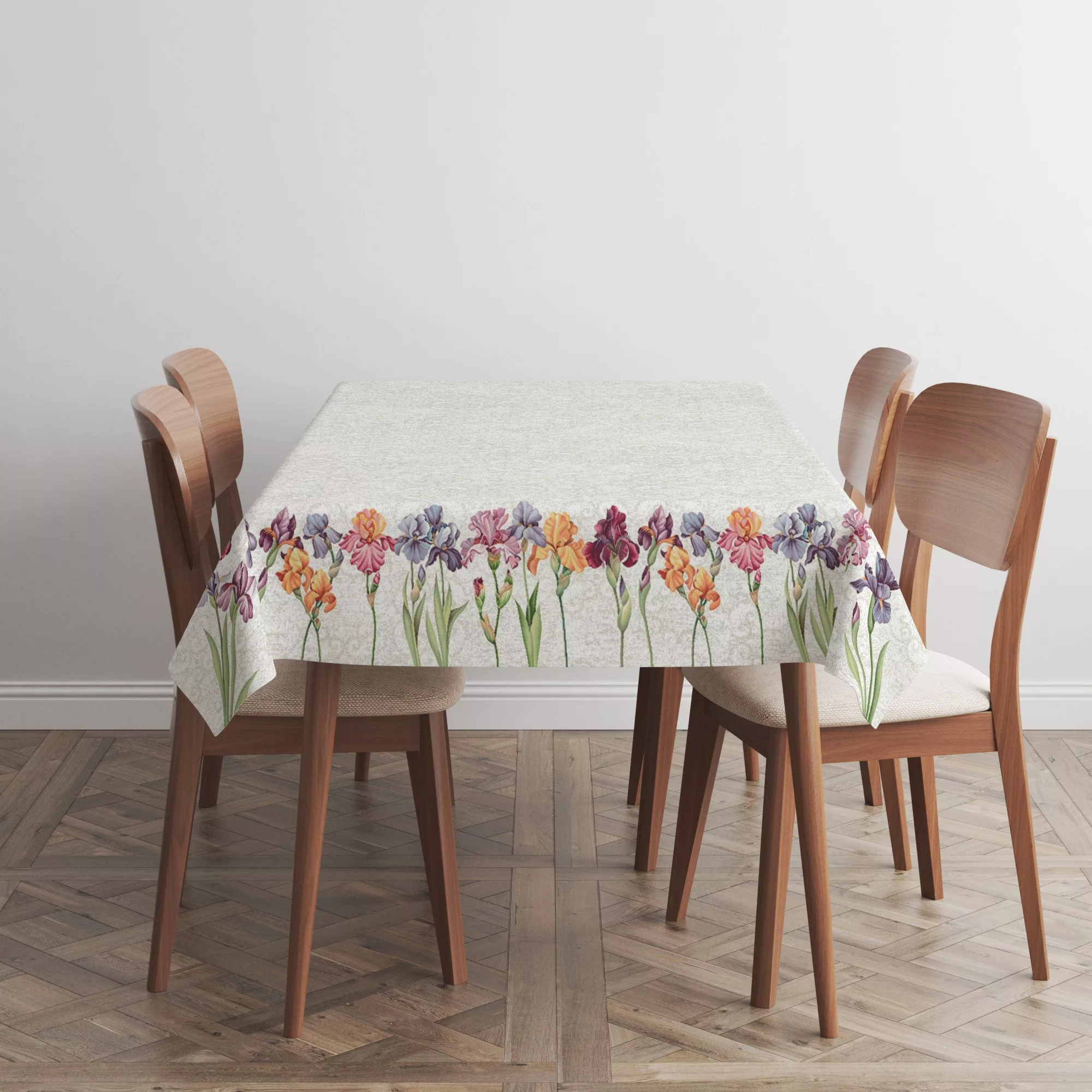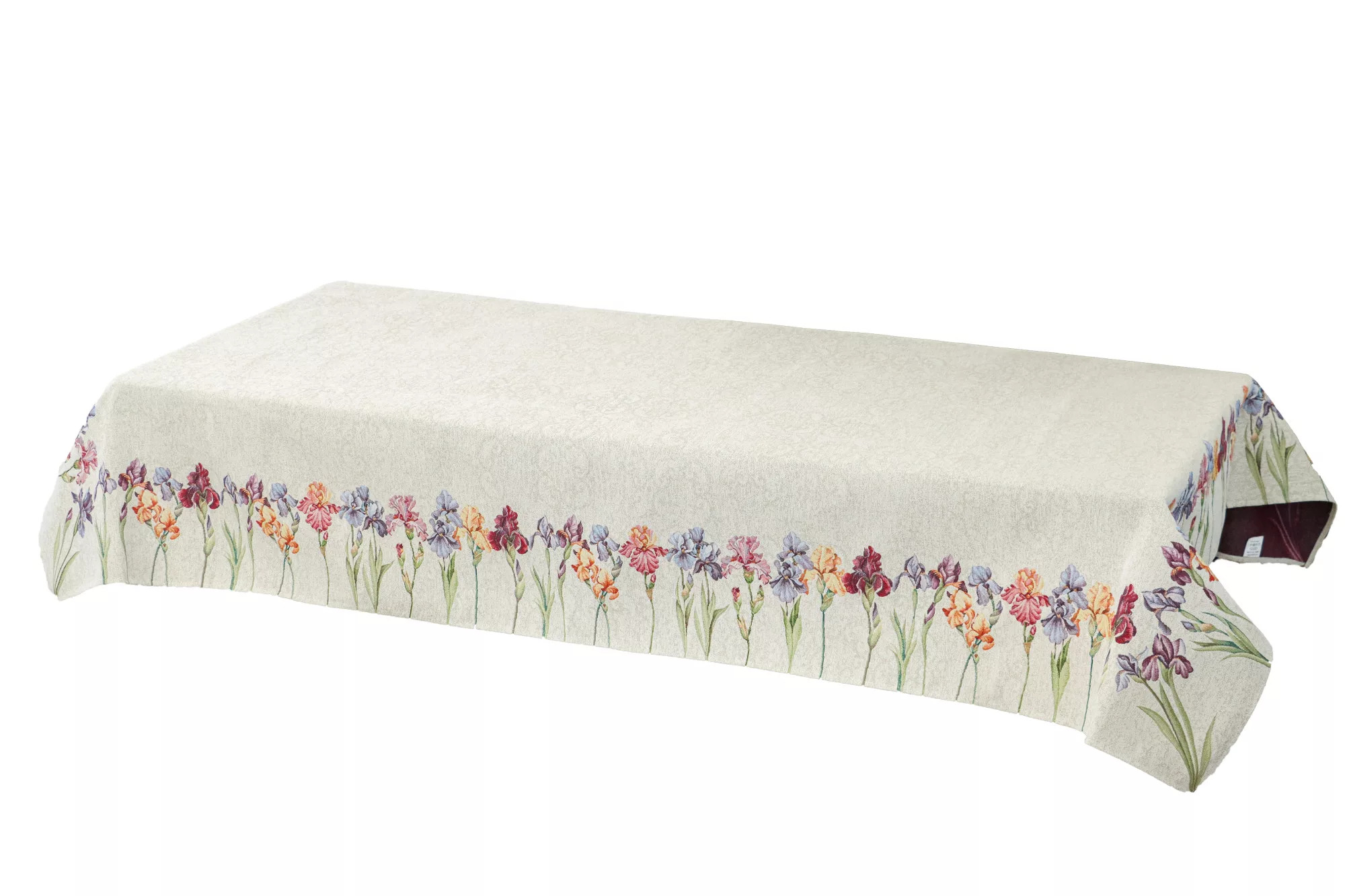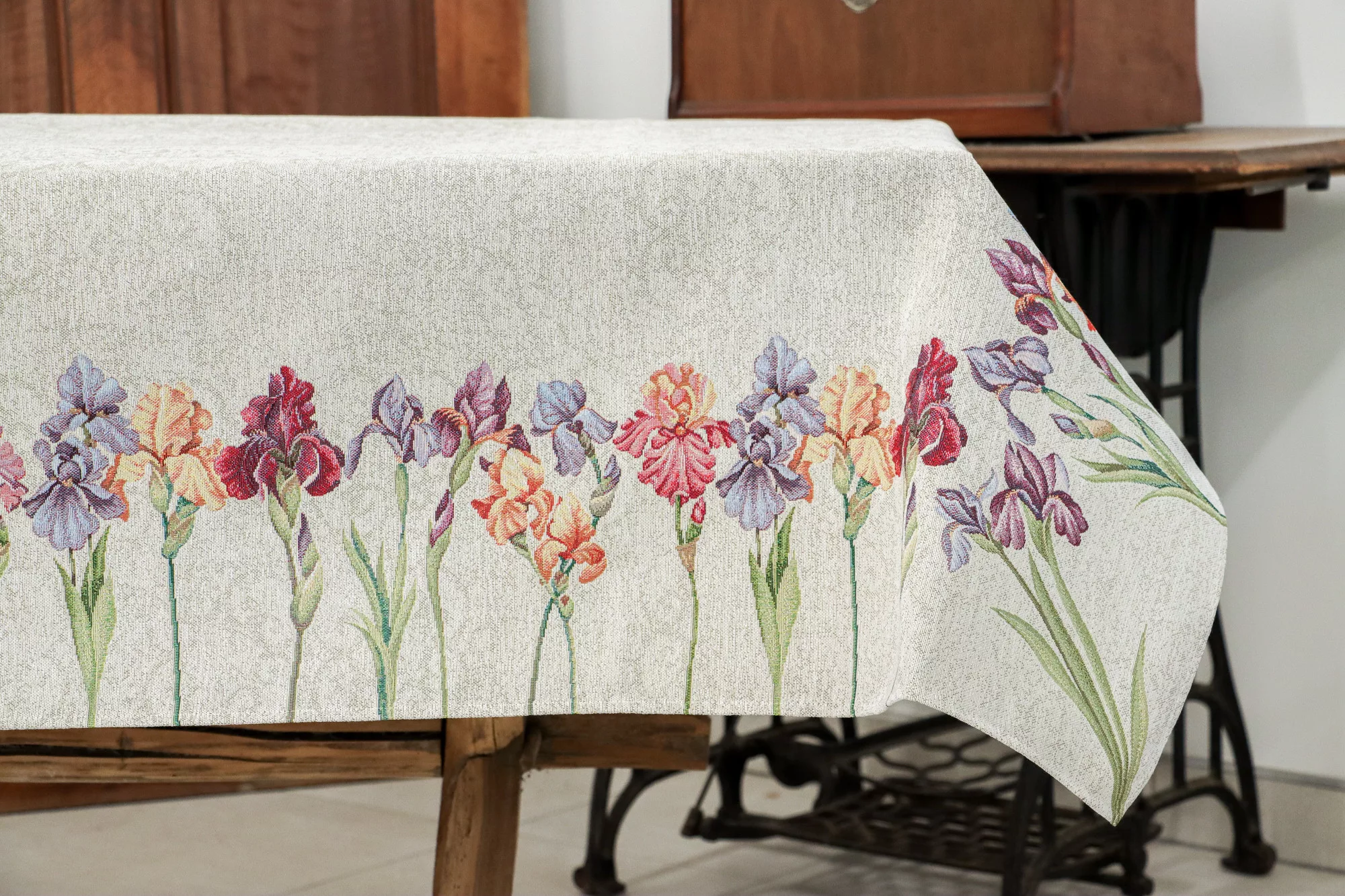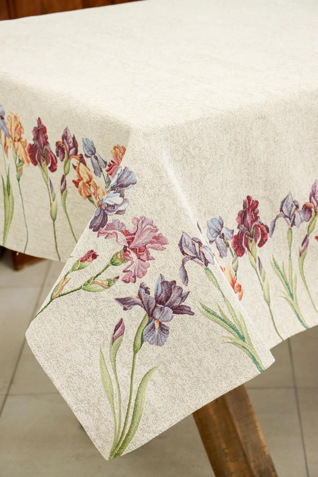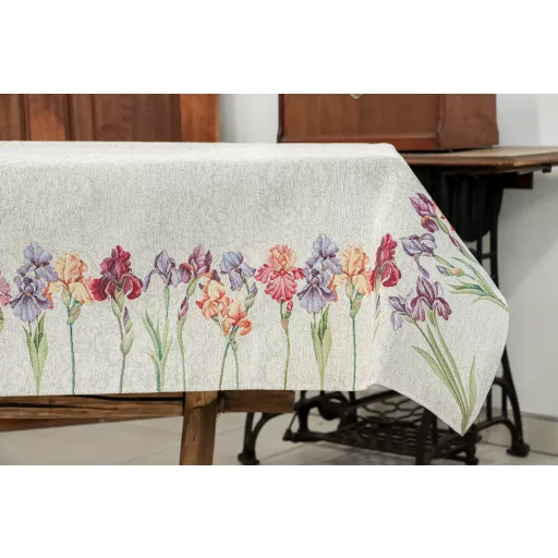 Spanyol gobelin asztalterítő – Színpompás íriszek és szegfűk