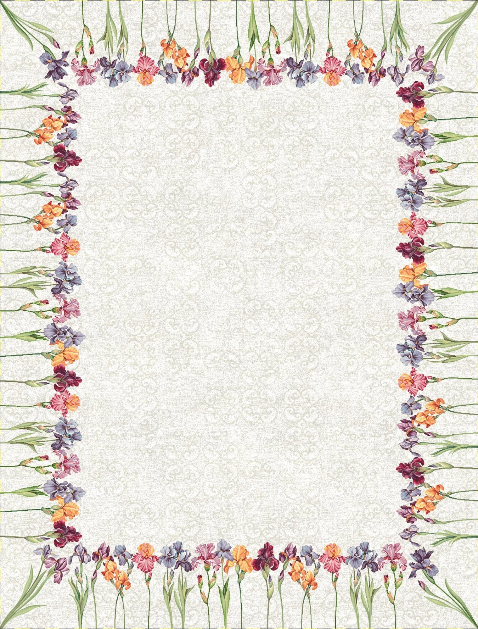 Ez a gyönyörű, gépi gobelin asztalterítő valódi éke lehet az étkeződnek. A részletgazdag, élénk színű íriszek és szegfűk keretként ölelik körbe a terítőt, míg a középső rész diszkréten mintázott háttérrel teremt harmonikus egyensúlyt.