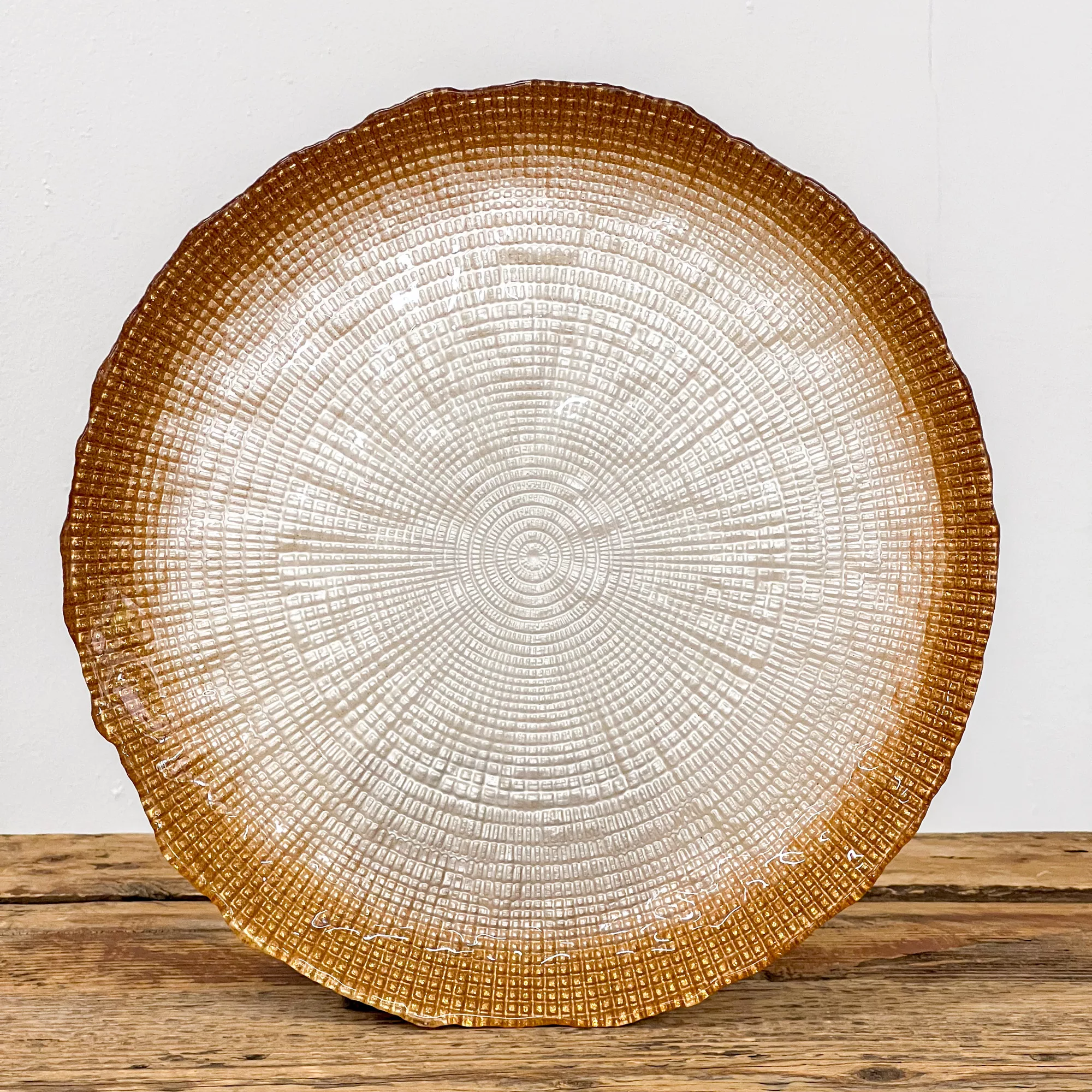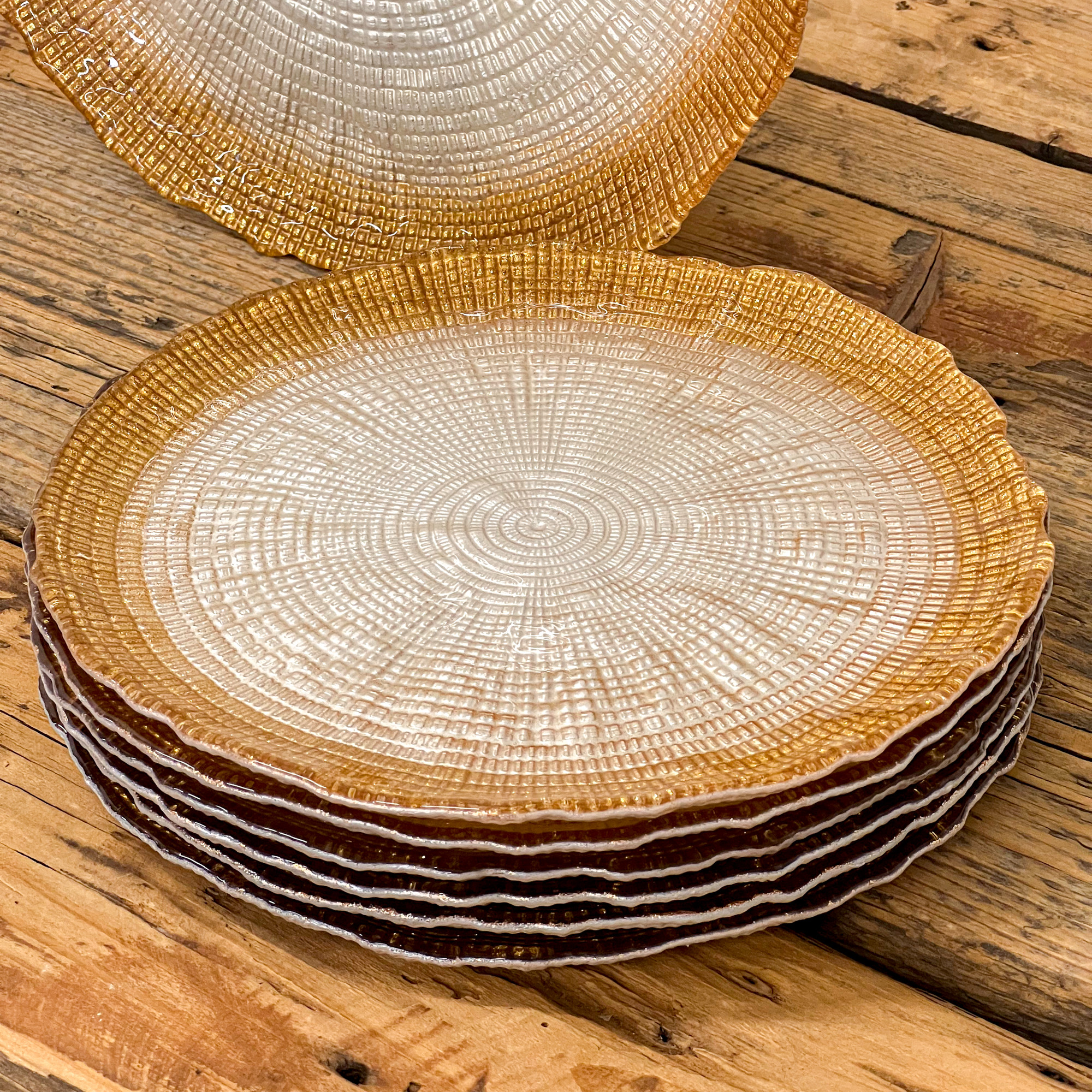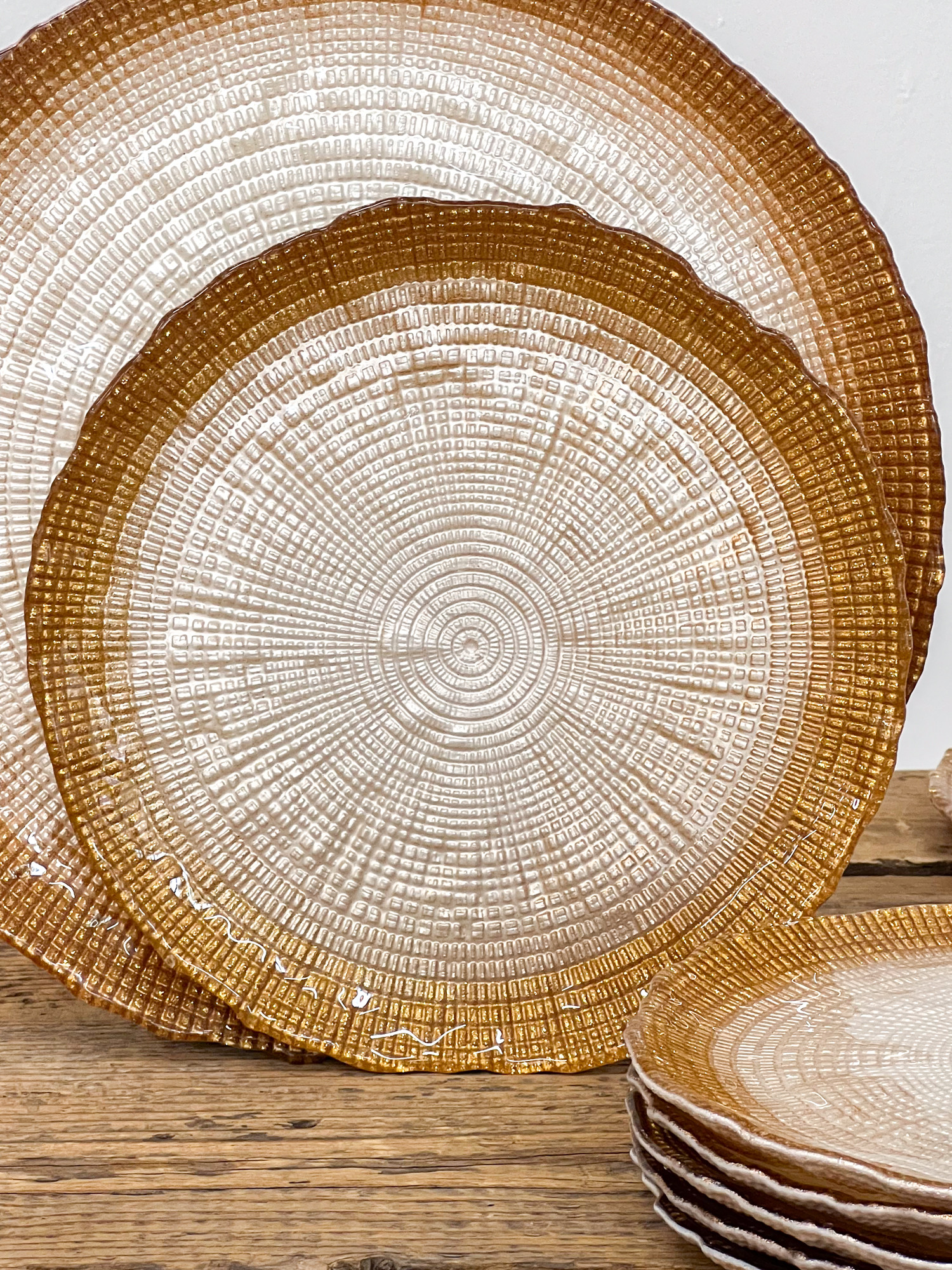 Tedd különlegessé az asztalterítést ezzel a stílusos üveg desszerttányér szettel! A 6 db, 21 cm átmérőjű tányér felületét egyedi faerezet mintázat díszíti, szélükön pedig bronz színű csillám fut végig, amely elegáns és luxus hatást kölcsönöz.