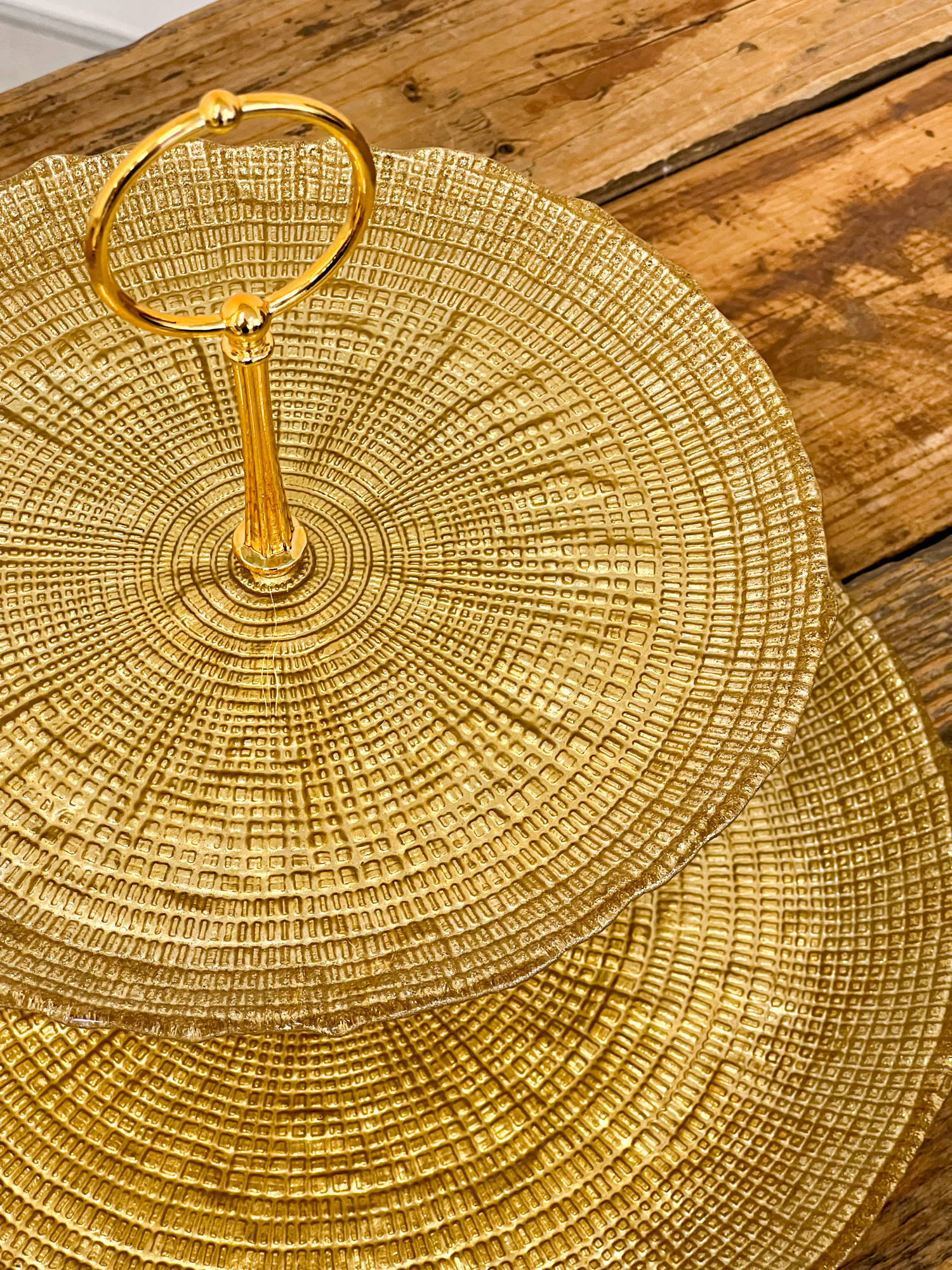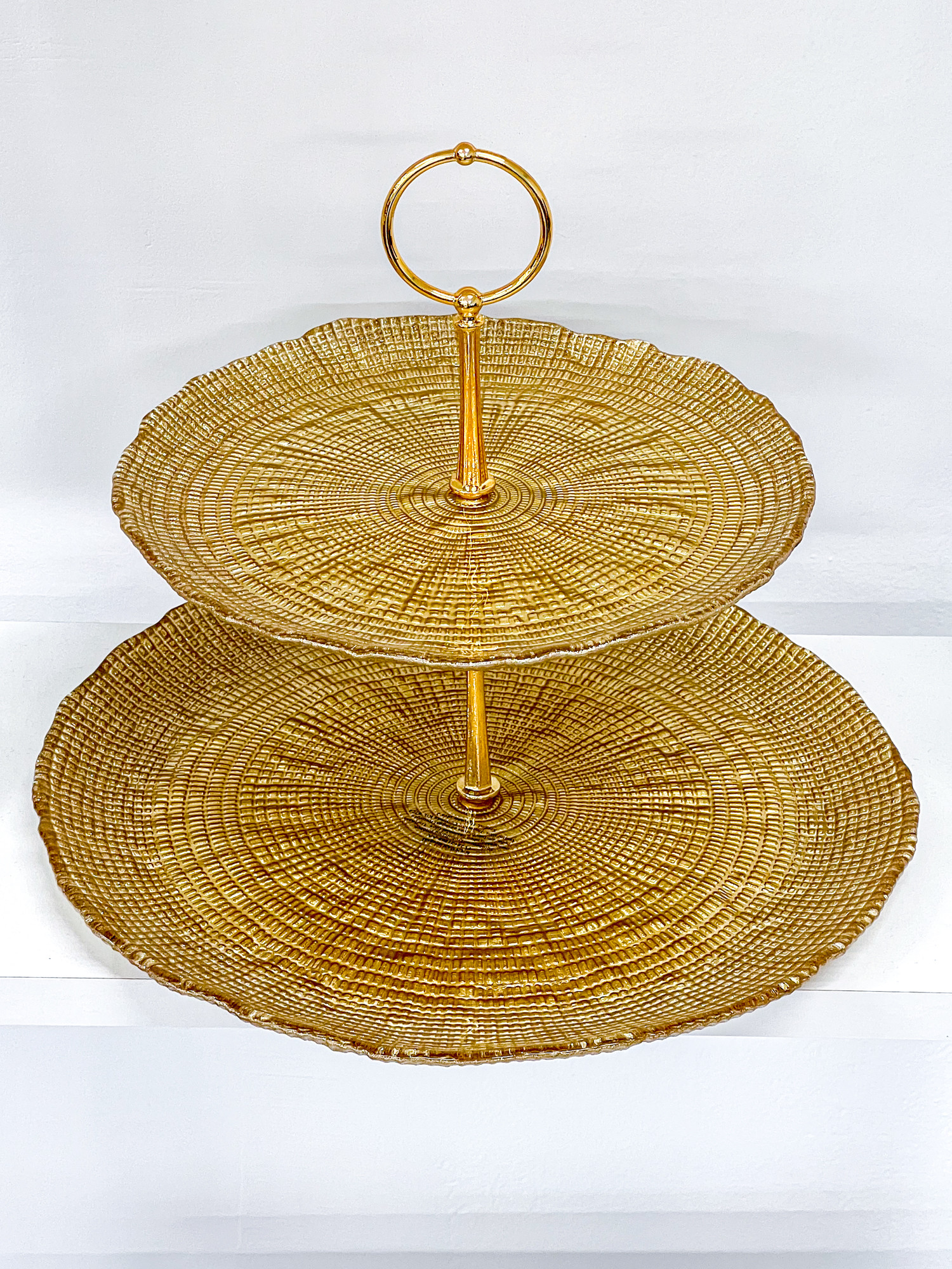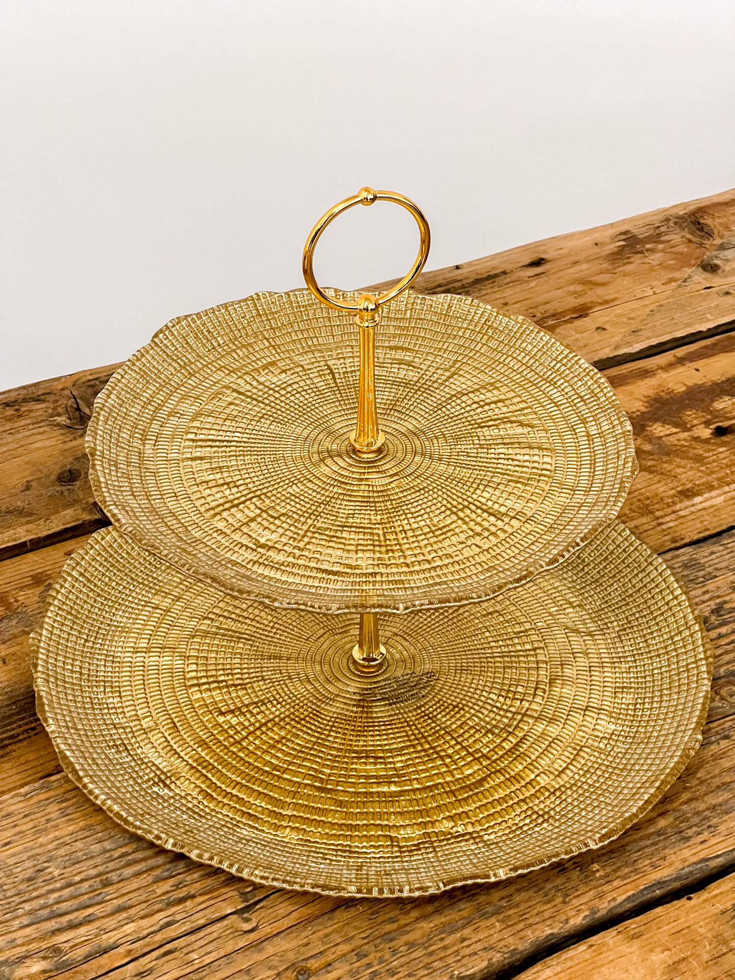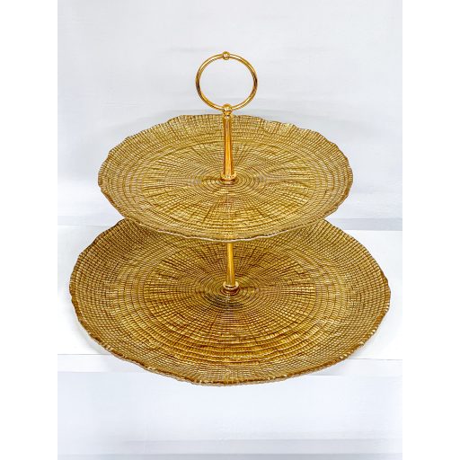 Tedd különlegessé az asztalterítést ezzel a stílusos, kétszintes emeletes kínálóval! Felületét egyedi faerezet mintázat díszíti, szélén pedig arany színű csillám fut végig, amely elegáns és luxus hatást kölcsönöz.