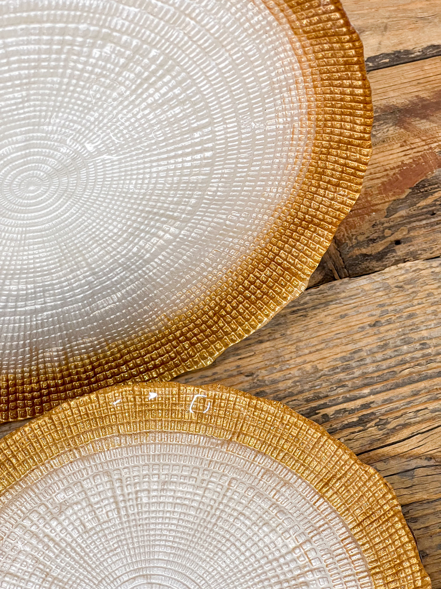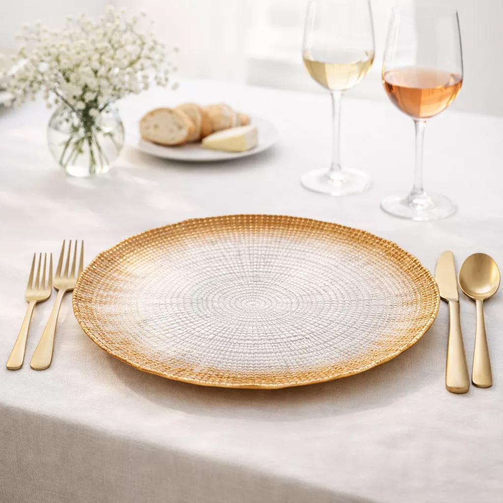 Varázsold különlegessé az ünnepi asztalt ezzel az elegáns üveg tányérral! A tányér felületét finom faerezet mintázat díszíti, szélén pedig bronz színű csillám fut végig, amely luxus hatást kölcsönöz minden terítéknek. Tökéletesek főételek, ünnepi fogások tálalásához