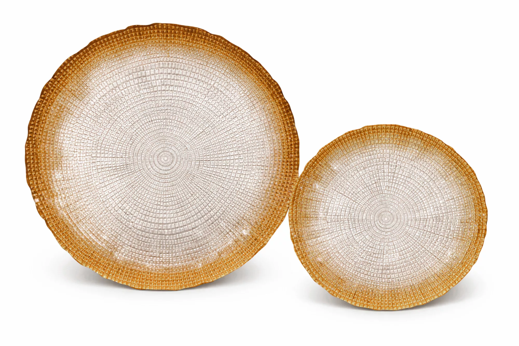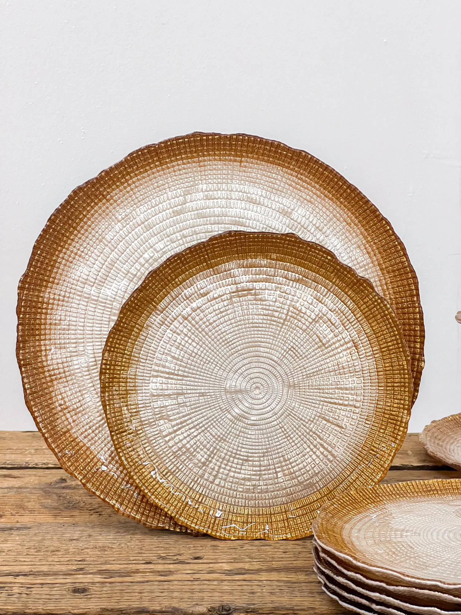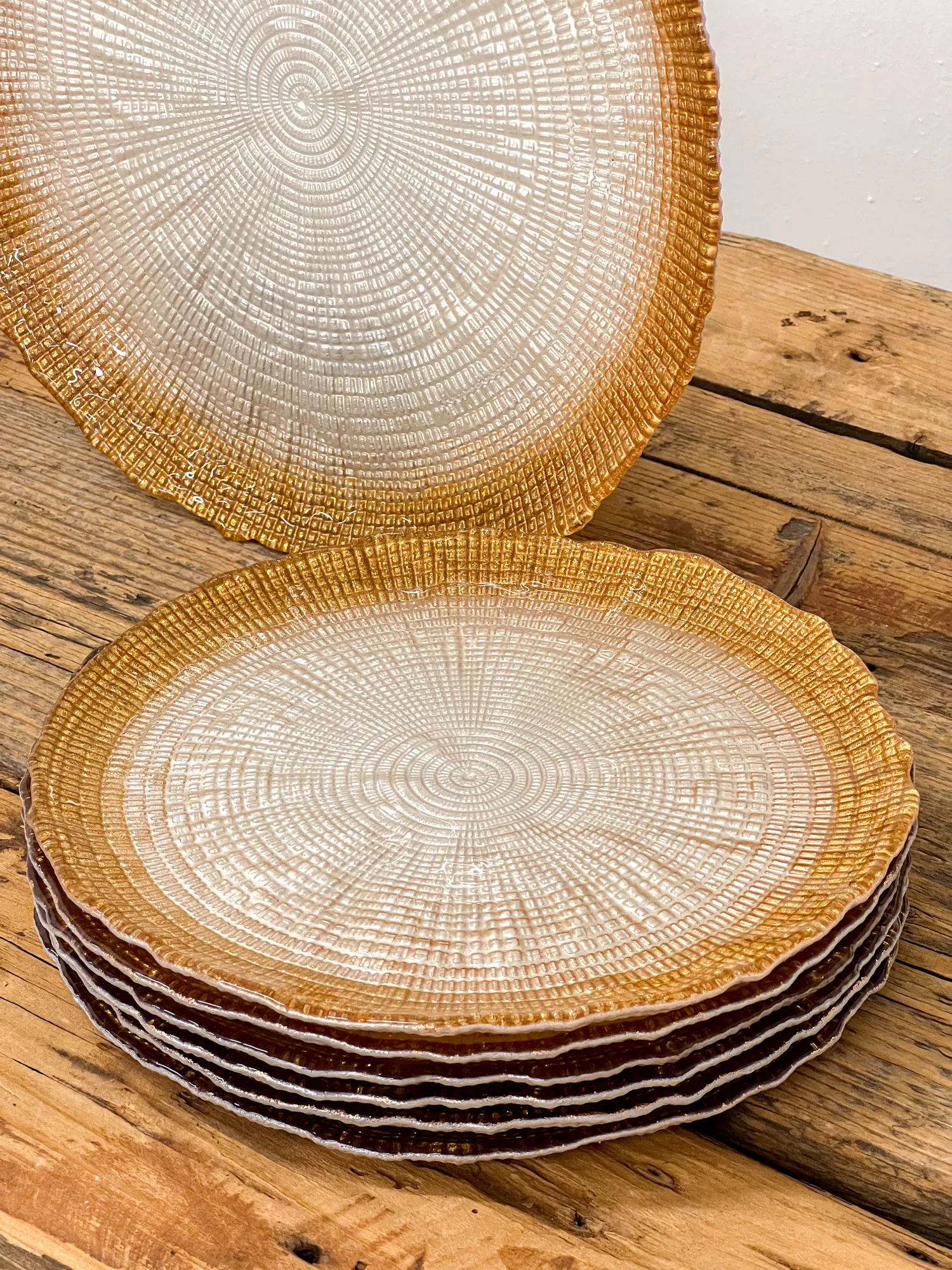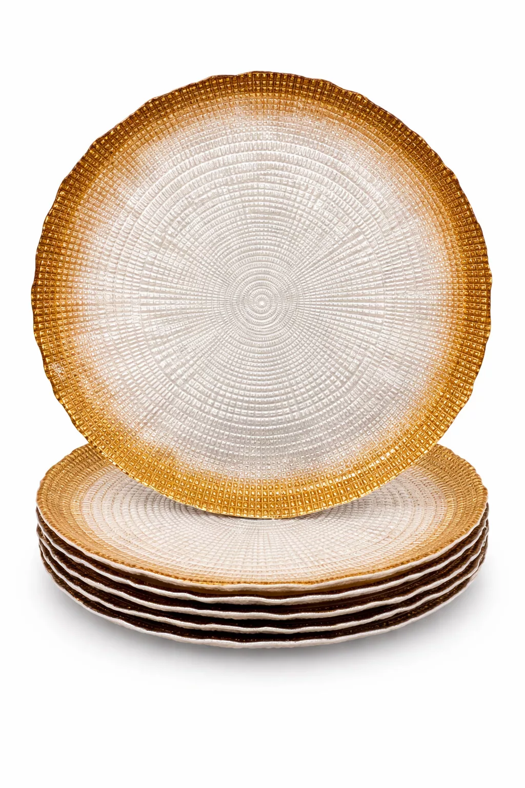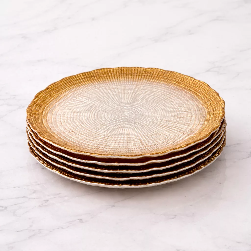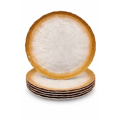Varázsold különlegessé az ünnepi asztalt ezzel az elegáns üveg süteményes tányérkészlettel! A tányérok felületét finom faerezet mintázat díszíti, szélükön pedig bronz színű csillám fut végig, amely luxus hatást kölcsönöz minden terítéknek.