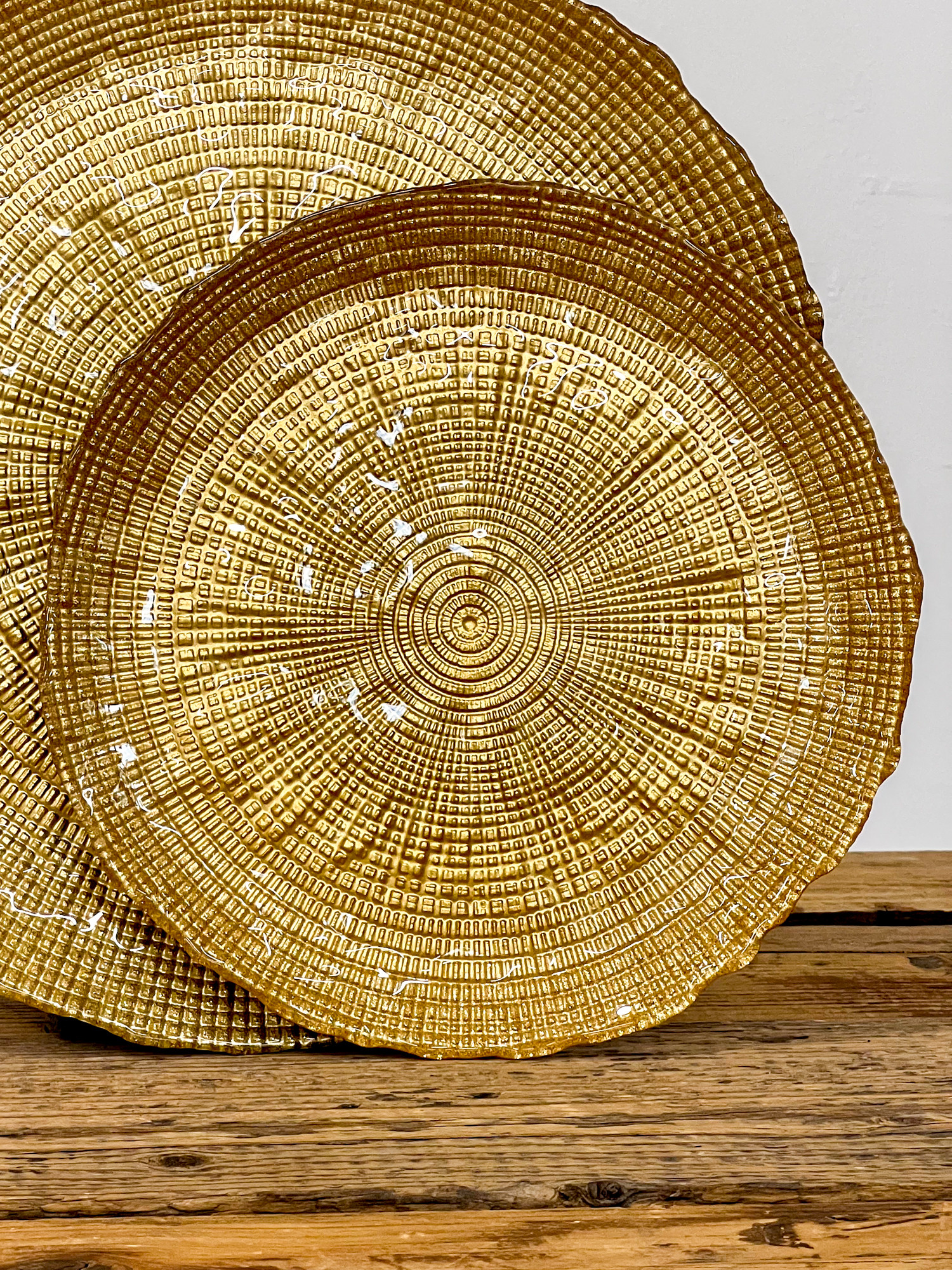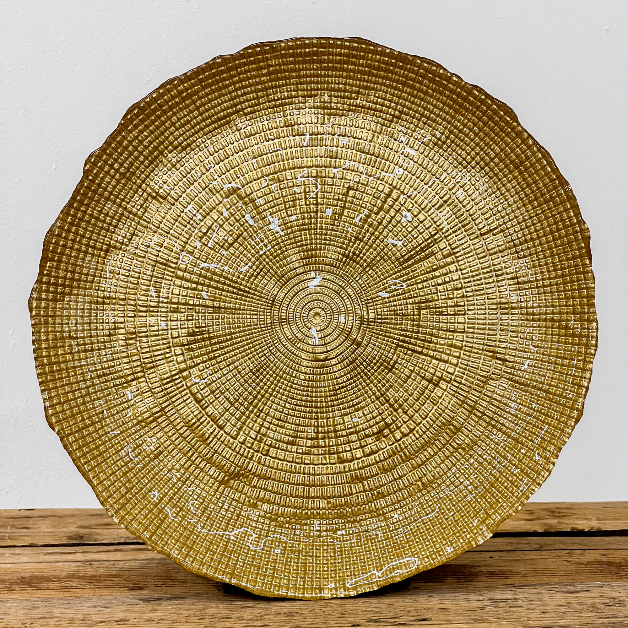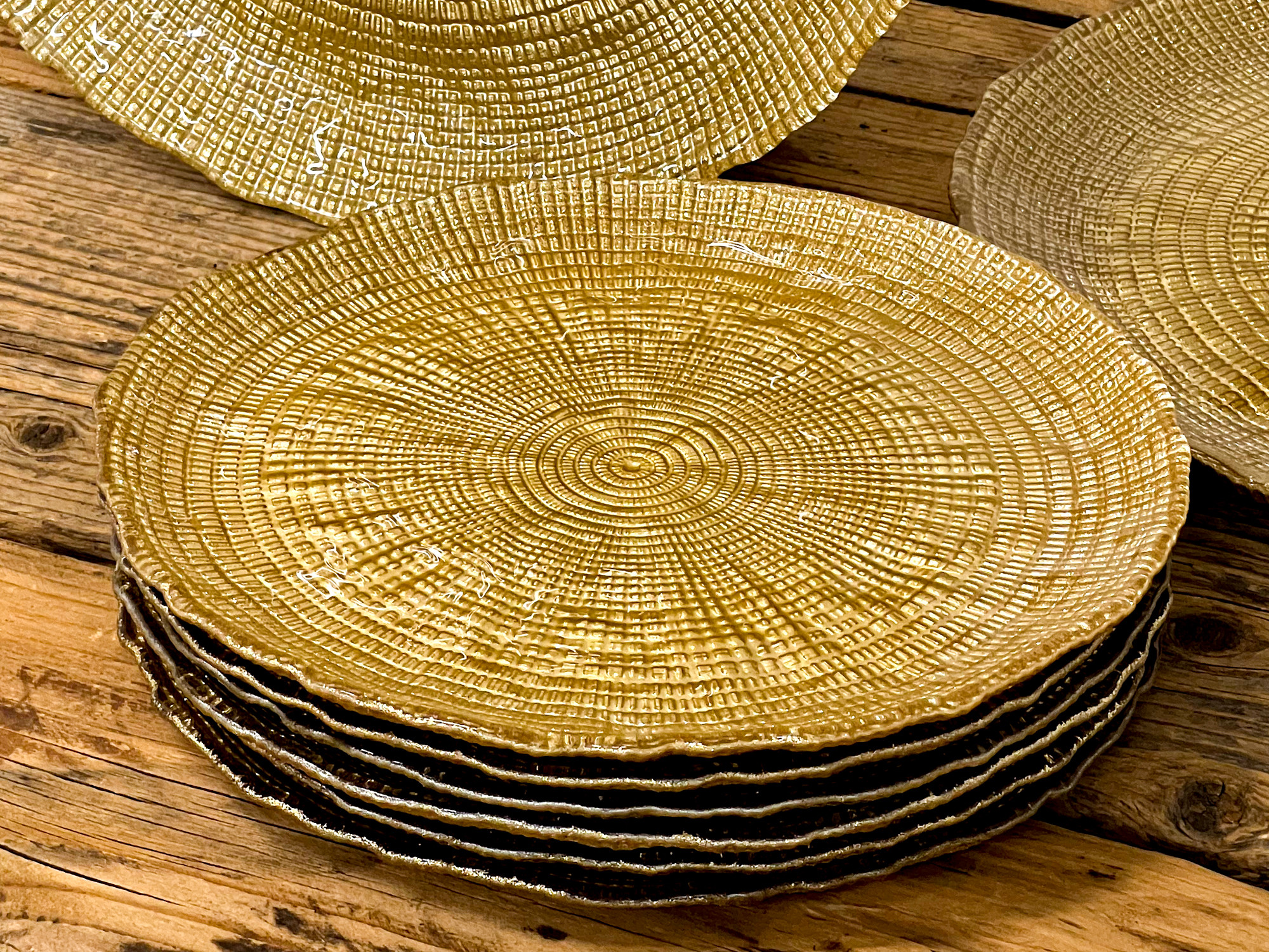 Tedd különlegessé az asztalterítést ezzel a stílusos üveg desszerttányér szettel! A 6 db, 21 cm átmérőjű tányér felületét egyedi faerezet mintázat díszíti, szélükön pedig arany színű csillám fut végig, amely elegáns és luxus hatást kölcsönöz.