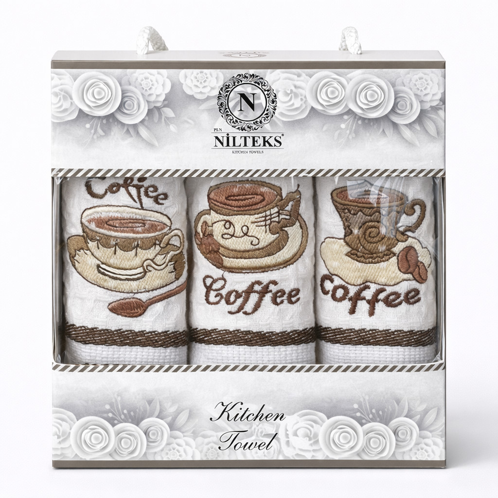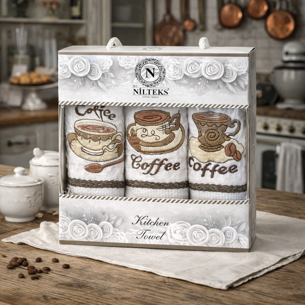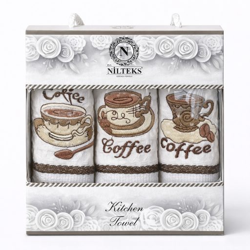 A díszdobozos szett 3 db egyforma méretű, gofri mintázatú, kávés konyharuhát tartalmaz. Tökéletes ajándék lehet minden alkalomra. Hétköznapi használatra is megfelelő, jó nedvszívó képességekkel rendelkező termék.
