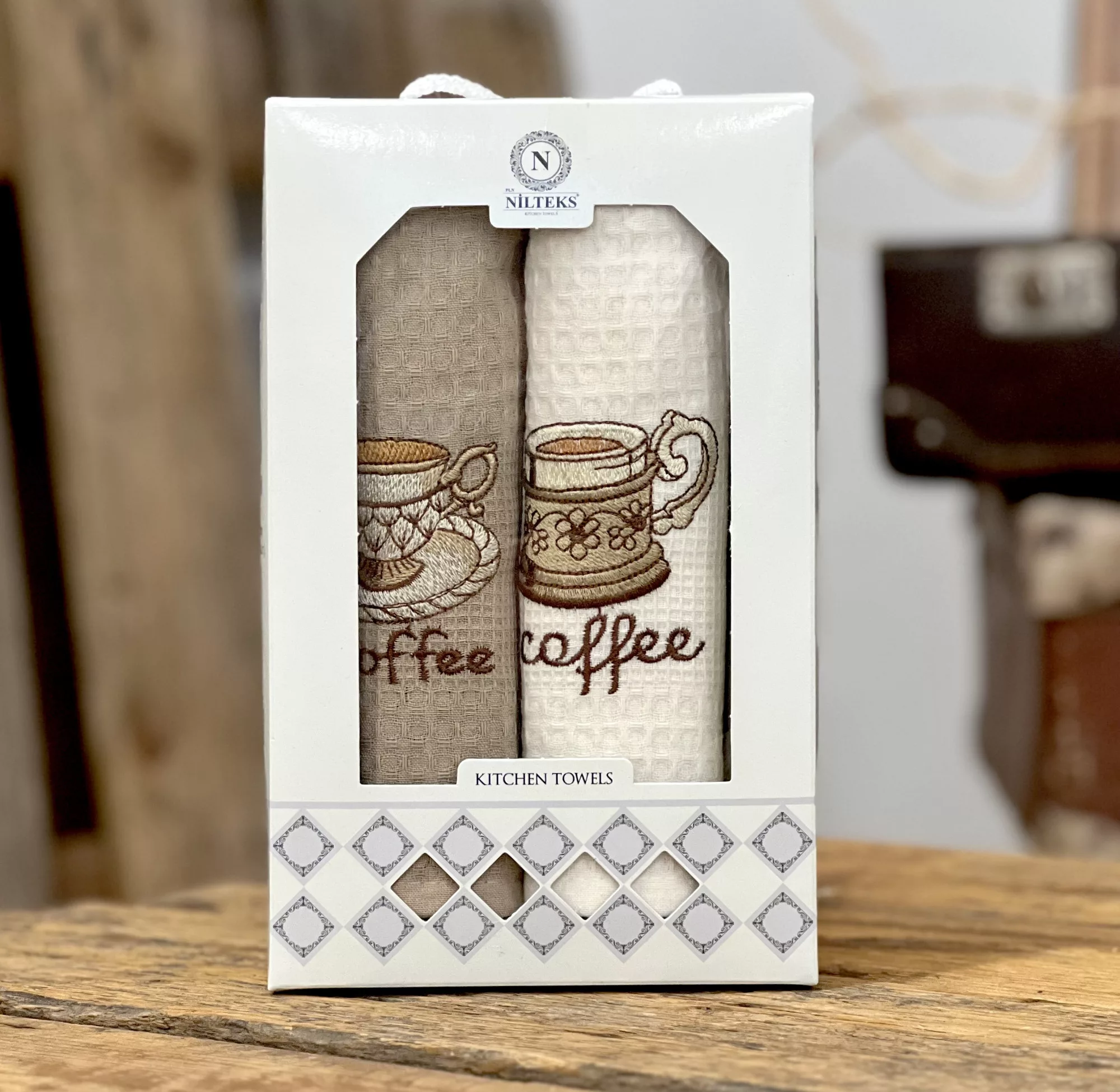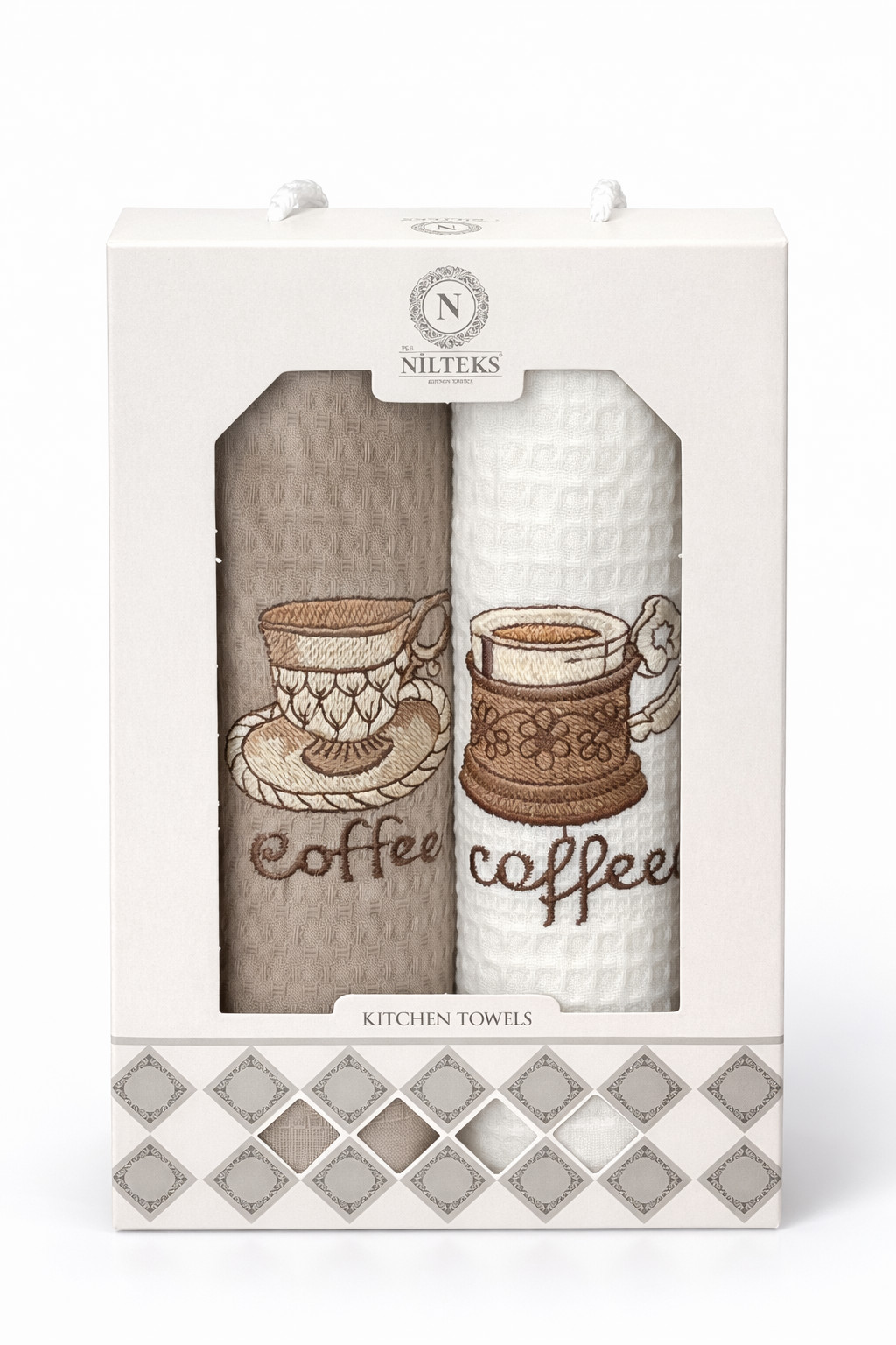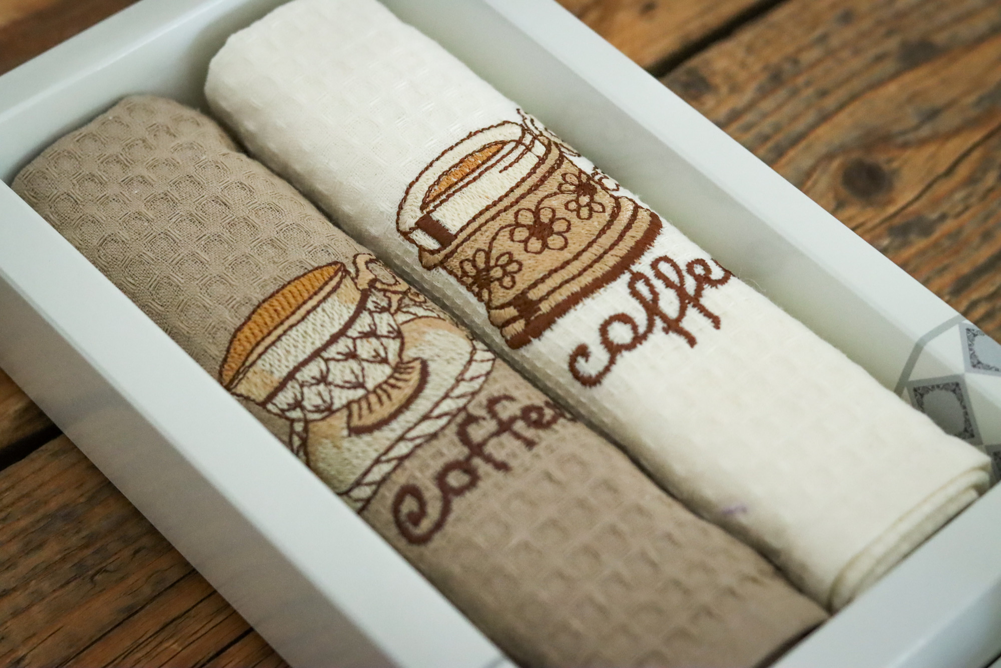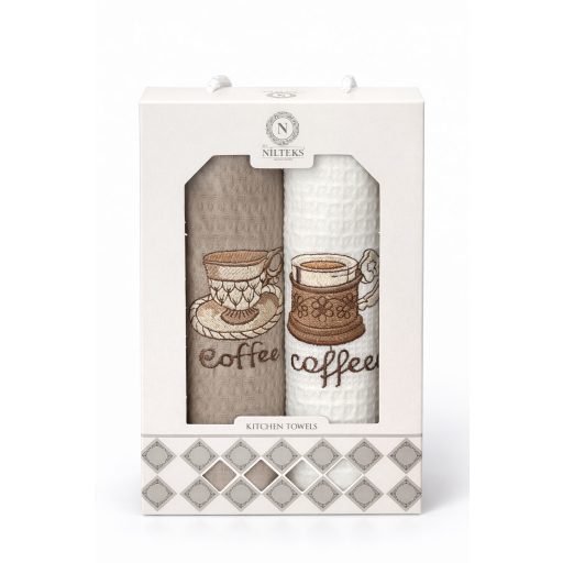 A díszdobozos szett 2 db egyforma méretű gofri mintázatú, kávés konyharuhát tartalmaz. Tökéletes ajándék lehet minden alkalomra. Hétköznapi használatra alkalmas, jó nedvszívó képességekkel rendelkező termék.