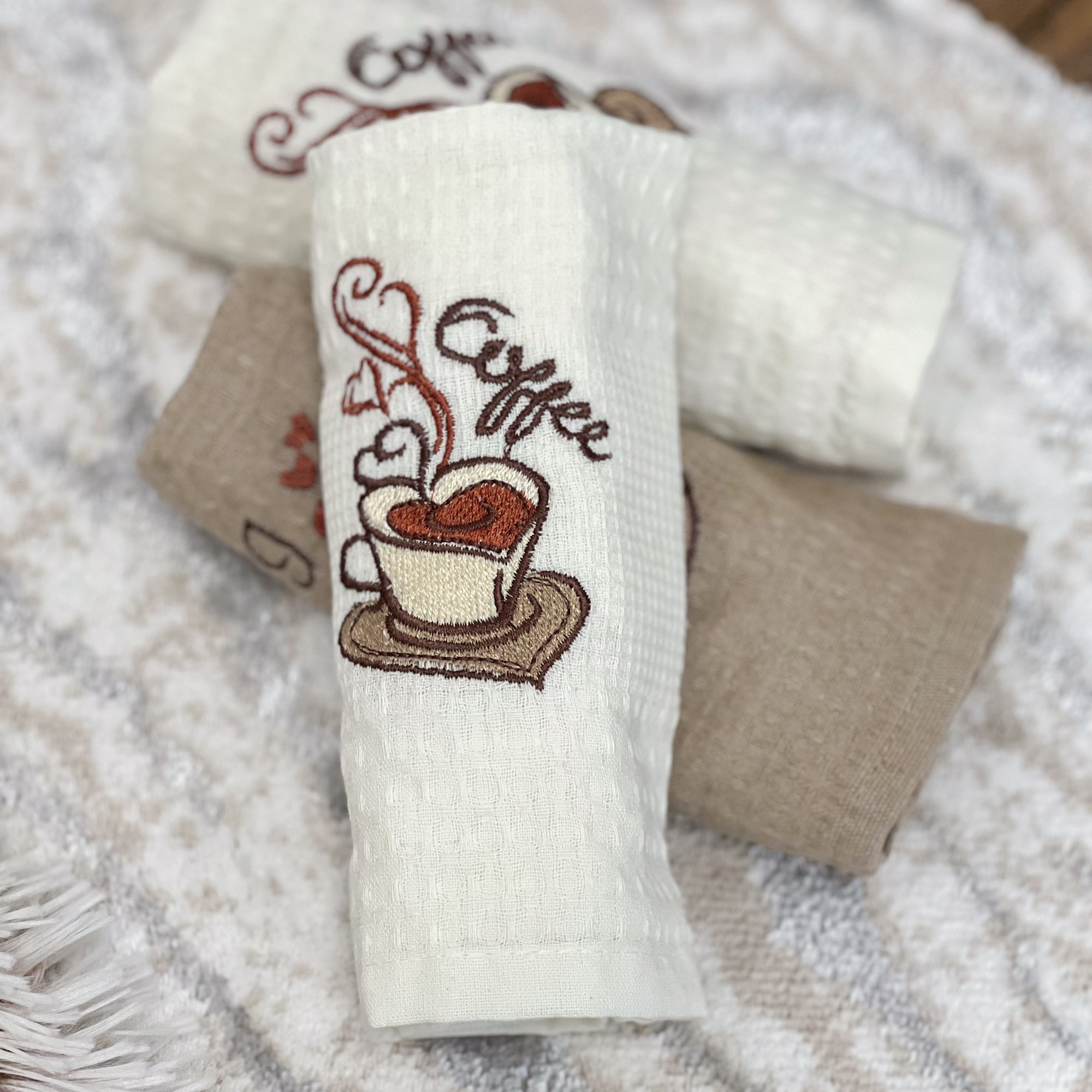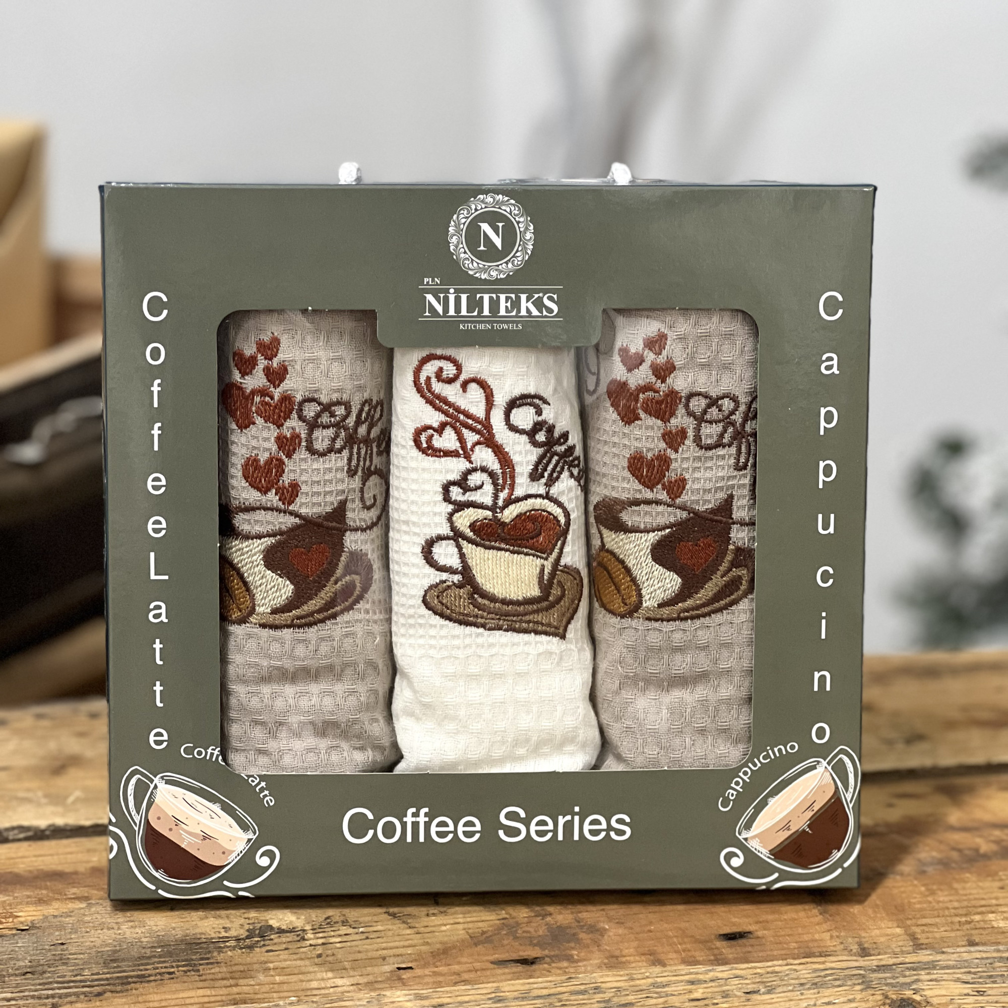 Kávés, szivecskés konyharuha szett díszdobozban, 3 db-os