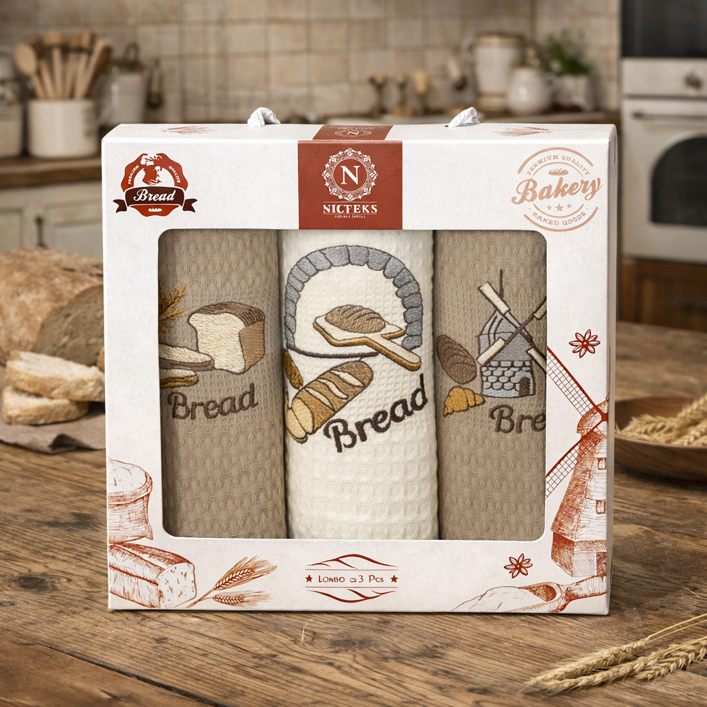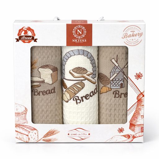 A díszdobozos szett 3 db egyforma méretű gofri mintázatú, kenyeres konyharuhát tartalmaz. Tökéletes ajándék lehet minden alkalomra. Hétköznapi használatra alkalmas, jó nedvszívó képességekkel rendelkező termék.