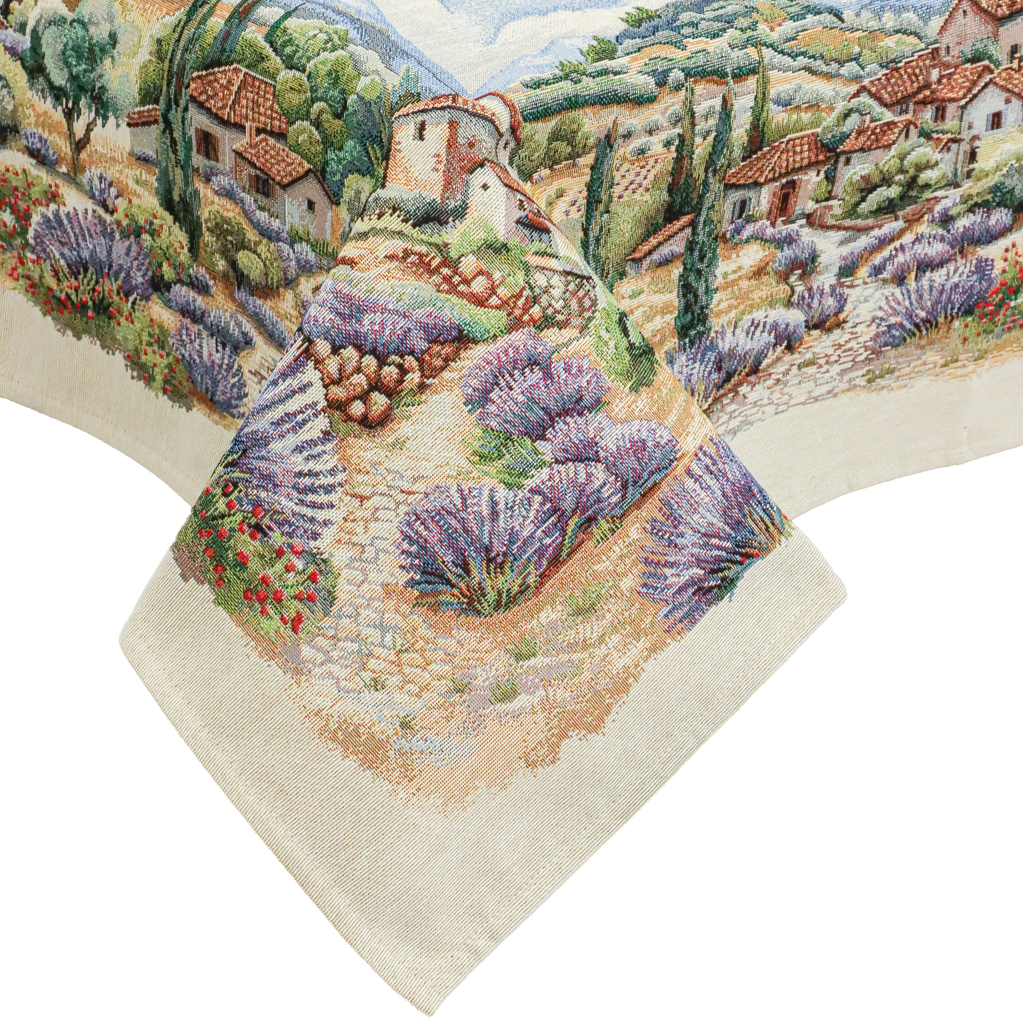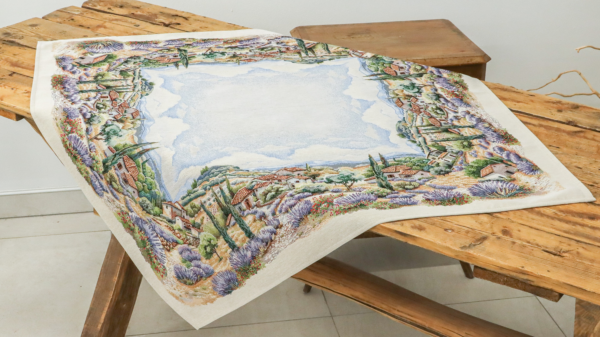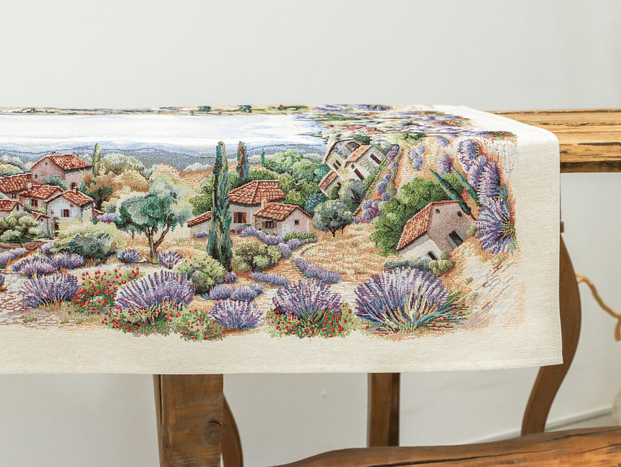Ez a különleges spanyol gobelin asztalterítő a klasszikus gobelin stílust ötvözi a modern, precíz gépi szövési technológiával. A festői francia táj, levendulamezők és bájos vidéki házak részletgazdag mintái harmonikus, természetközeli és romantikus hangulatot visznek az asztali dekorációba.
