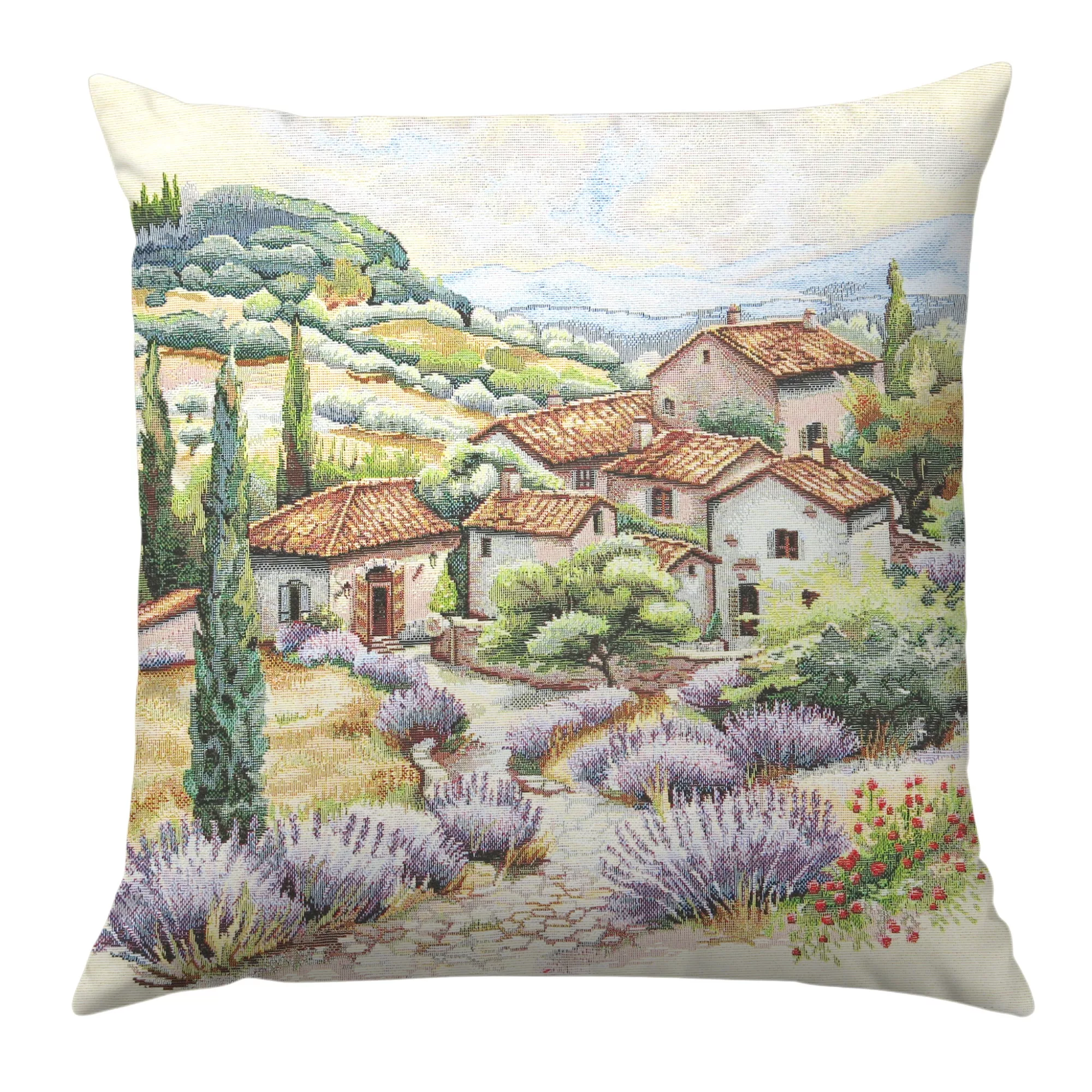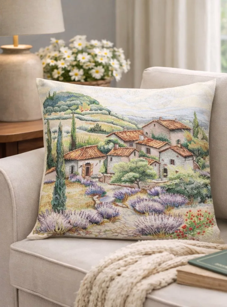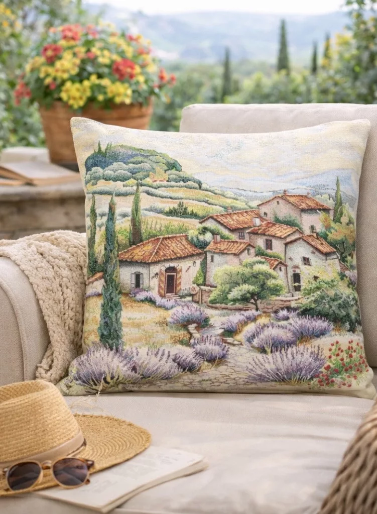 Ez a festői gépi gobelin párna egy toszkán vidéki tájat jelenít meg levendulamezőkkel, ciprusokkal és mediterrán házikókkal, meleg színvilágával azonnal meghittséget és nyugalmat sugároz. Ideális választás, ha természetközeli, rusztikus vagy mediterrán stílusú enteriőrbe keres látványos kiegészítőt. A kiváló minőségű spanyol gobelin szövet részletgazdag mintát biztosít, amely évek múltán is megőrzi szépségét.