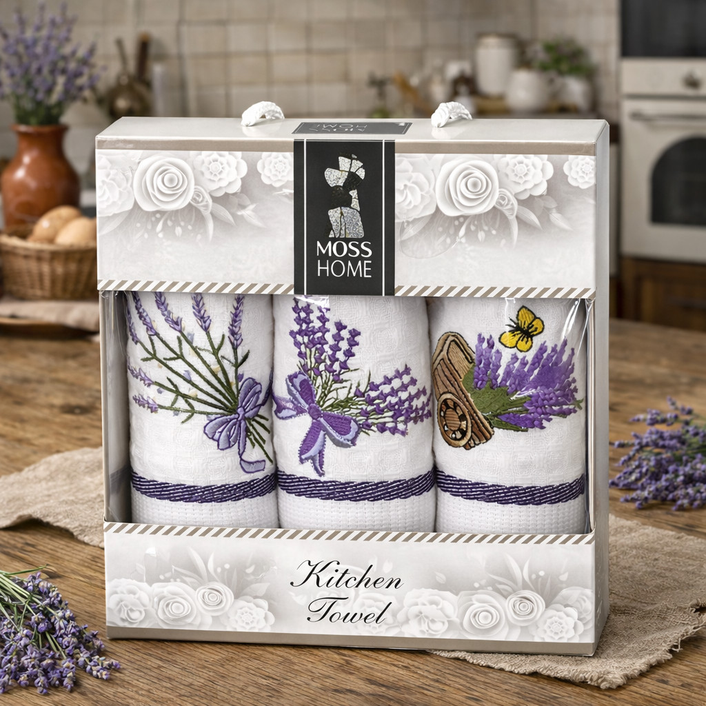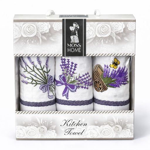 A díszdobozos szett 3 db egyforma méretű, gofri mintázatú, levendulás konyharuhát tartalmaz. Tökéletes ajándék lehet minden alkalomra. Hétköznapi használatra is megfelelő, jó nedvszívó képességekkel rendelkező termék.
