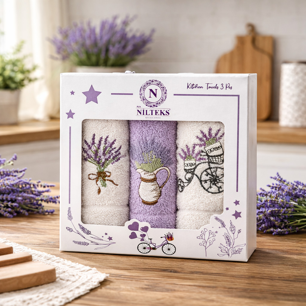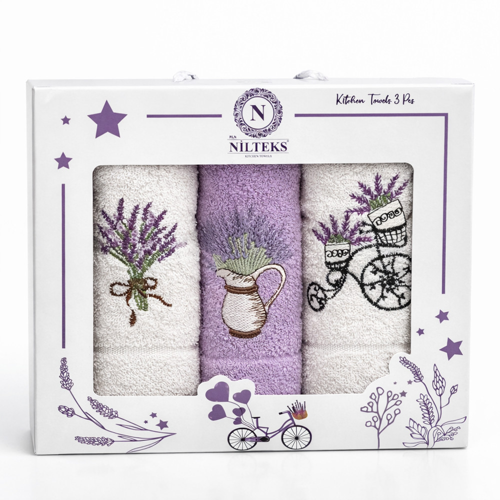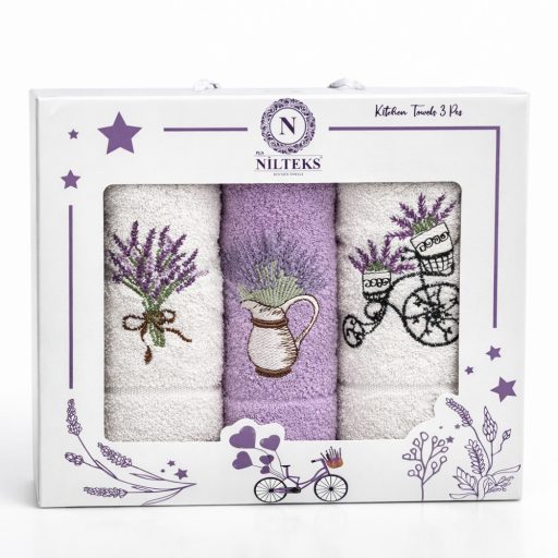 A díszdobozos szett 3 db egyforma méretű, levendulás frottír kéztörlőt tartalmaz. Tökéletes ajándék lehet minden alkalomra. Hétköznapi használatra alkalmas, jó nedvszívó képességekkel rendelkező termék.