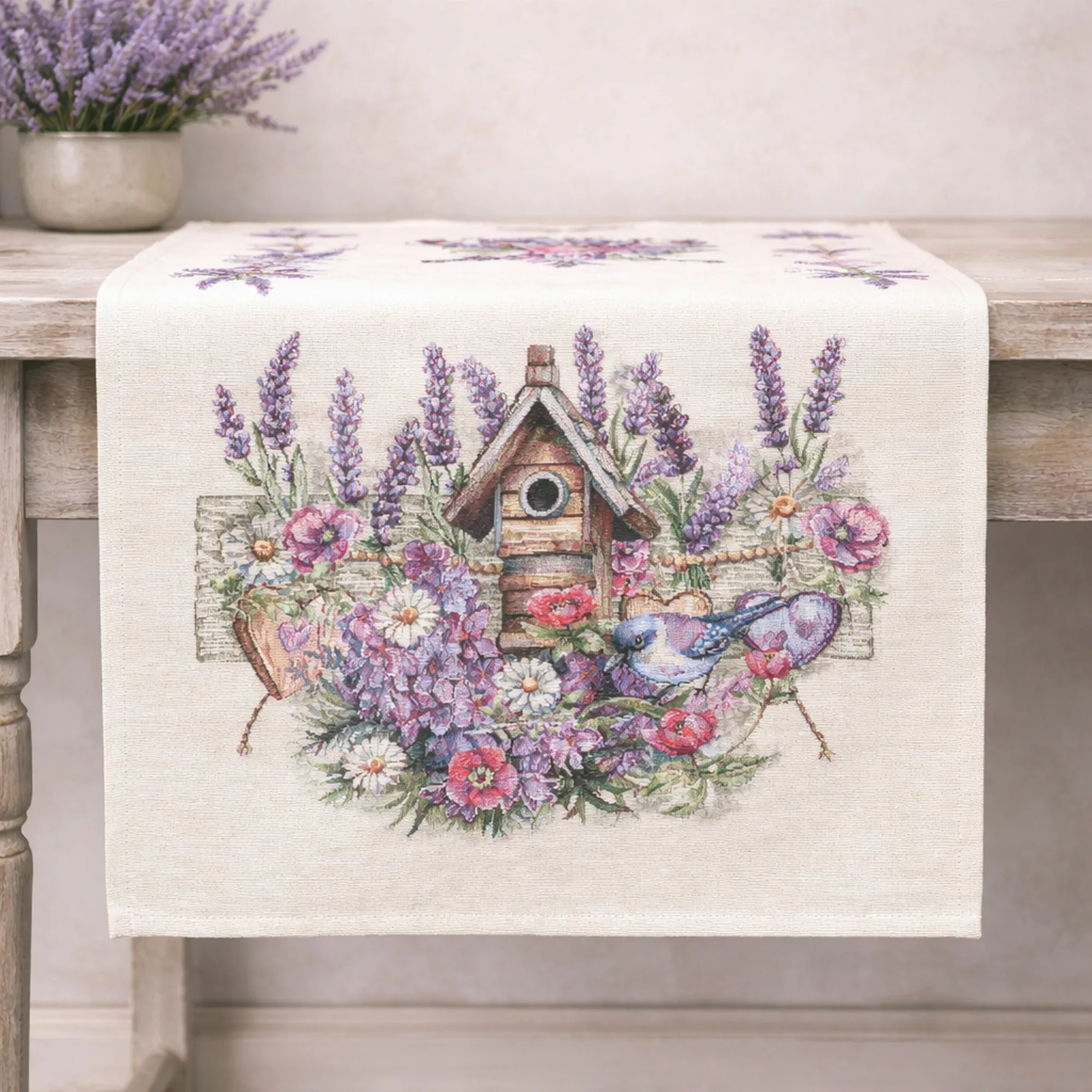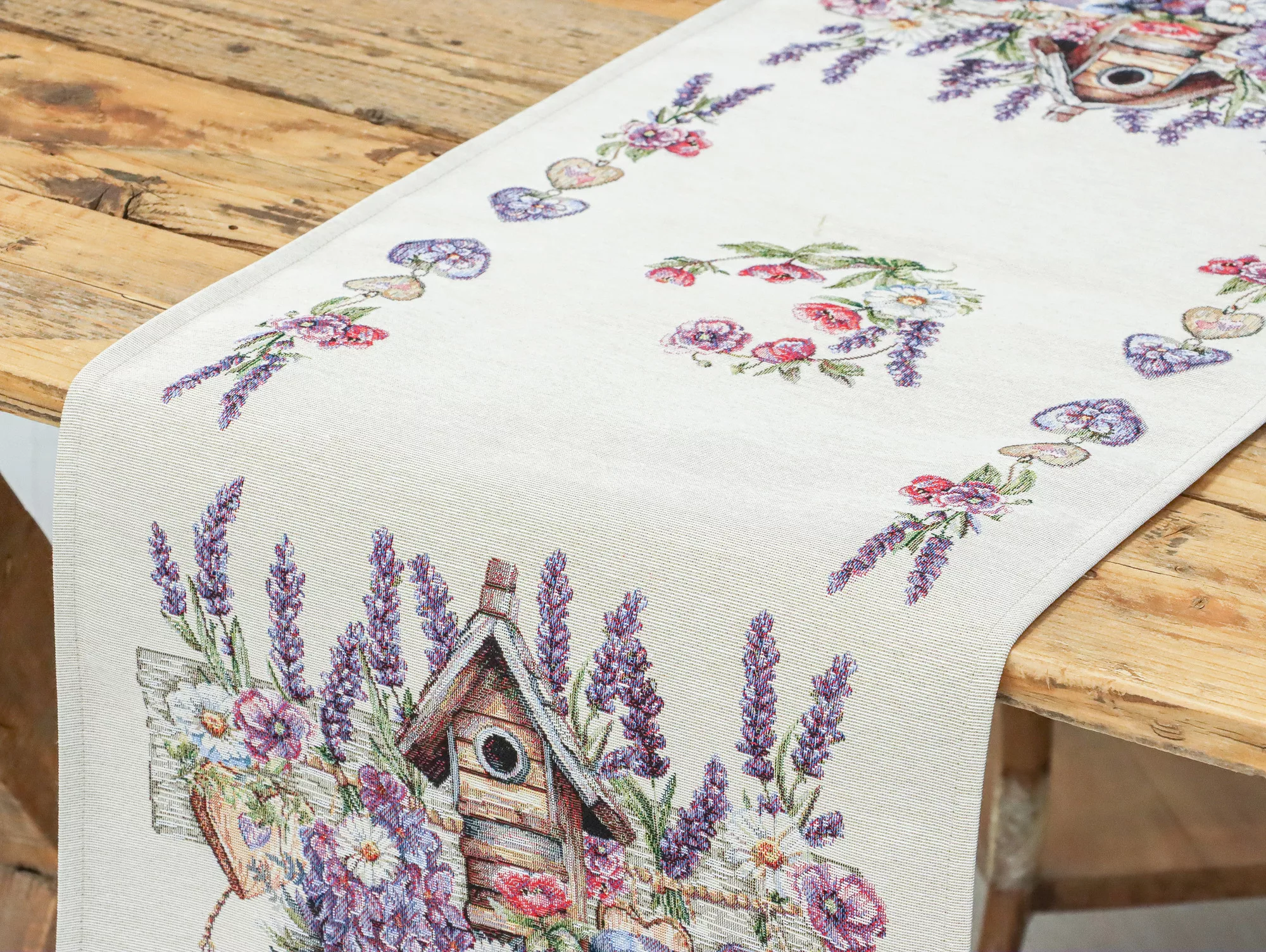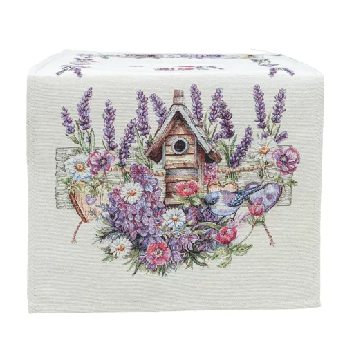 Ez a különleges spanyol gobelin asztali futó a klasszikus gobelin stílust ötvözi a modern, precíz gépi szövési technológiával. A részletgazdag minta levendulavirágokat, vadvirágokat, szívecskés díszítőelemeket, madárkát és egy rusztikus madáretetőt ábrázol, amely harmonikus, természetközeli és romantikus hangulatot kölcsönöz az asztali dekorációnak.