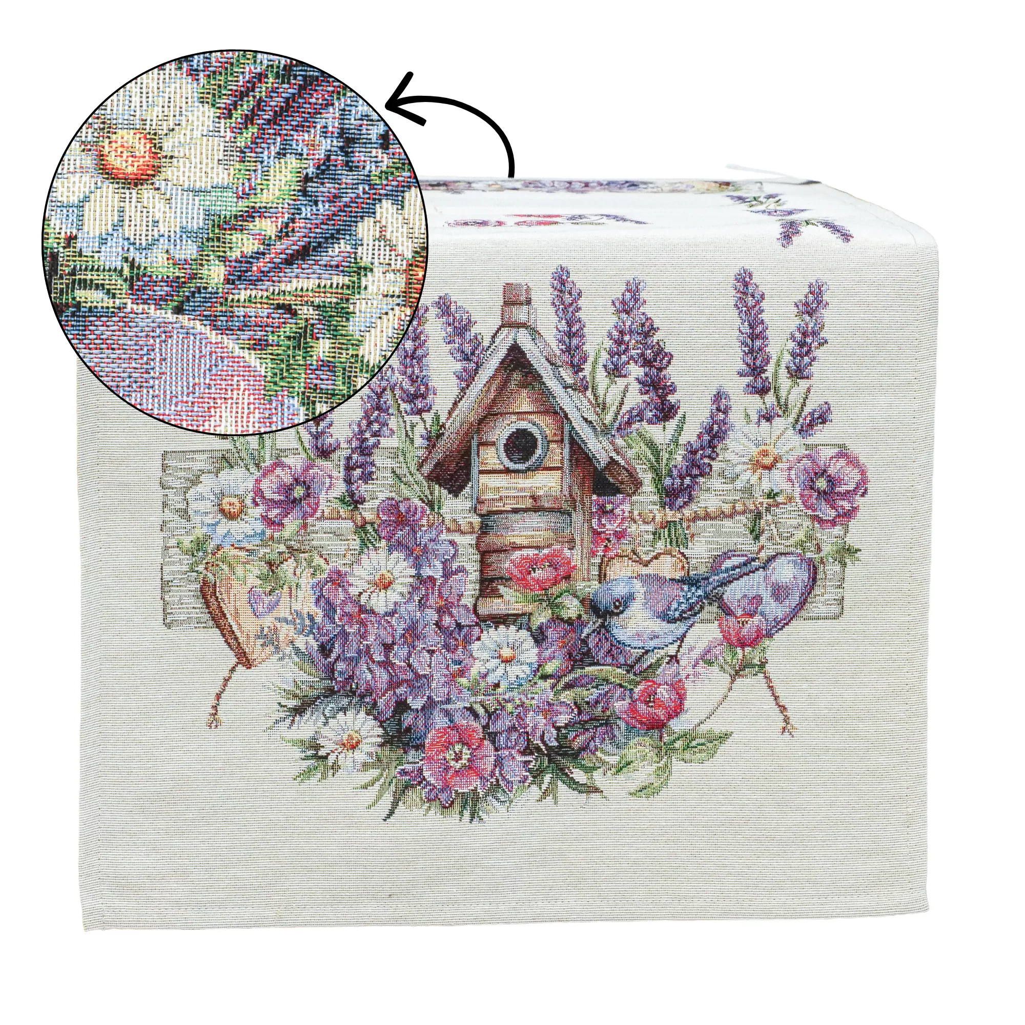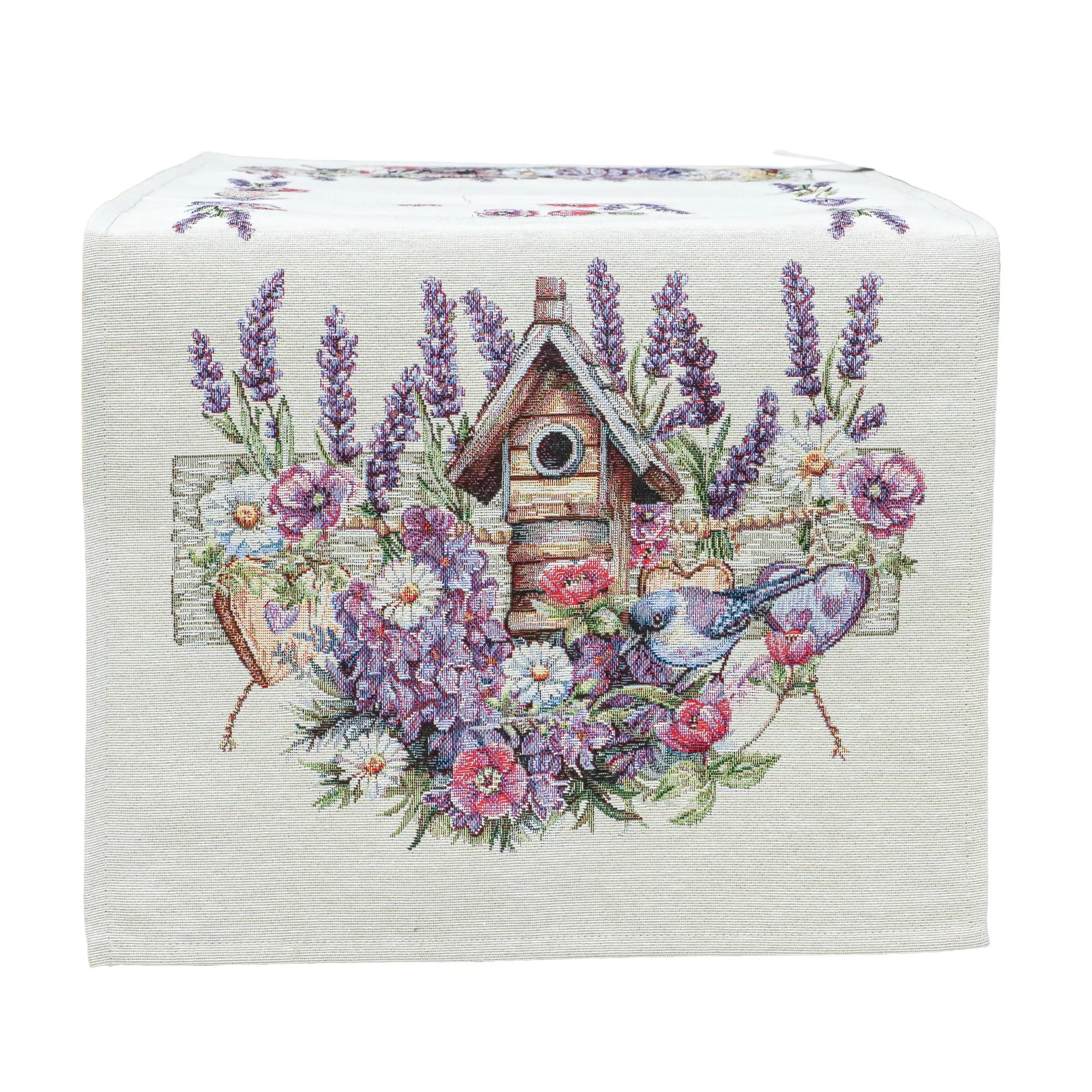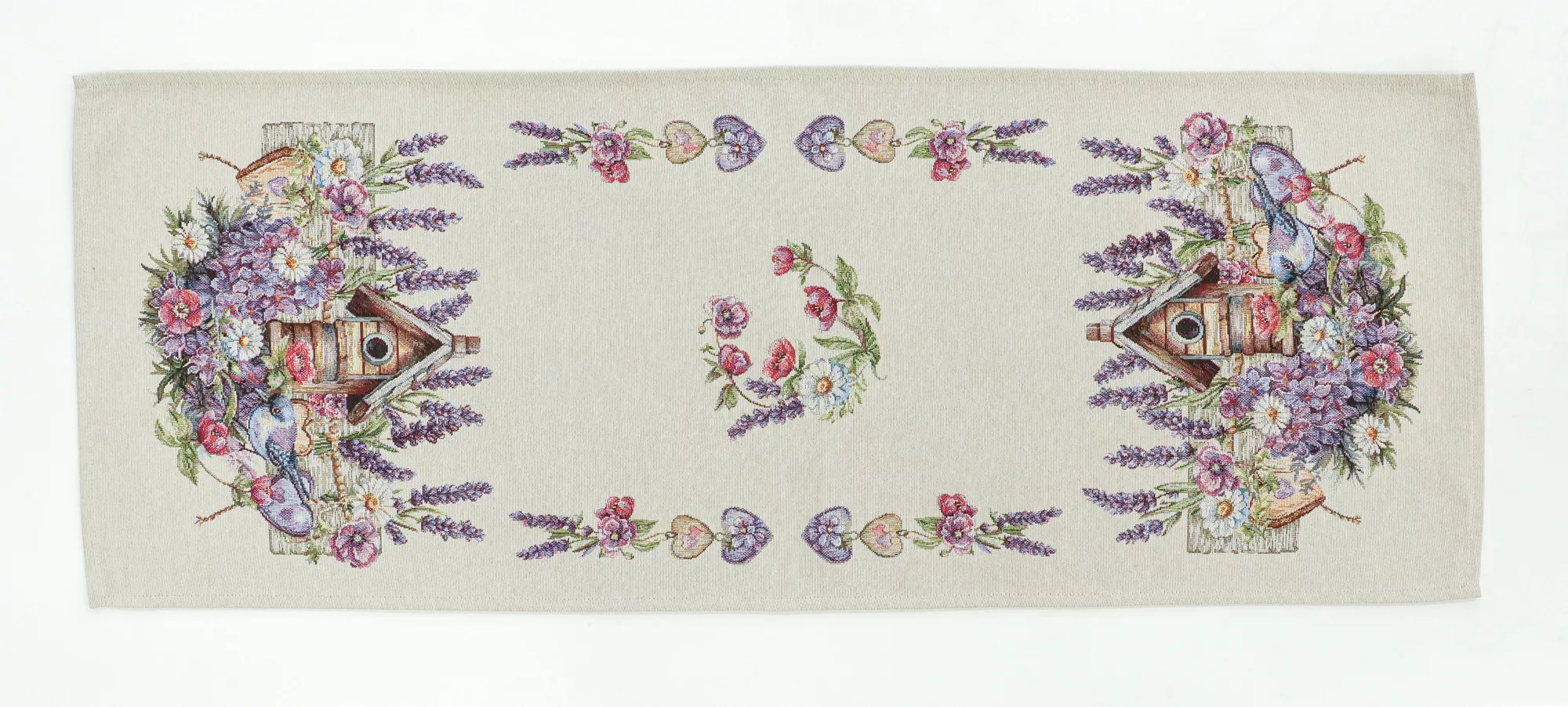 Ez a különleges spanyol gobelin asztali futó a klasszikus gobelin stílust ötvözi a modern, precíz gépi szövési technológiával. A részletgazdag minta levendulavirágokat, vadvirágokat, szívecskés díszítőelemeket, madárkát és egy rusztikus madáretetőt ábrázol, amely harmonikus, természetközeli és romantikus hangulatot kölcsönöz az asztali dekorációnak.