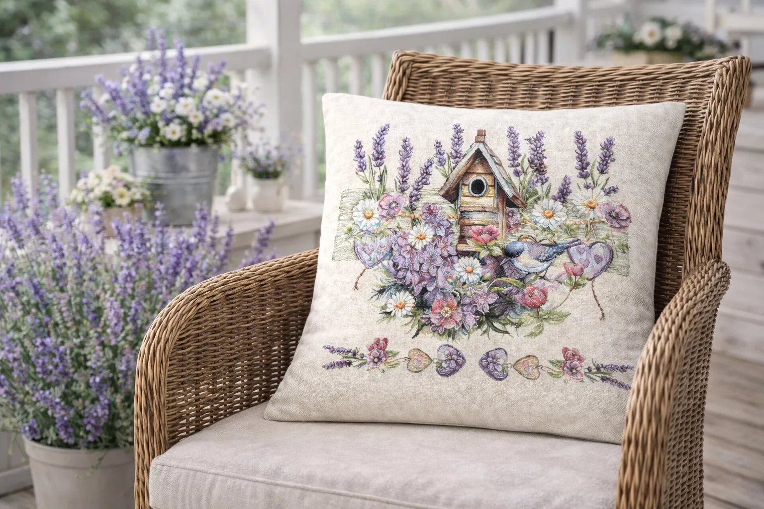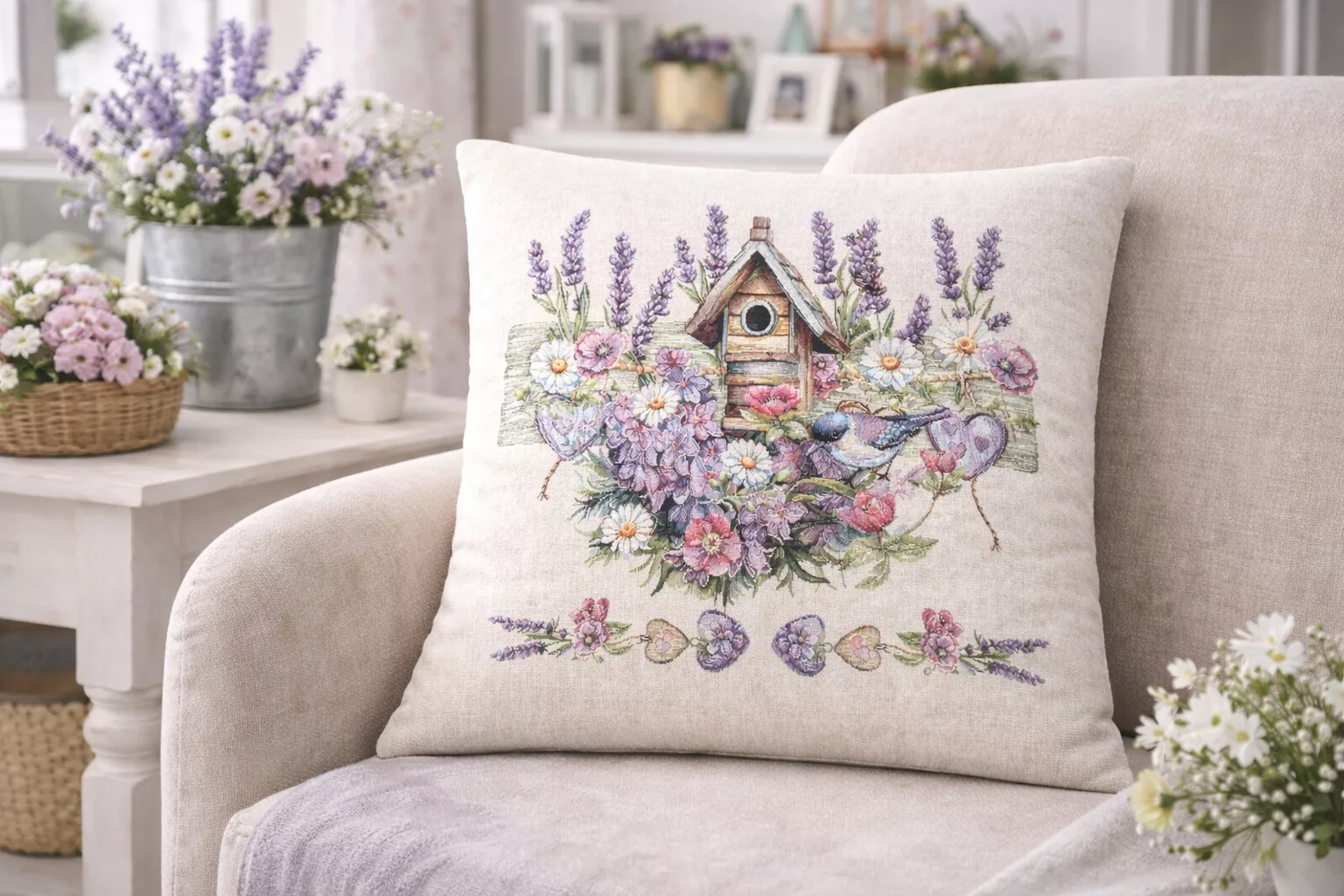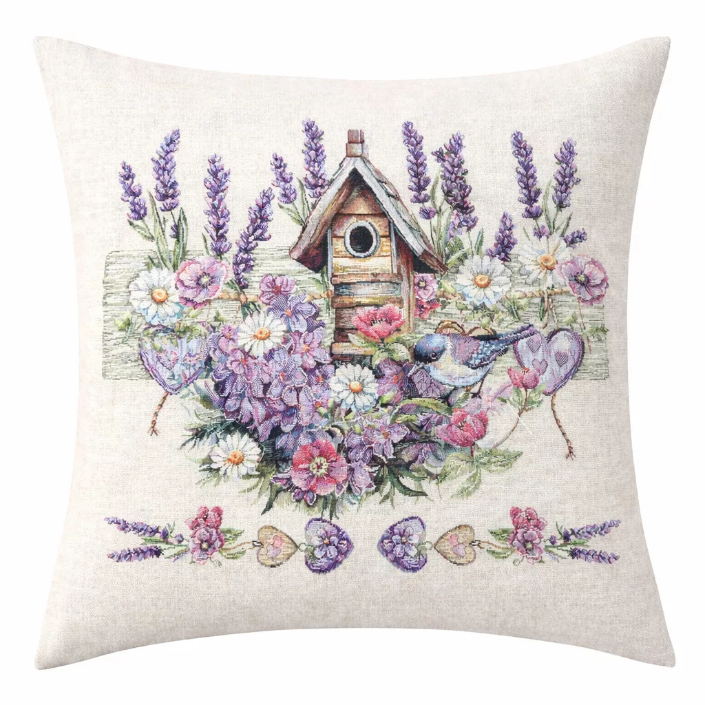 Ez a különleges spanyol gobelin párnahuzat a klasszikus gobelin hagyományait ötvözi a modern, precíz gépi szövési technológiával. A részletgazdag minta levendulavirágokat, vadvirágokat, egy bájos madárkát és egy rusztikus madáretetőt ábrázol, amely harmonikus, természetközeli és romantikus hangulatot visz az otthonba.