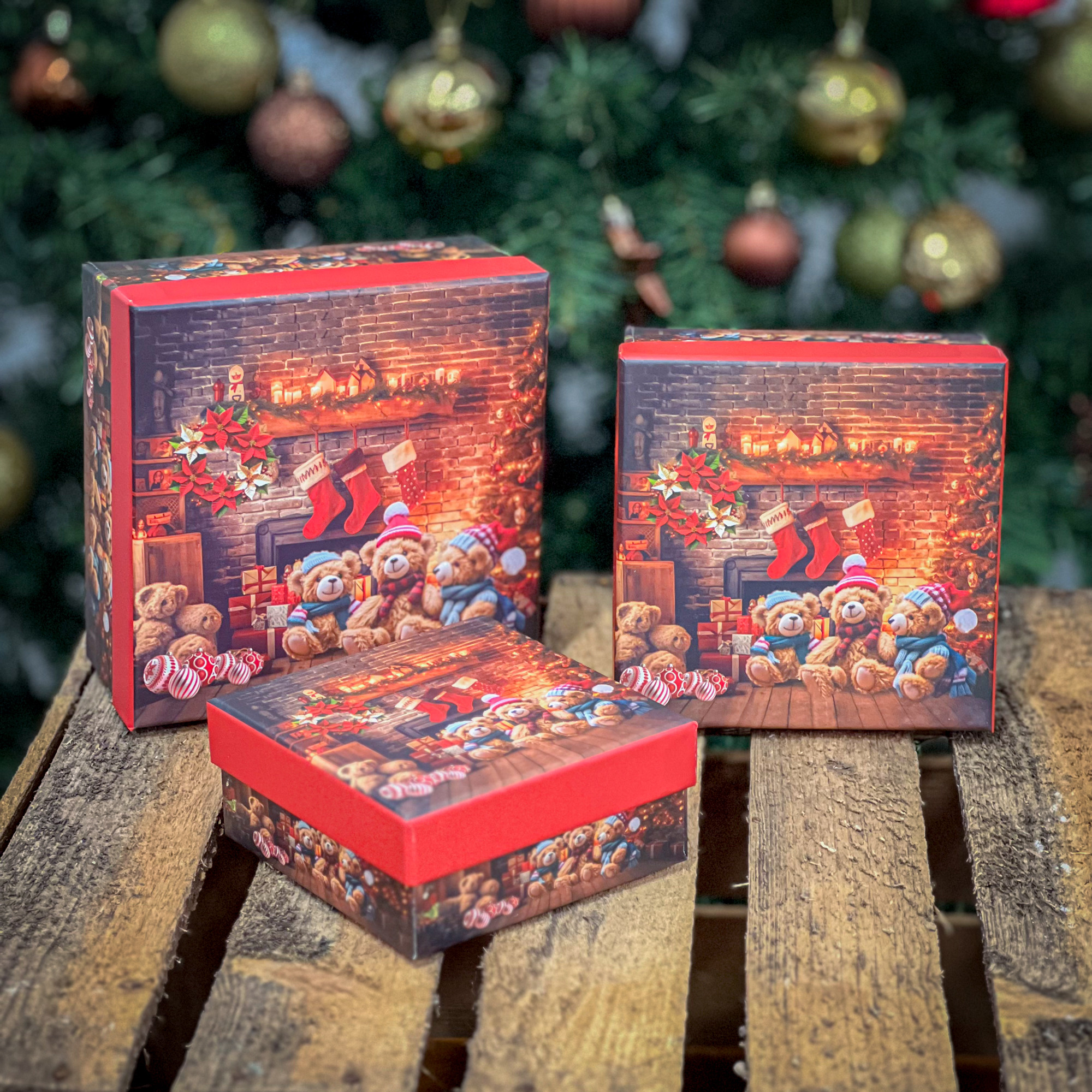 3 db-os ajándékdoboz szett ünnepi mackós mintával. A dobozok minden oldala gyönyörű karácsonyi mintával van beborítva. Masszív, vastag anyagból készült termékek.