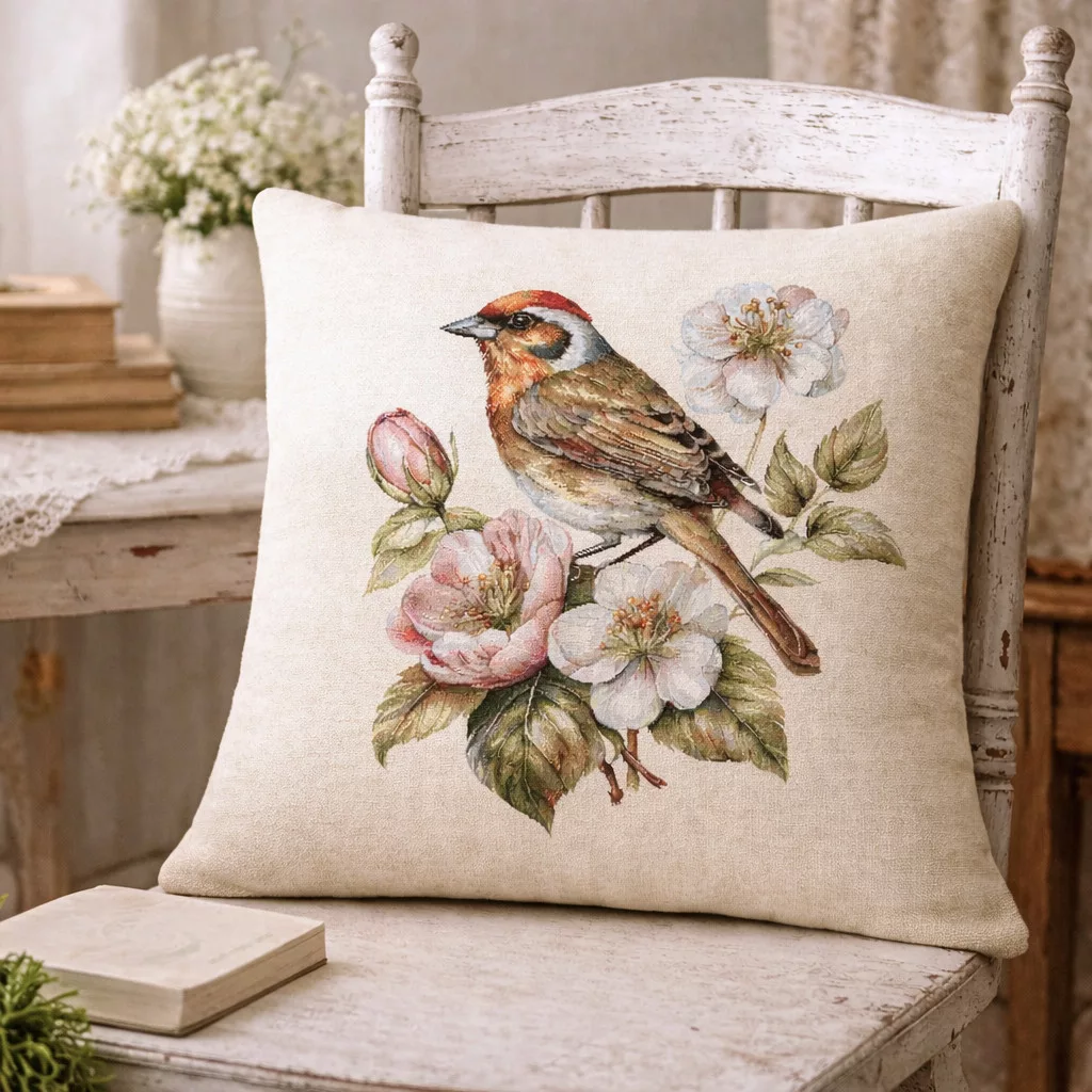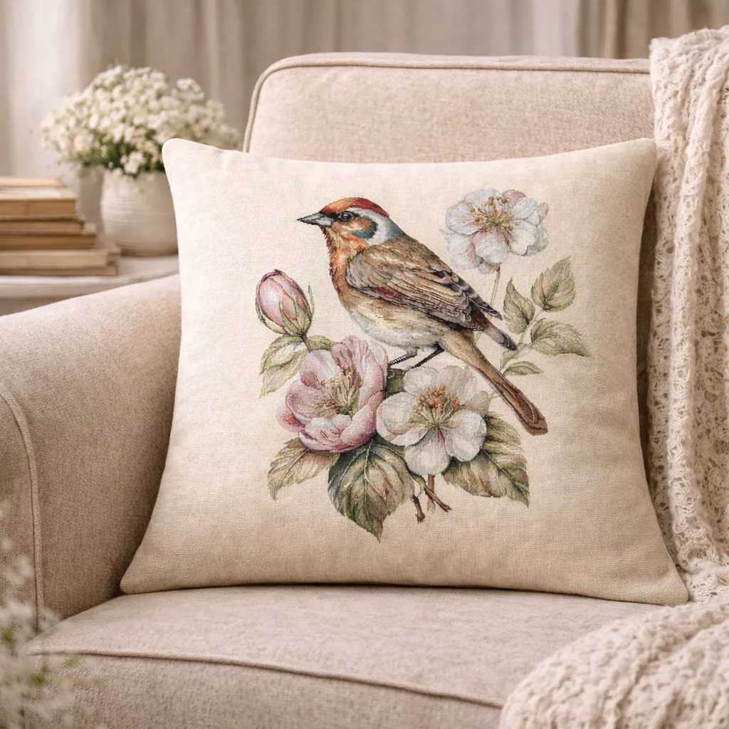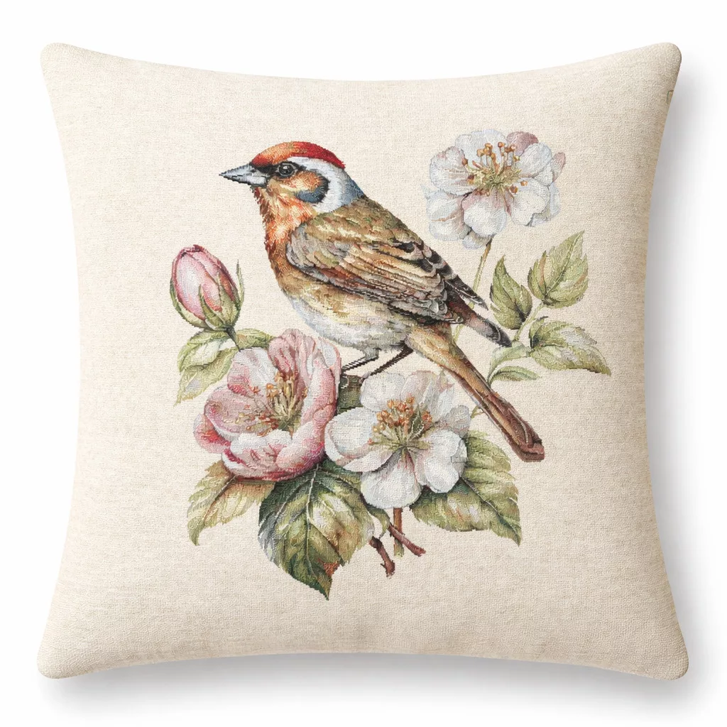 Elegáns gépi szövésű gobelin díszpárna huzat finoman kidolgozott madármotívummal és virágos mintával. A természet ihlette design meleg, otthonos hangulatot teremt a nappaliban vagy a hálószobában. A részletgazdag mintán egy finom rajzolatú madár jelenik meg a virágos ágakon, meleg színekkel.