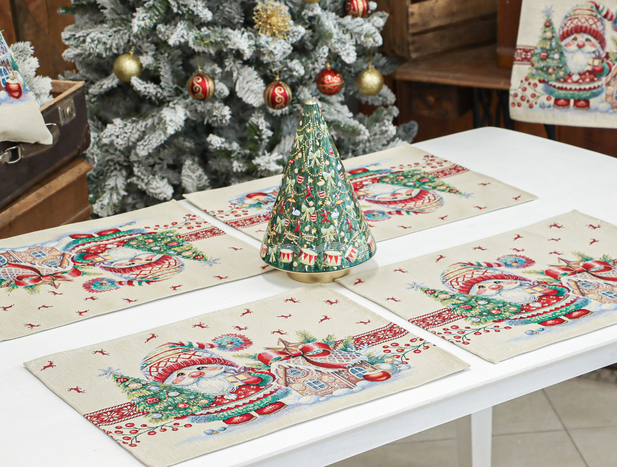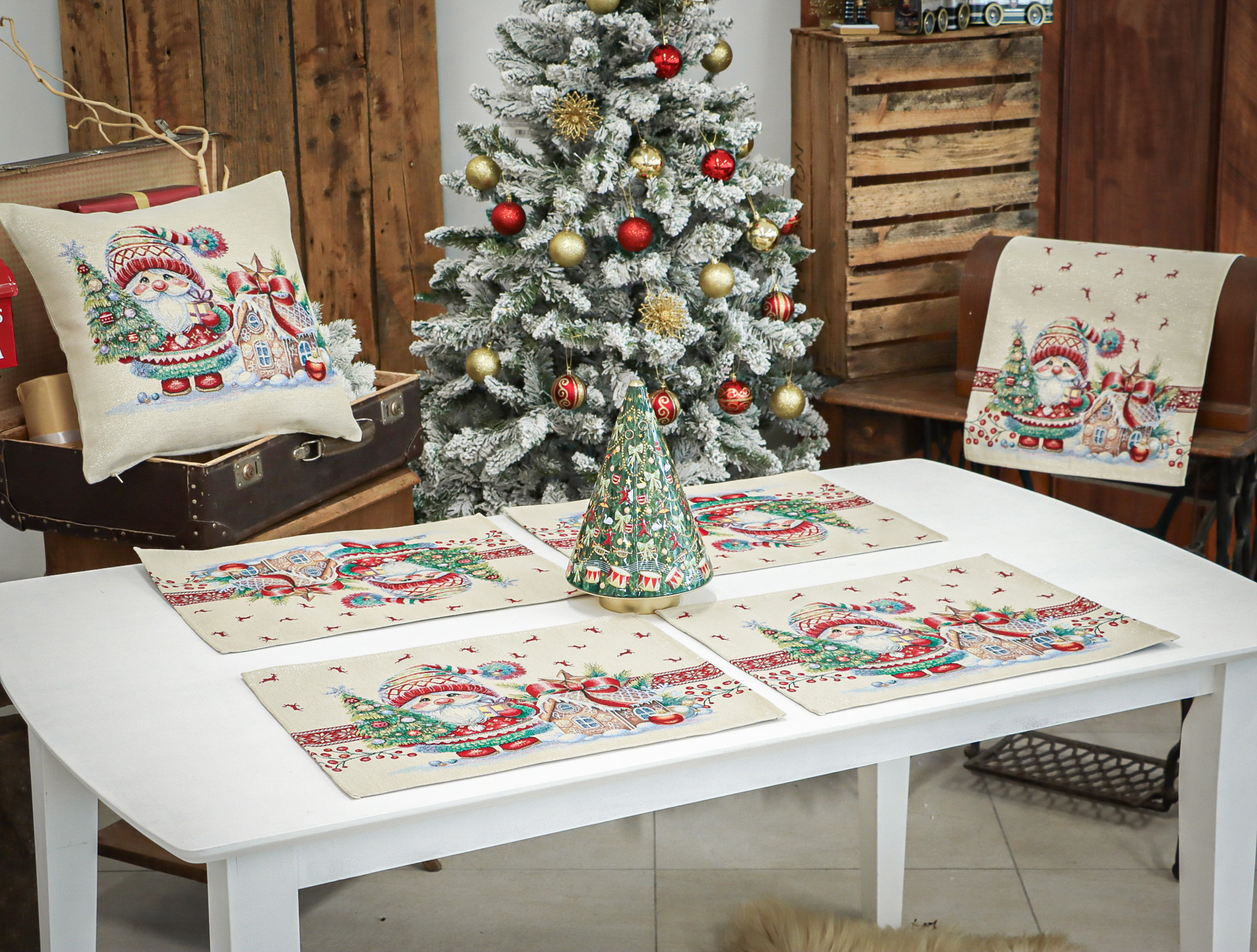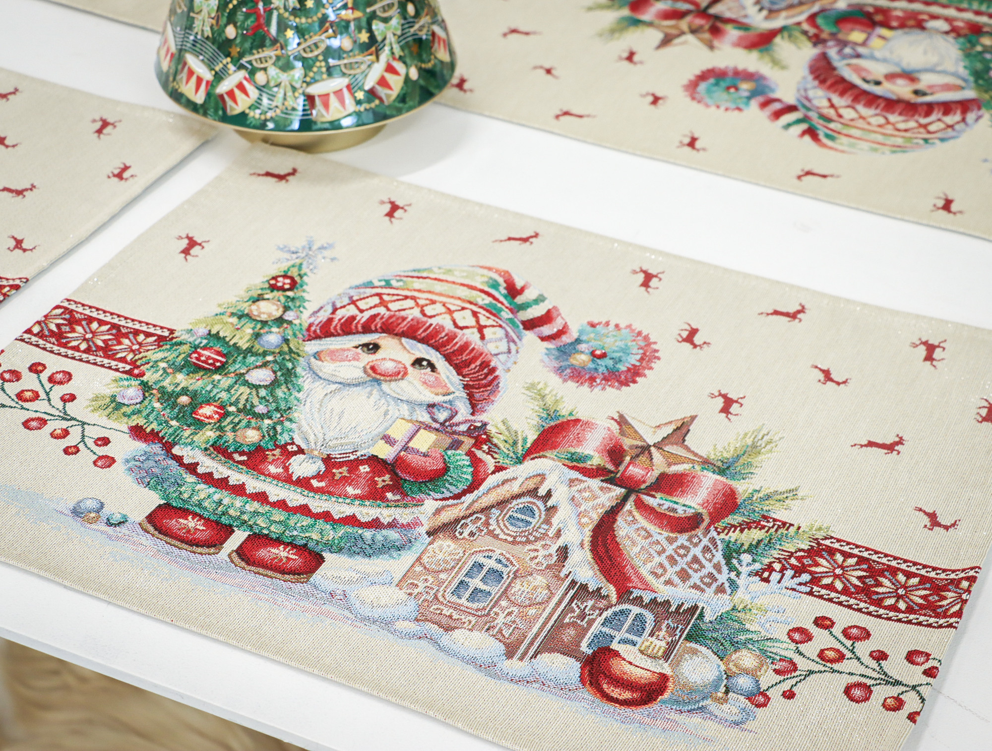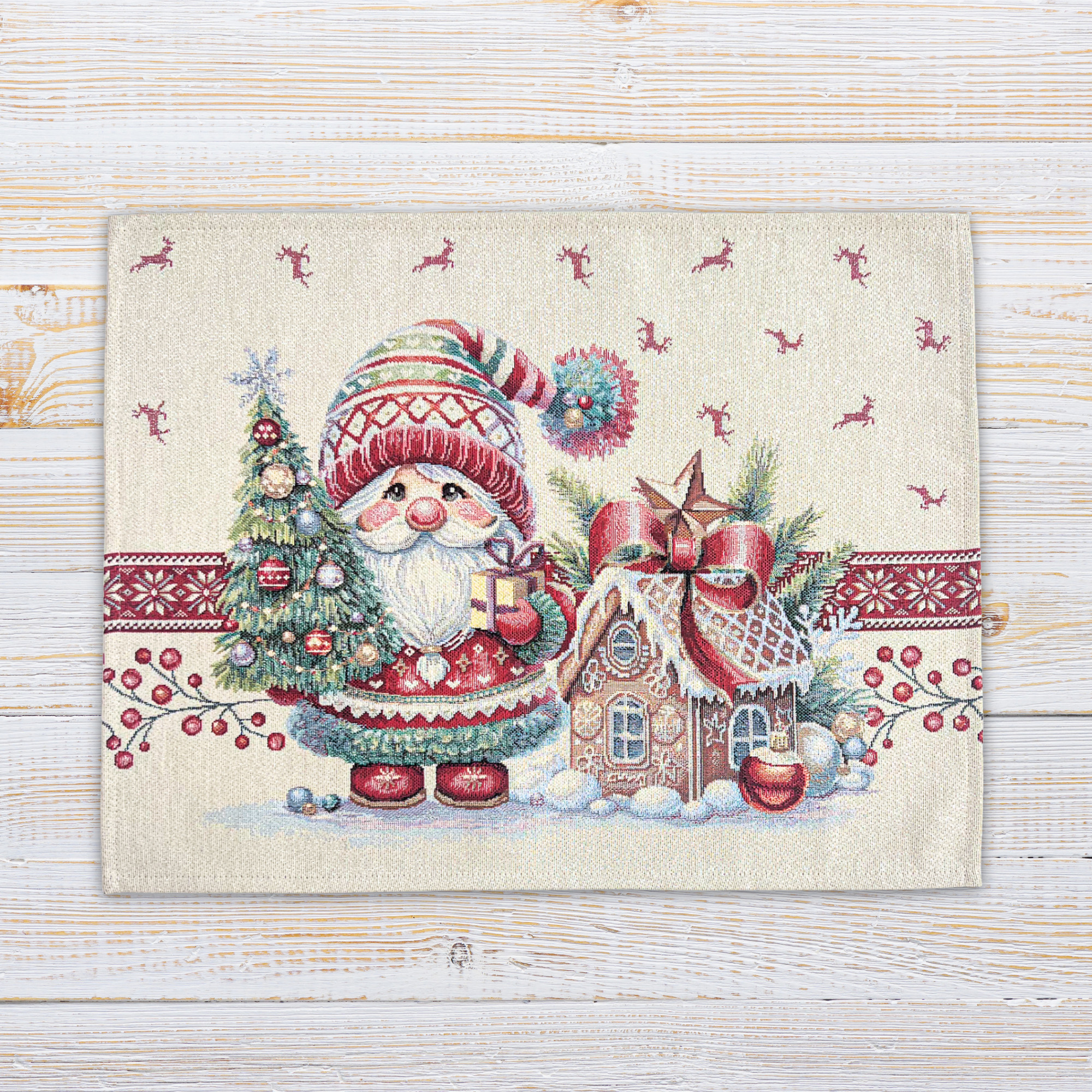 Teremts varázslatos ünnepi hangulatot az asztalnál ezzel az ezüstös csillogású, manós tányéralátéttel! A kedves, piros-zöld ruhás manó, a feldíszített karácsonyfa és a szalaggal átkötött mézeskalács házikó igazi mesebeli látványt nyújt. Ez a prémium minőségű, gépi szövésű spanyol gobelin tányéralátét tartós, vastag anyagból készült, így egyszerre dekoratív és praktikus választás. Segít megvédeni az asztalt a szennyeződésektől és a karcolásoktól, miközben ünnepi díszbe öltözteti a terítéket.