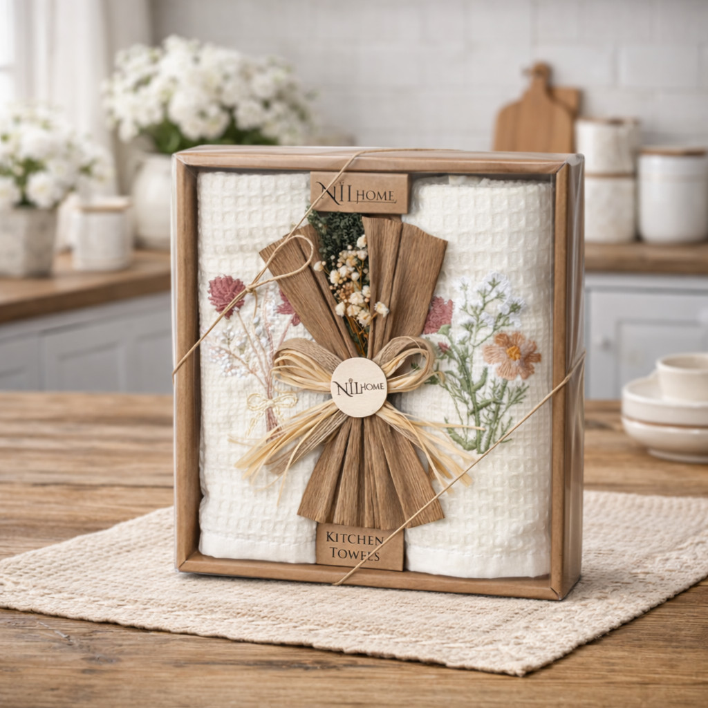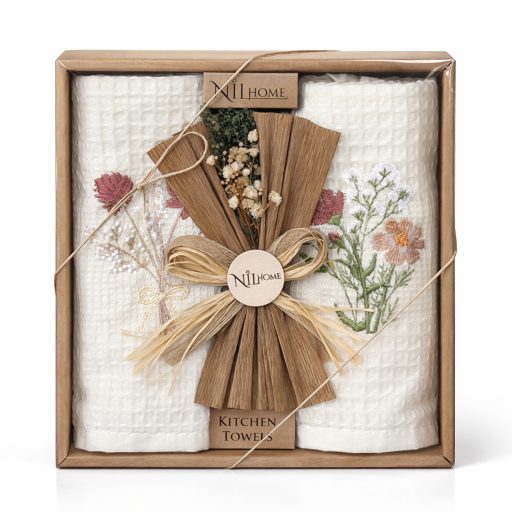 A díszdobozos szett 2 db egyforma méretű, gofri mintázatú, mezei virágokkal dekorált konyharuhát tartalmaz. Tökéletes ajándék lehet minden alkalomra. Hétköznapi használatra is megfelelő, jó nedvszívó képességekkel rendelkező termék.