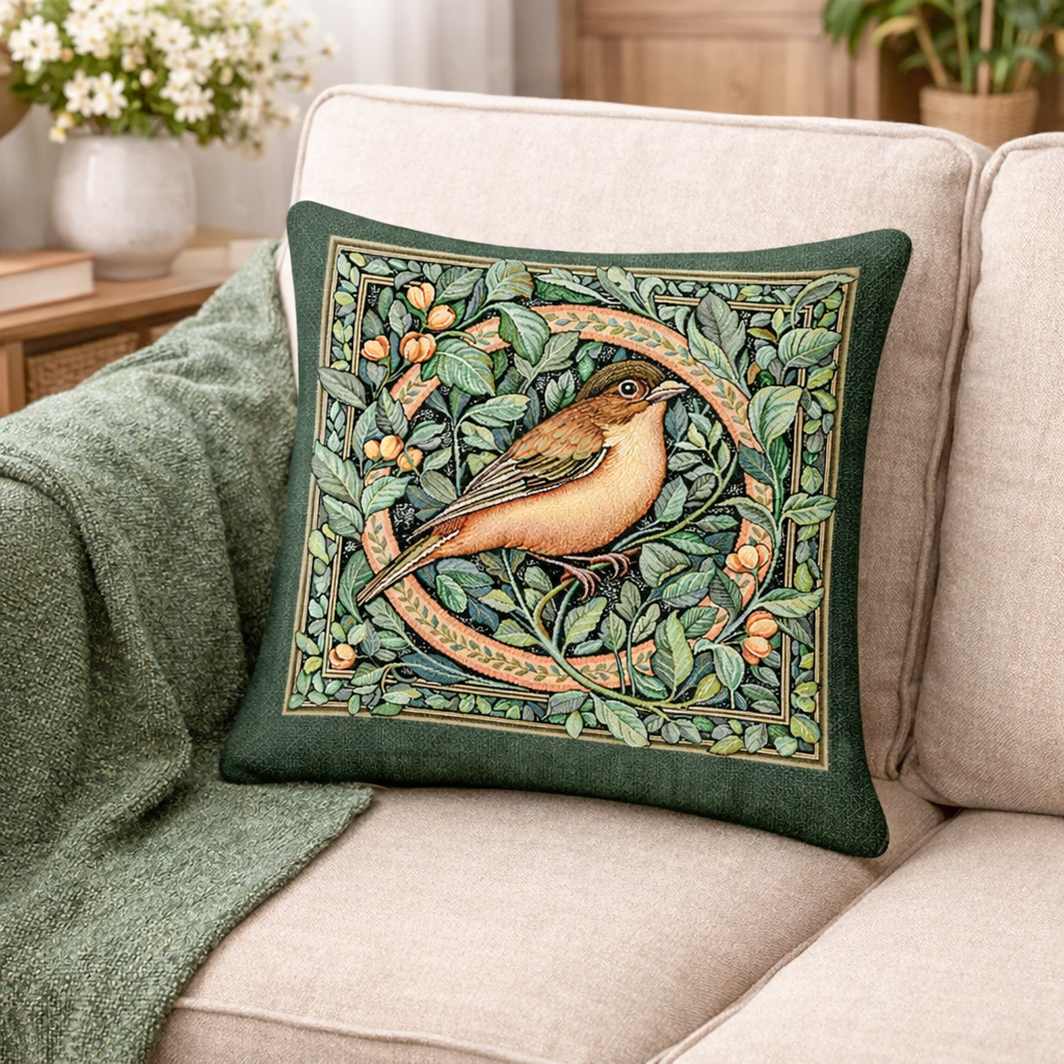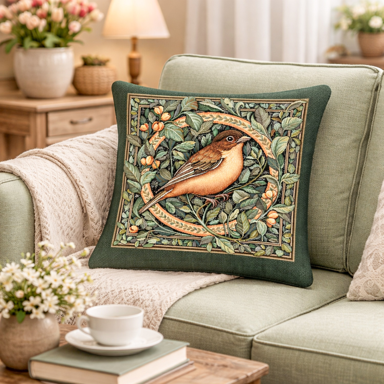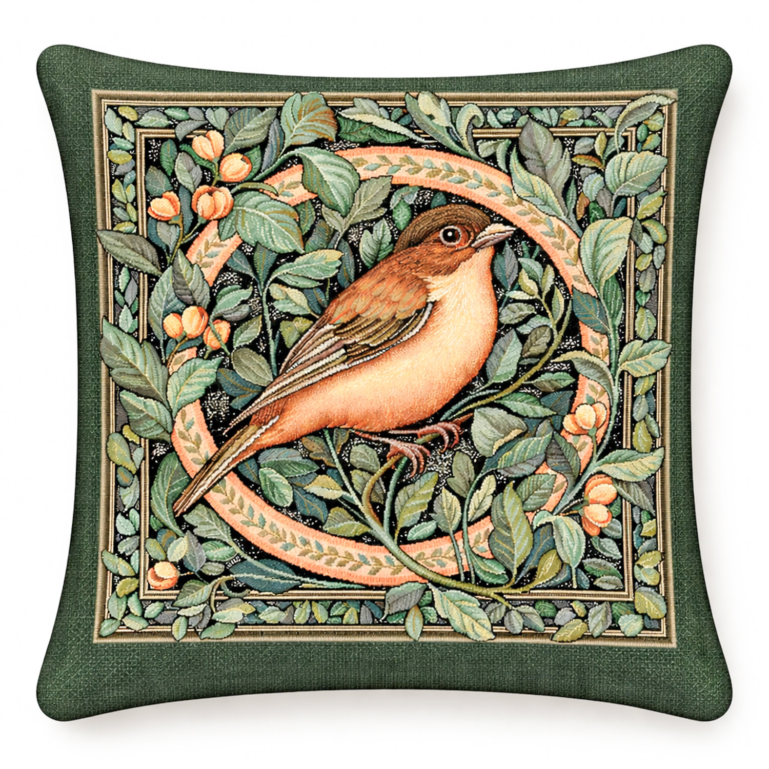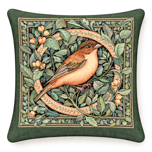 Elegáns gépi szövésű gobelin díszpárna huzat finoman kidolgozott madármotívummal és gazdag növényi mintával. A természet ihlette design meleg, otthonos hangulatot teremt a nappaliban vagy a hálószobában. A részletgazdag mintán egy finom rajzolatú erdei madár jelenik meg sűrű, zöld lomb között, meleg földszínekkel és elegáns keretezéssel.