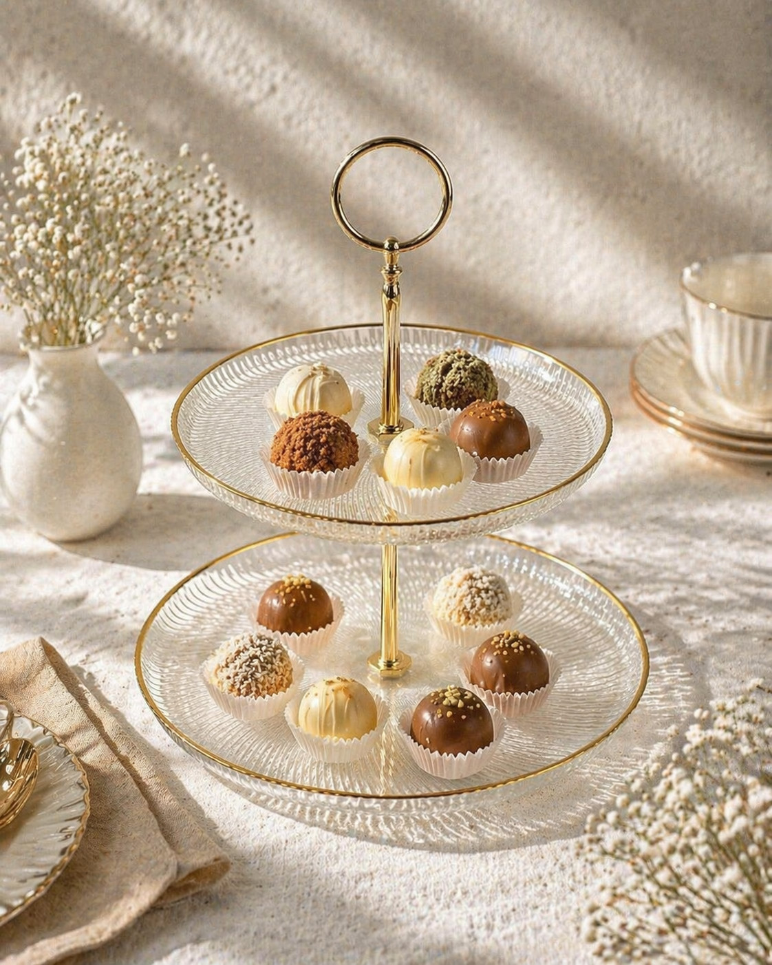 A kétszintes kialakításnak köszönhetően praktikus és dekoratív választás cukorkák, aprósütemények, bon-bon vagy sós falatok tálalásához. Az arany színű fém fogantyú még elegánsabbá teszi a megjelenést, és könnyű mozgatást biztosít.