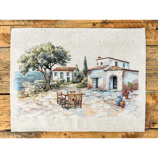 Ez a különleges, gépi szövésű spanyol gobelin tányéralátét egy mediterrán tengerparti falucska hangulatát hozza el az asztalodra. A mintán kőburkolatos terasz, olajfa és rusztikus kerti bútorok jelennek meg, mintha csak egy görög nyaralás pillanatait idéznék. Tartós, mosógépben mosható anyagból készült. Tökéletes választás hétköznapi vagy alkalmi terítékekhez, és kiválóan passzol mediterrán, vintage vagy természetes stílusú enteriőrökhöz.