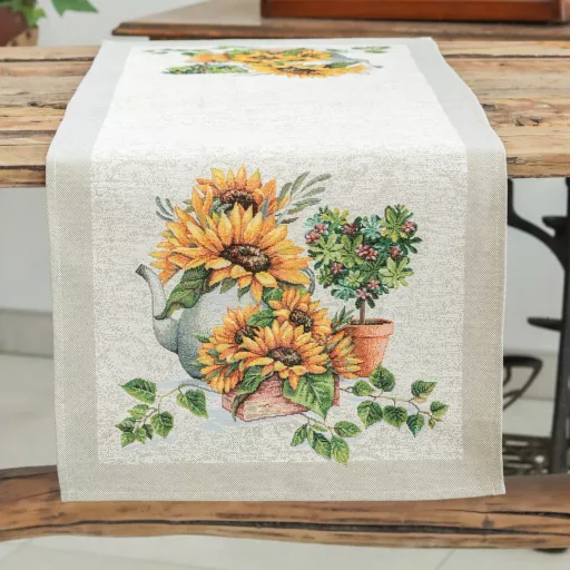Napraforgókkal dekorált gépi gobelin asztali futó, amely a megfelelő kezelés mellett hosszú éveken át megőrzi színét és minőségét.