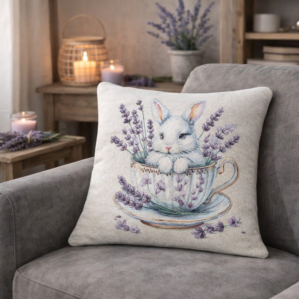 Gépi szövésű spanyol gobelin párnahuzat – levendulás, nyuszis romantikus design