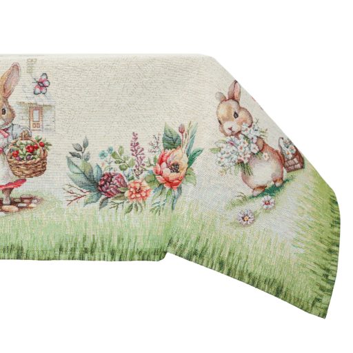 Varázsolj tavaszias hangulatot otthonodba ezzel a bájos húsvéti asztalterítővel! A természet ihlette, gyönyörű színekben pompázó textília kedves nyuszifigurákkal, tavaszi virágokkal és vidám pillangókkal díszített. A részletgazdag minta és a zöld fűhatású keret rusztikus, vintage stílust kölcsönöz az asztalnak.