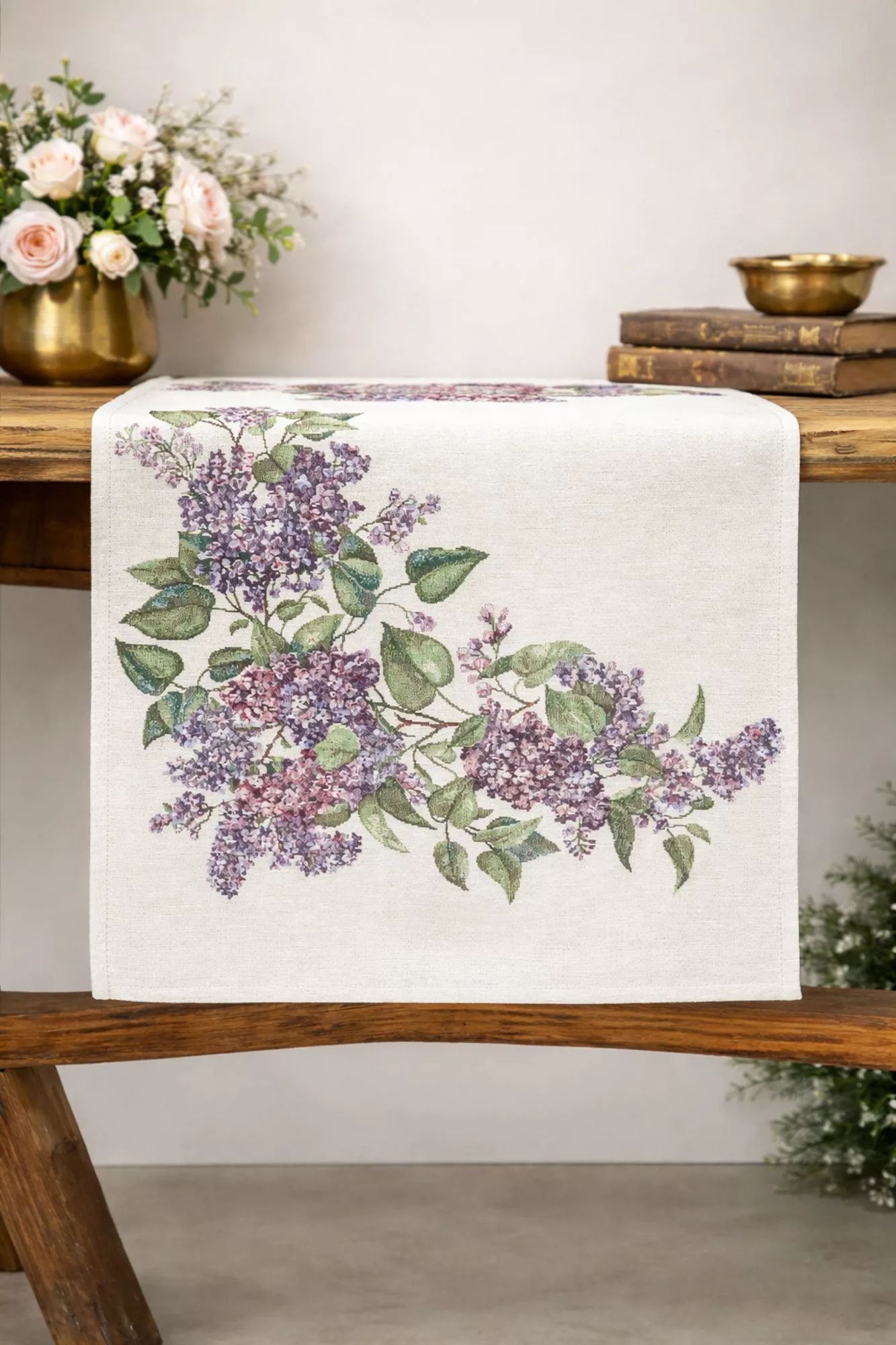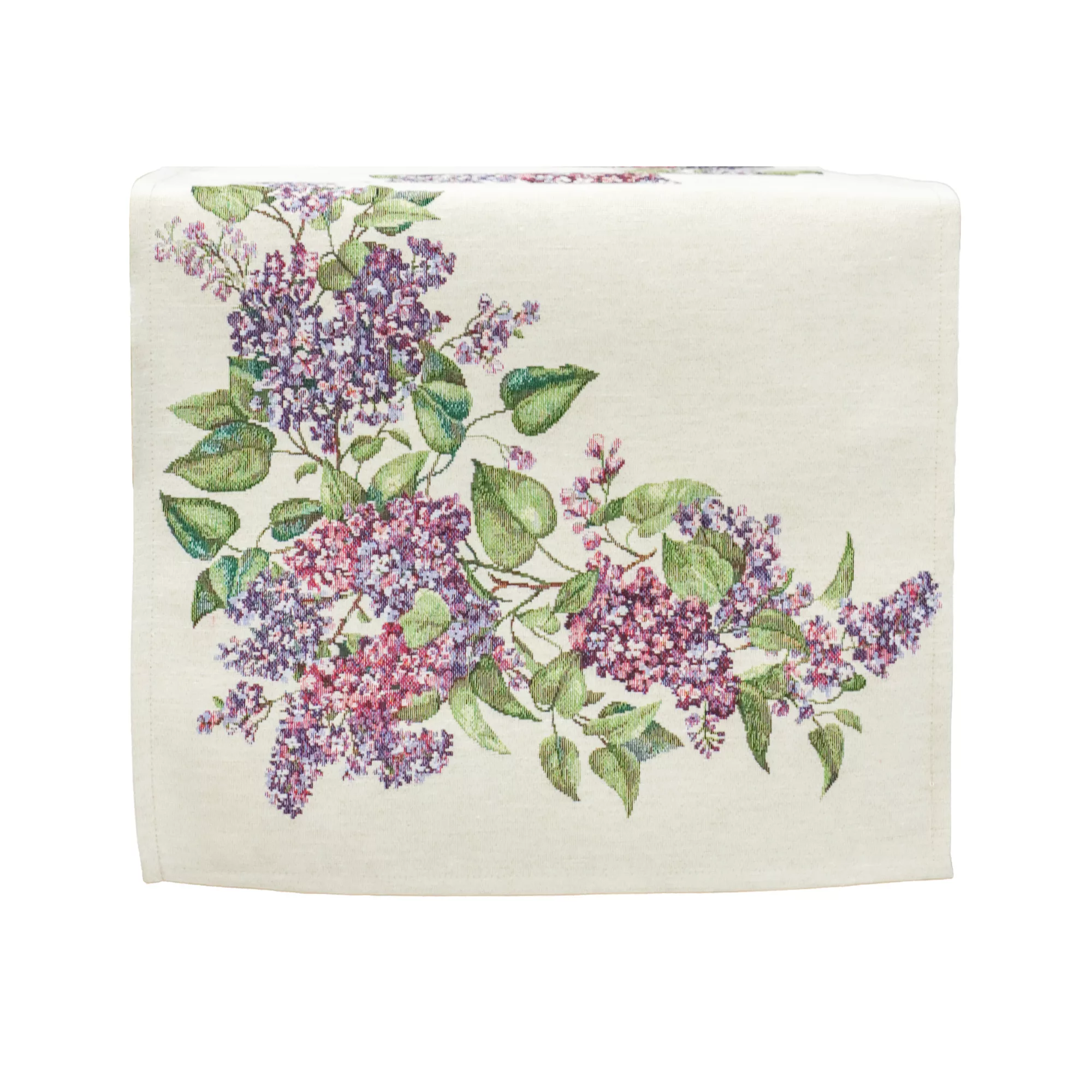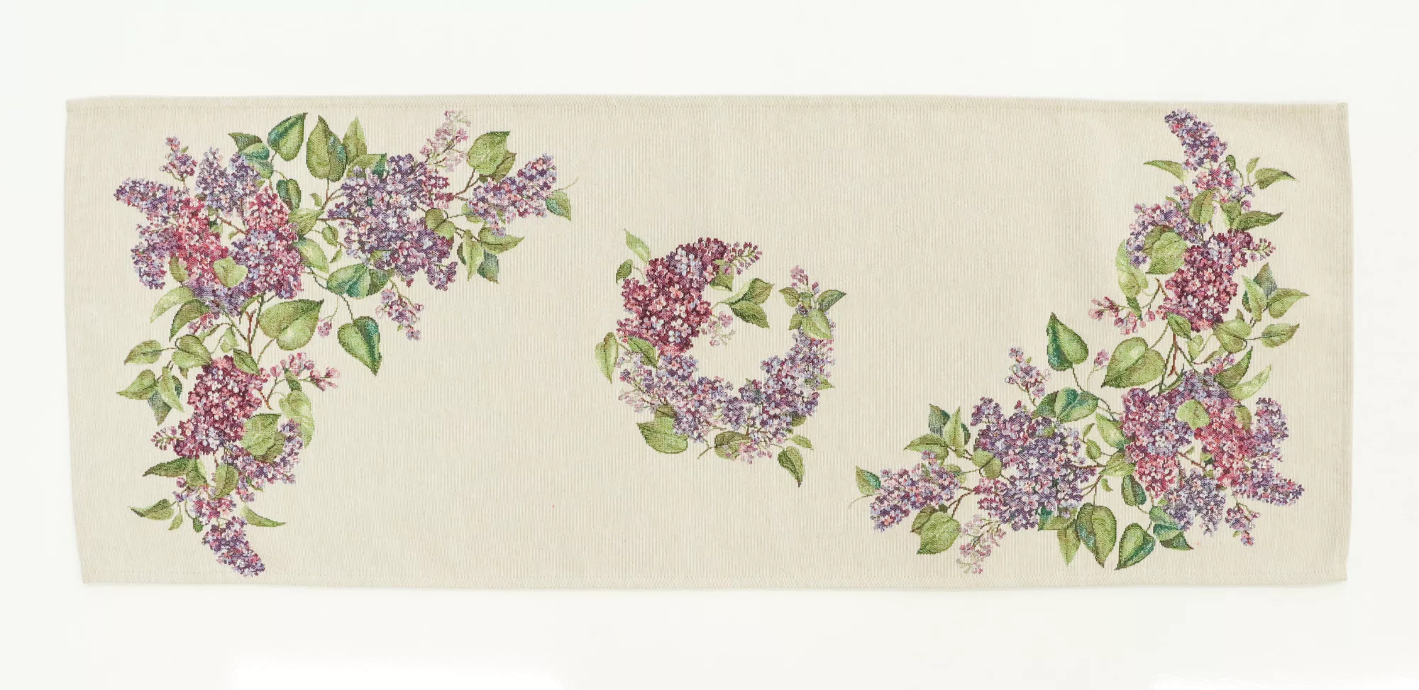 Ez a különleges spanyol gobelin asztali futó a klasszikus gobelin megjelenést ötvözi a modern, precíz gépi szövési technológiával. A részletgazdag minta virágzó orgonaágakat ábrázol finom lila árnyalatokkal és természetes zöld levelekkel, amelyek harmonikus, nyugodt és elegáns hangulatot visznek az étkezőbe vagy a nappaliba.