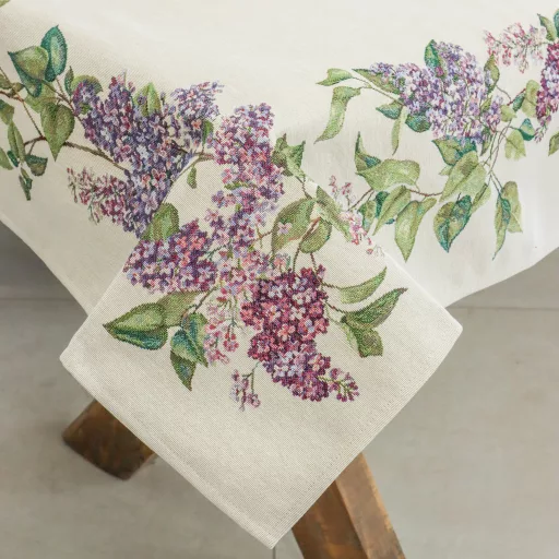 A részletgazdag minta virágzó orgonaágakat ábrázol, finom lila árnyalatokkal és természetes zöld levelekkel, amelyek harmonikus, nyugodt és elegáns hangulatot visznek az otthonba.