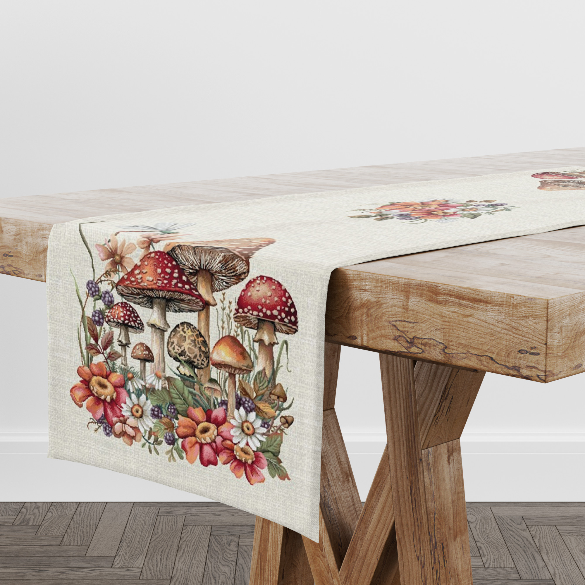 Őszi gombás, virágos asztali futó, 44x140 cm
