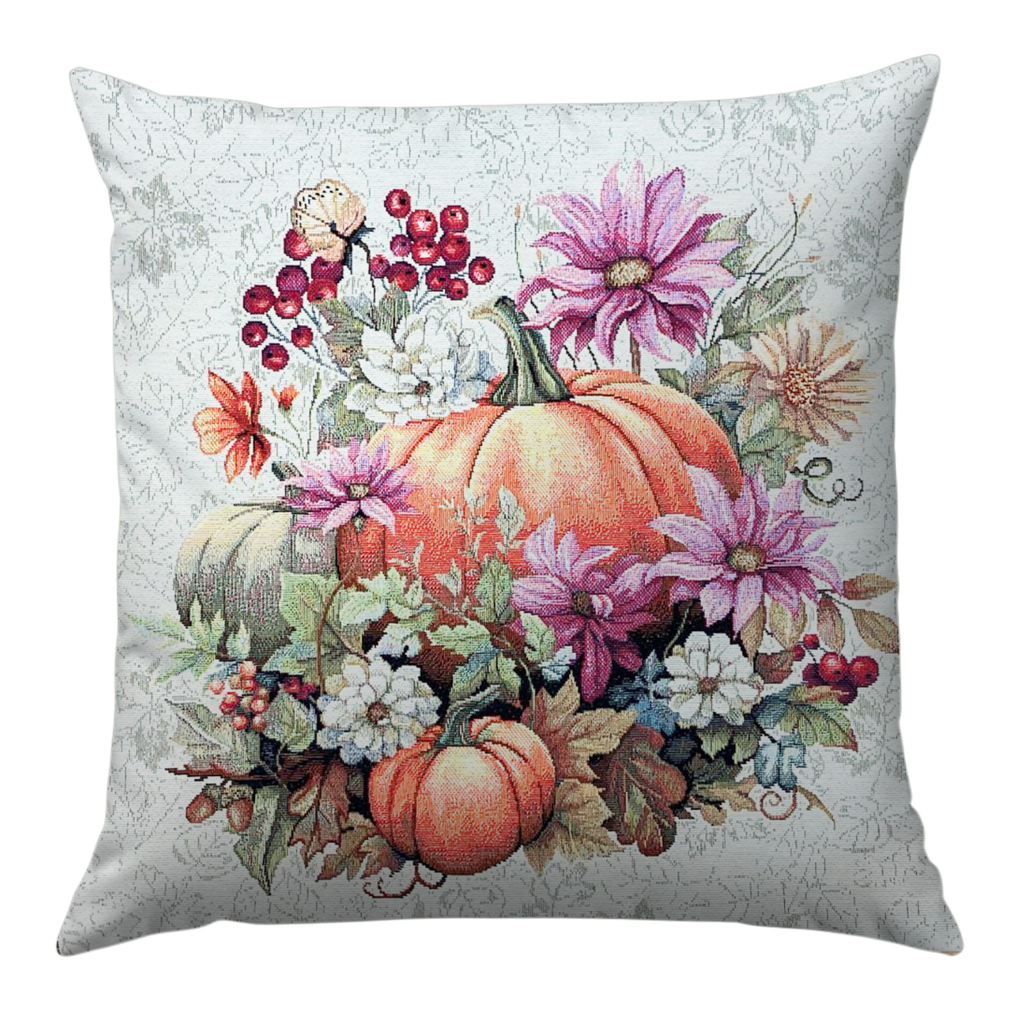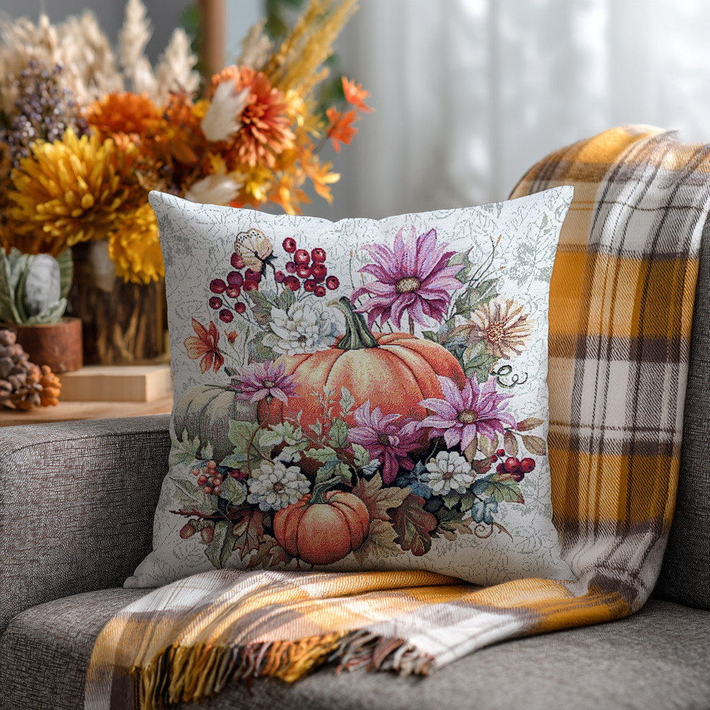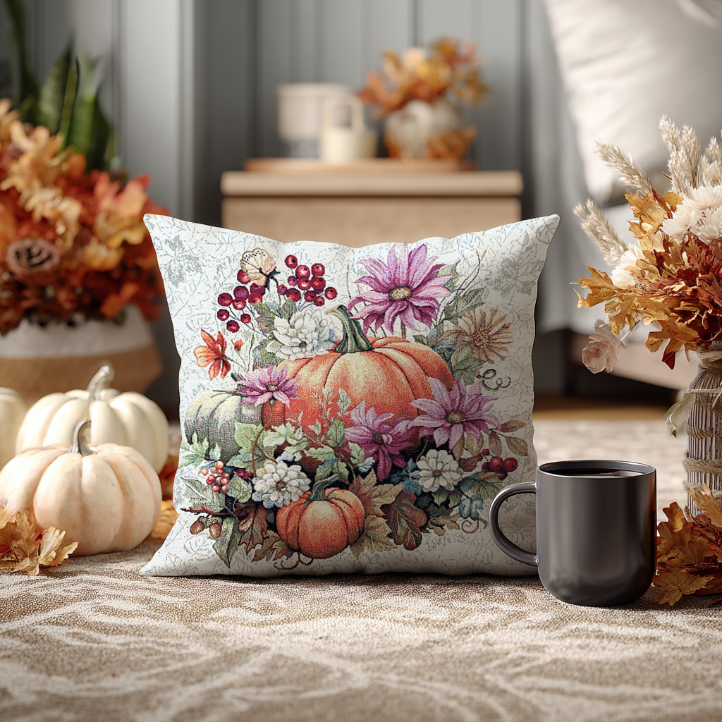 Őszi narancssárga tökös, virágos díszpárna huzat