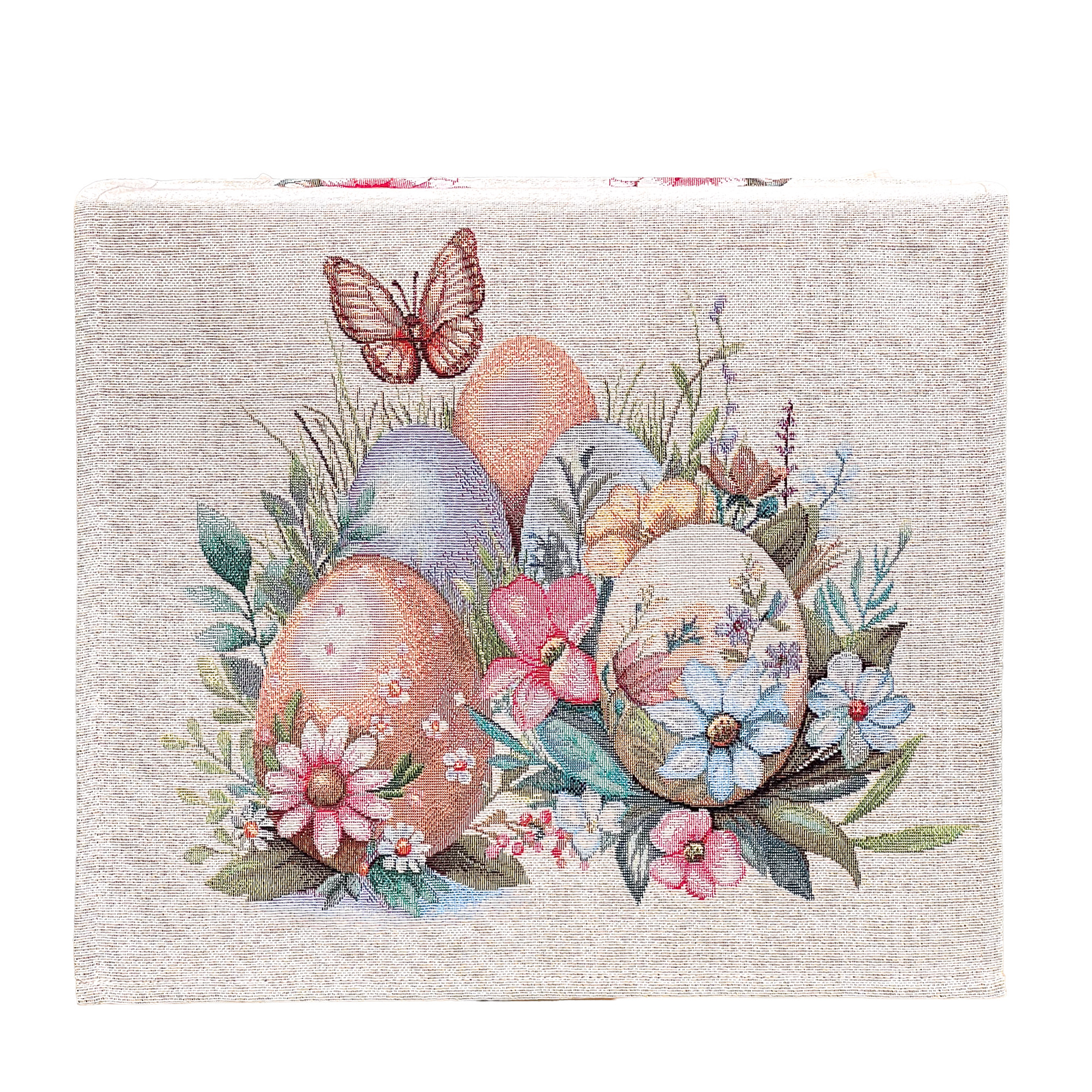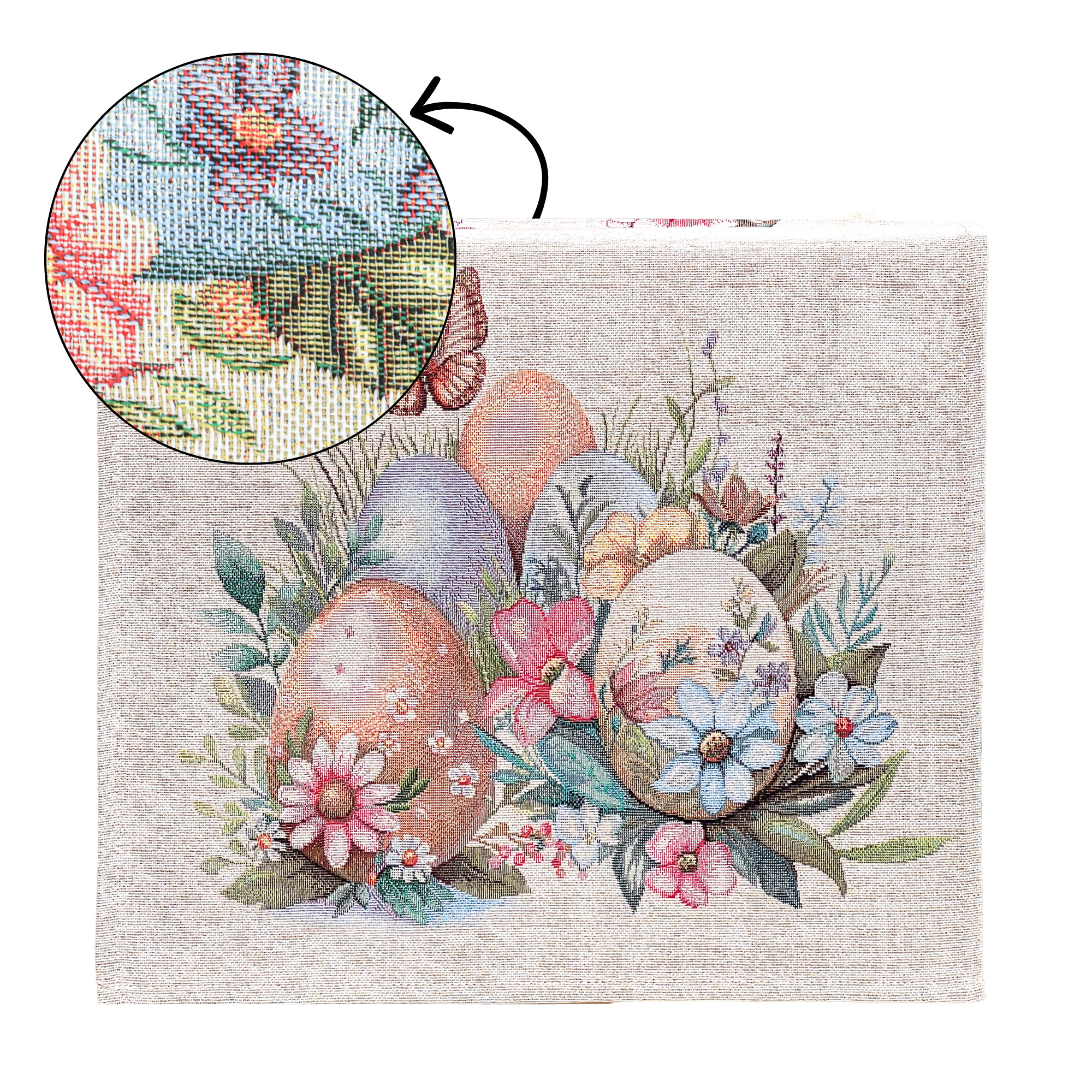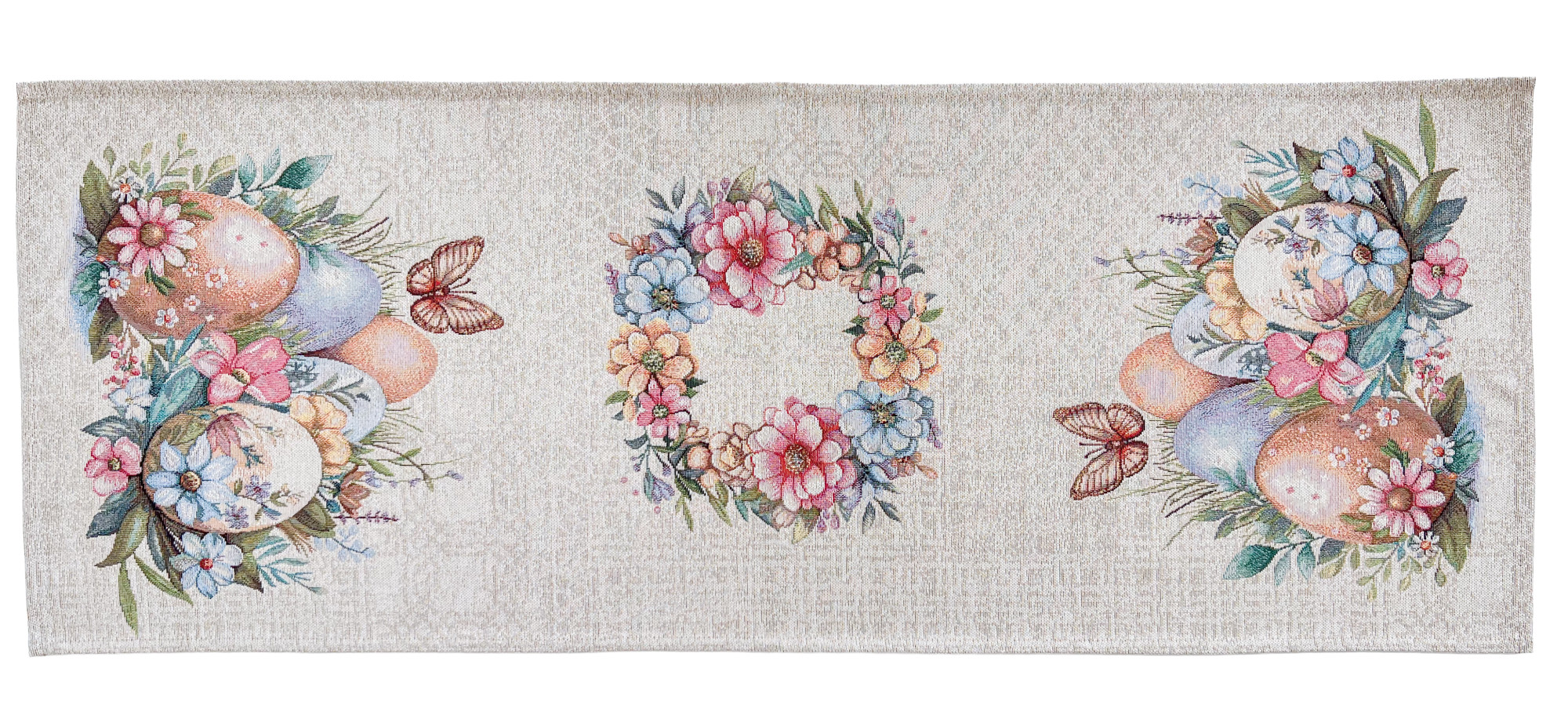 Ez a különleges spanyol gobelin asztali futó a klasszikus gobelin megjelenést ötvözi a modern, precíz gépi szövési technológiával. A részletgazdag minta festett hatású húsvéti tojásokat, tavaszi virágokat, zöld növényi elemeket és finom pillangó motívumokat ábrázol, amelyek meghitt, ünnepi és természetközeli hangulatot visznek az otthonba.