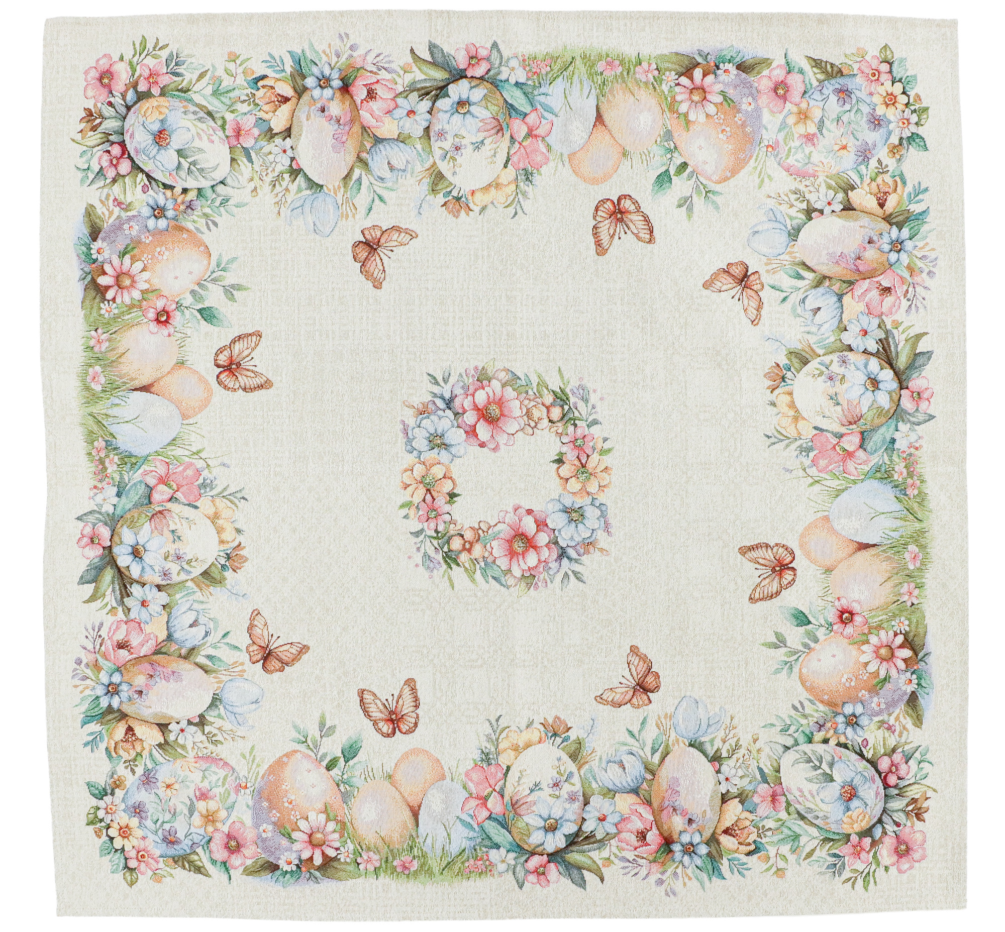 Ez a különleges spanyol gobelin asztali futó és asztalterítő a klasszikus gobelin megjelenést ötvözi a modern, precíz gépi szövési technológiával. A részletgazdag minta festett hatású húsvéti tojásokat, tavaszi virágokat, zöld növényi elemeket és finom pillangó motívumokat ábrázol, amelyek meghitt, ünnepi és természetközeli hangulatot visznek az otthonba.